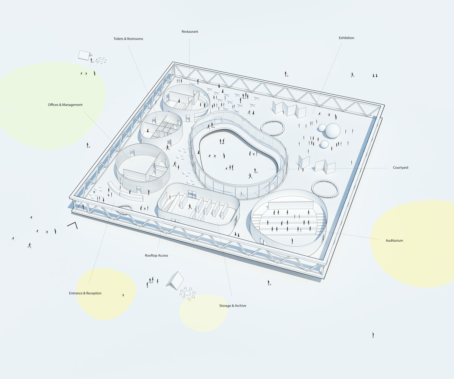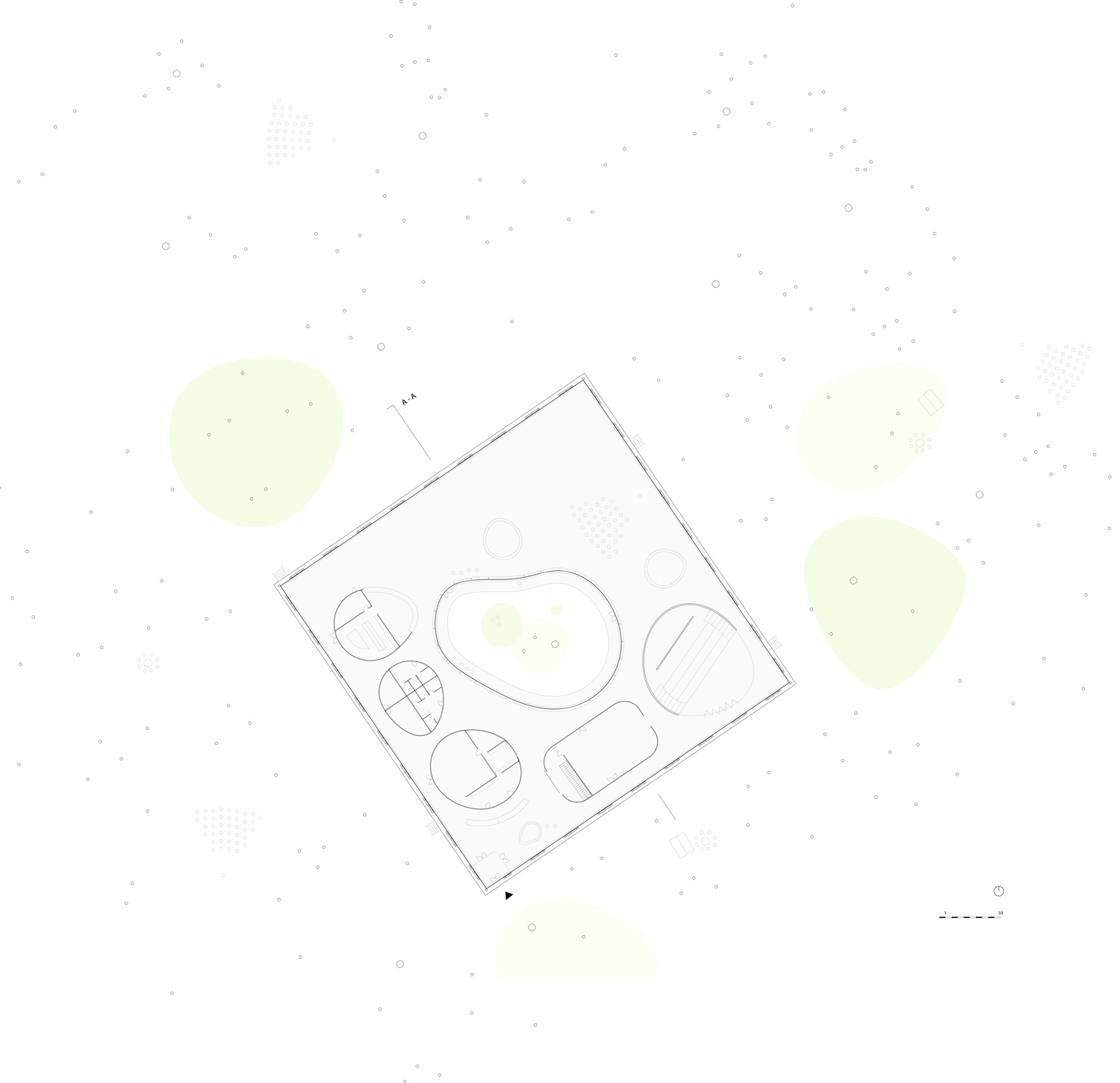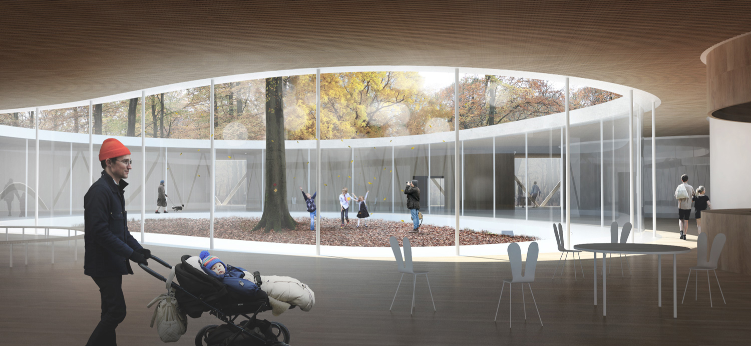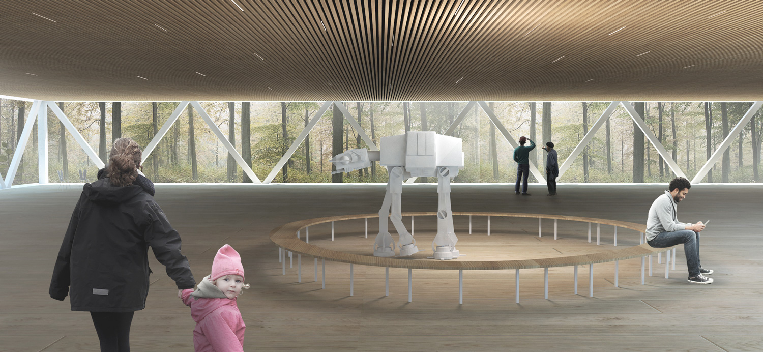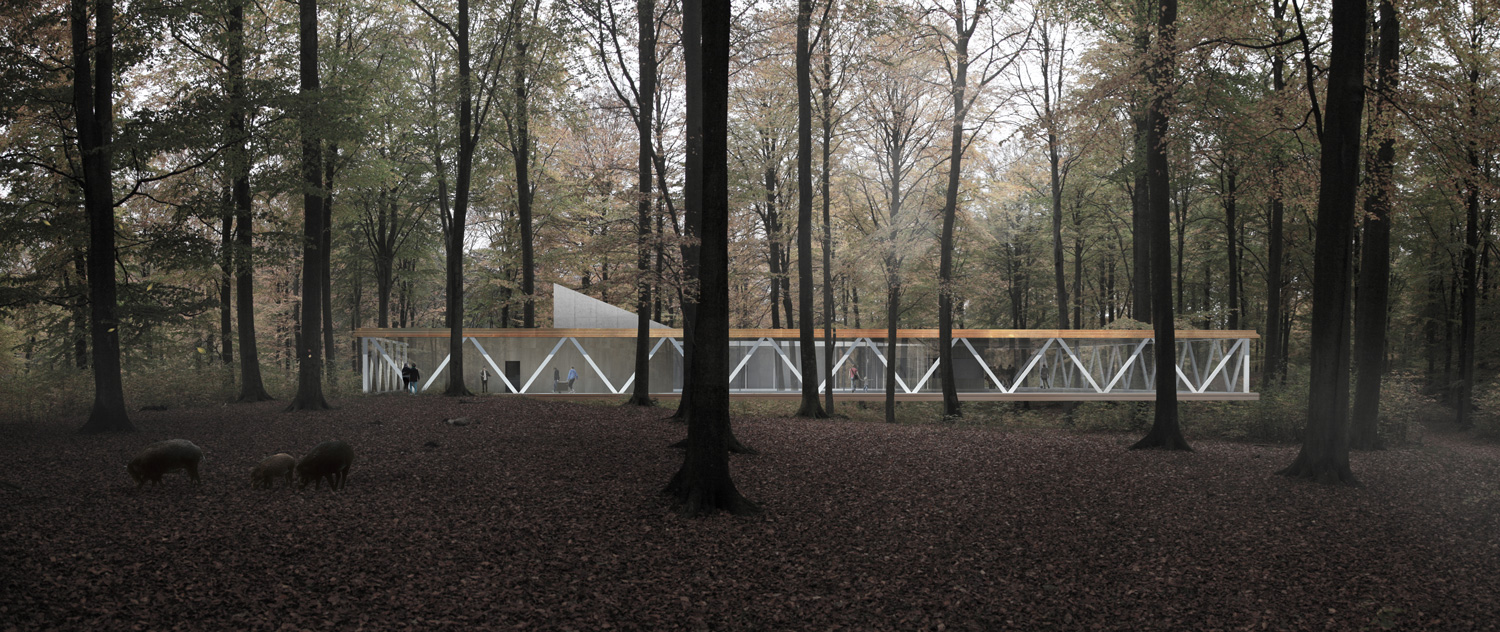 Placing a building with a strong aesthetic in the woodlands of Bokskogen clearly communicates what is man made and what is not. The two counterparts, the building and the forest, create a stark contrast and emphasises on the qualities of Bokskogen and it’s remarkable woodland. The building diverters your focus towards the forest and makes you aware of your surroundings. The buildings program is arranged around a central courtyard and it consists of a large exhibition space that can be divided in several smaller spaces, restaurant, auditorium, reception, office space for the staff and an enclosed storage space that also can house conferences and smaller exhibitions. The buildings inside reflects the organic shapes of the forest with it’s lingering paths and the building envelop creates a distinct contrast to the surrounding landscape.