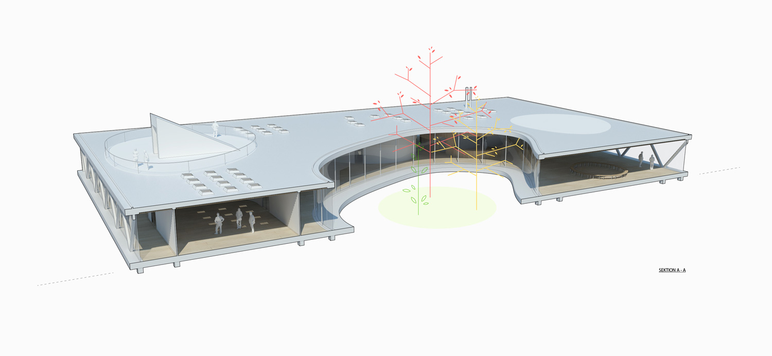 ☉ Bokskogen Visitor Center is a proposal by Robert Janson designed in 2014. It is located in Bara Sweden in a forest setting. Its scale is small. Key materials are metal and wood. Concepts such as nature stratification and courtyard are explored.
