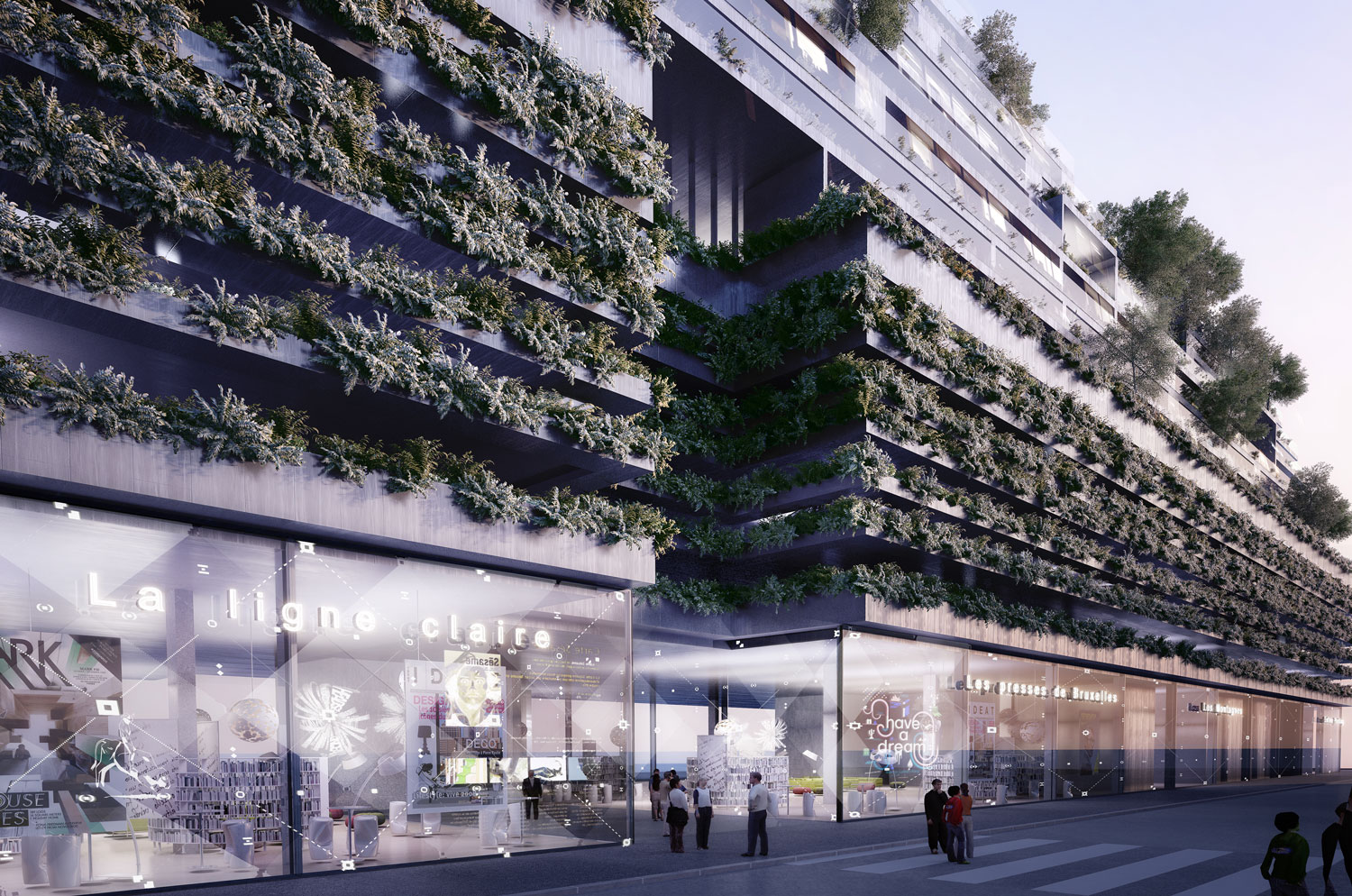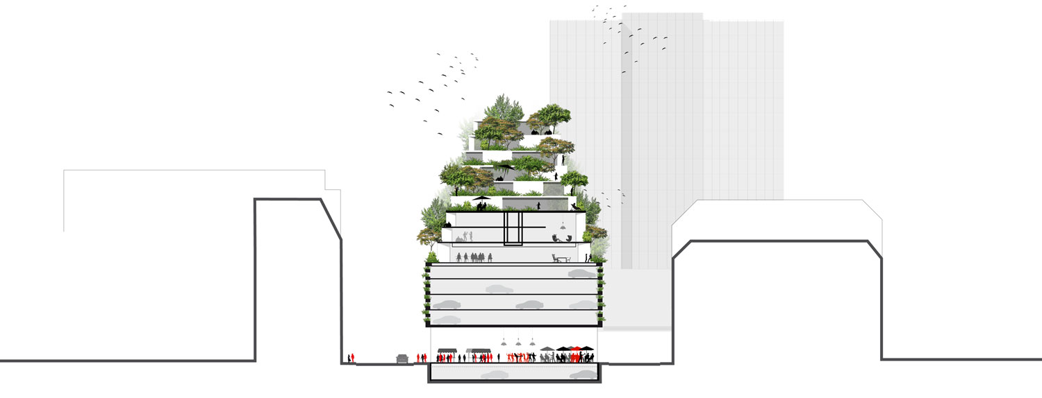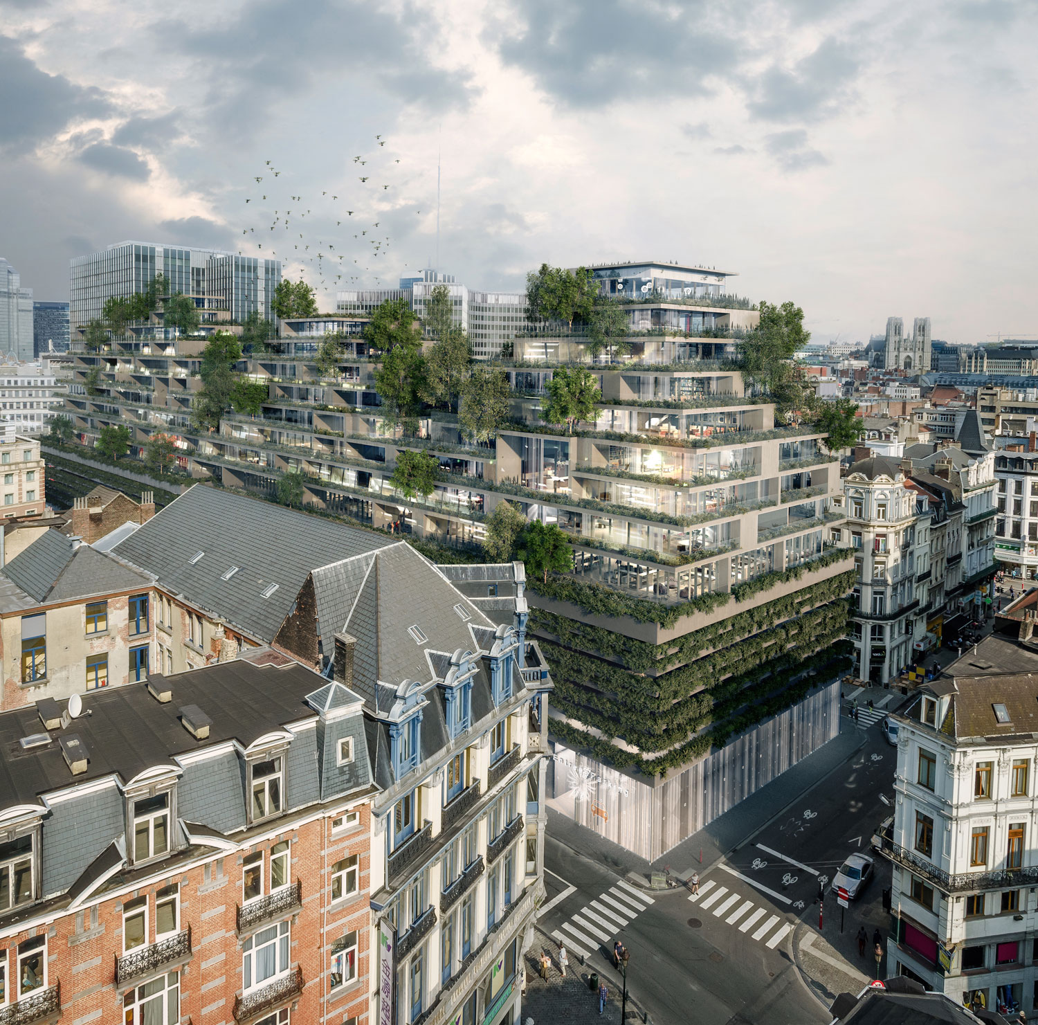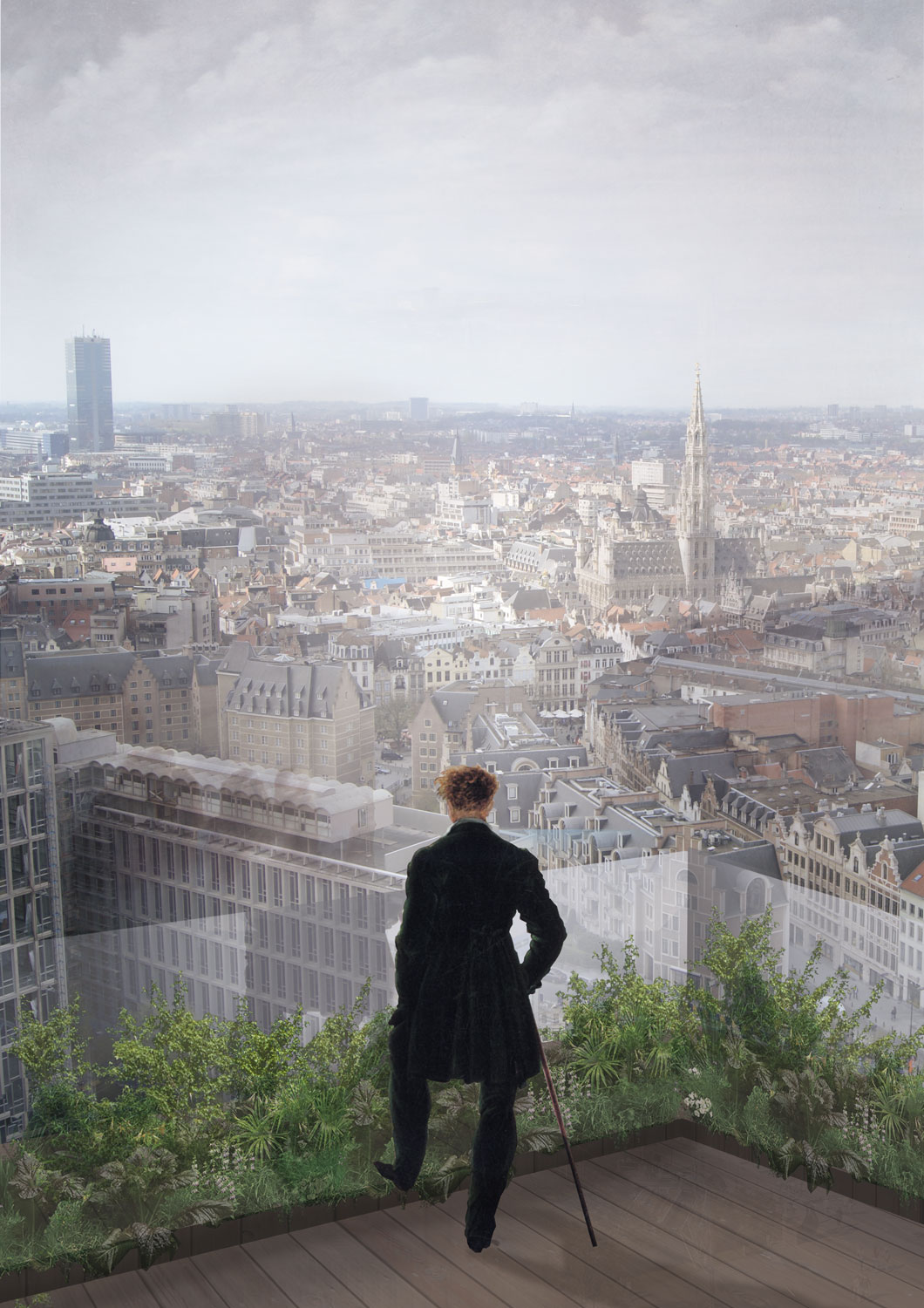 Notre projet consiste en la transformation d’un parallélépipède massif en un fragment de paysage qui propose une topographie mêlant vides et pleins dans une gestion progressive de la hauteur. La masse est découpée, sculptée, pour s’ouvrir à mesure que le bâtiment s’affine en hauteur. De vastes terrasses en rizières sont dégagées en gradinages successifs, libérant de larges terrasses et balcons non seulement plantés mais également arborés. Ce travail d’élancement par allègement progressif ouvre le profil des voies qui ceinturent notre ouvrage, laissant ainsi passer plus de lumière et d’ensoleillement au bénéfice à la fois du bâtiment et des constructions alentour pour donner tant à l’échelle du piéton que du skyline de la ville une perception moins rectiligne de notre environnement. Une nouvelle perception du bâtiment et du quartier s’affirme dans le ciel de la ville cadrant de nouvelles vues et perspectives sur le quartier et le grand paysage. Notre travail est avant tout une proposition sur la fragmentation en rupture avec le monolithisme existant. Fragmentation volumétrique, fragmentation programmatique où la mixité d’usages et leurs expressions seront données à voir comme une complexité architecturale à même de participer à l’enrichissement du contexte urbain. De cette masse froide nous déduisons, nous sculptons trois collines, trois émergences irrégulières support de plantations en paliers. Minéral et végétal sont deux éléments d’une même figure. Une hypothèse de départ était de générer une densité en adéquation avec le dynamisme de ce centre urbain métropolitain, une autre de corriger un déficit d’espaces verts, de végétal. Evoquer la présence de la nature au centre de Bruxelles, convoquer un paysage habitable, réaliser des corridors verts pour des plantes et des volatiles, produire un éden luxuriant où la nature et l’architecture se conjuguent. Démultiplier des idées simples, déjà existantes comme l’ascension et les usages que l’on peut en faire dans une attitude symbiotique avec notre environnement.