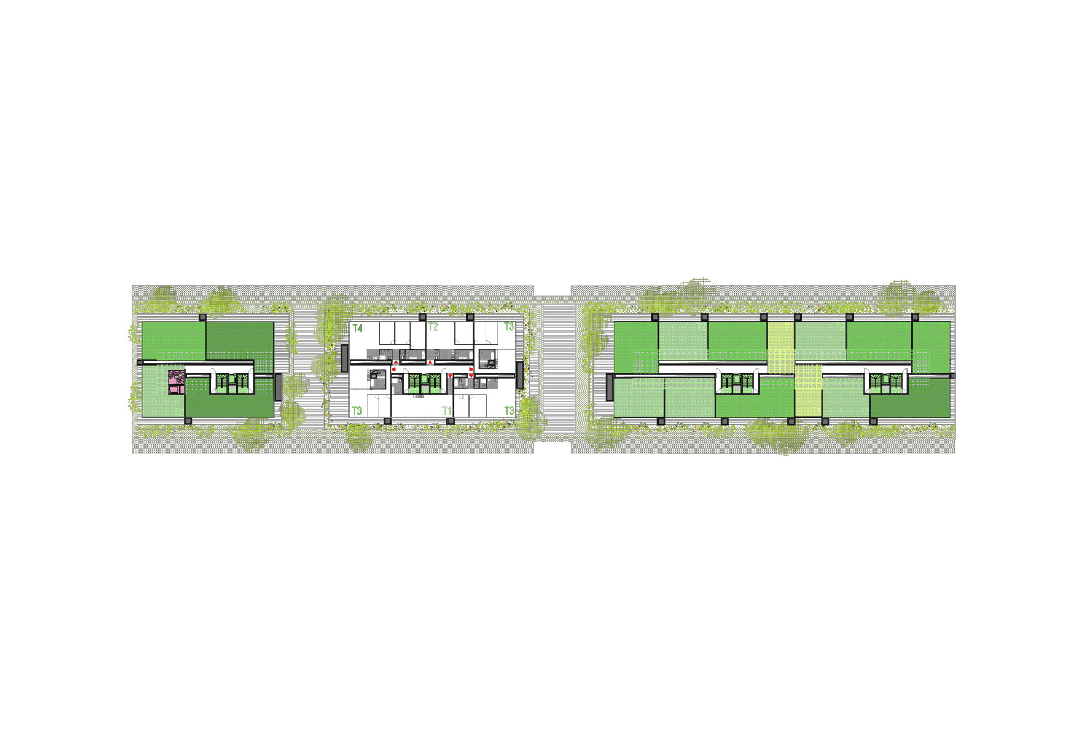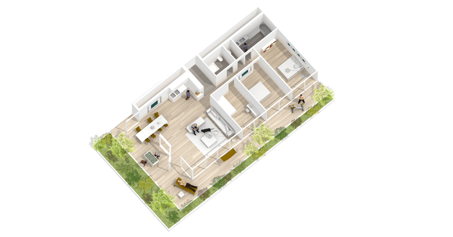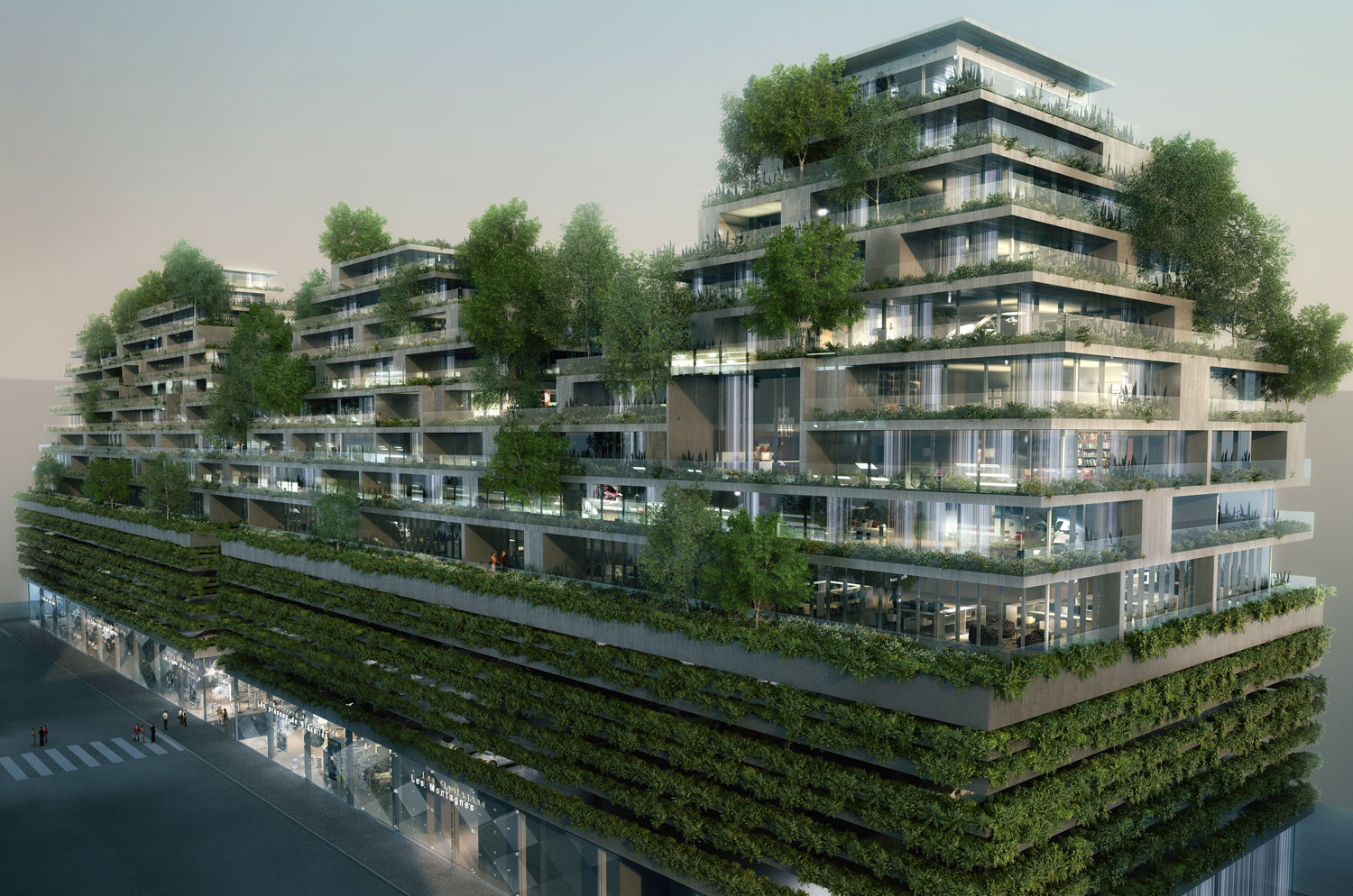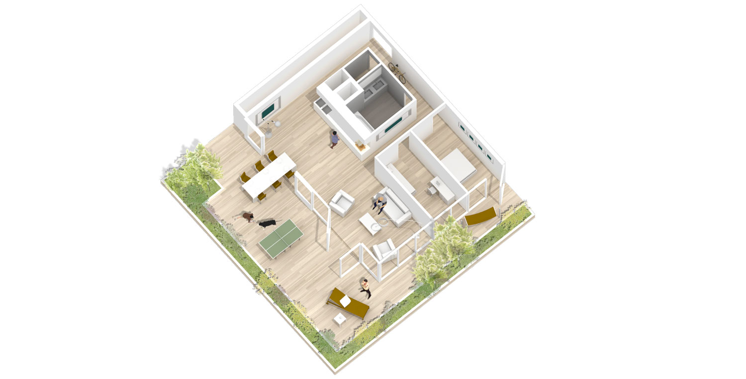 Nous proposons une urbanité paysagère faite de séquences et de volumes fragmentés qui imbriquent vides et bâtis et mettent en relation la ville et des modes d’habiter qui visent à combiner campagne et urbanité. Notre projet est une grande Maison faite de volumes divers et fragmentés. Il y a cette volonté de générer un volume cohérent, unitaire, tout en générant un principe d’habitat qui tende vers des maisons superposées. Ce sont des espaces qui rassemblent, pour une résidence qui respecte l’intimité et la « privacité» de chacun tout en proposant une vie collective, des espaces d’échanges et de rencontres. Il s’agit non seulement de loger mais aussi de mettre en œuvre des connivences entre un chez soi et un environnement, de générer des valeurs affectives que les résidents entretiendront avec leur résidence, de créer une histoire singulière que chacun pourra s’approprier. Les surfaces de balcons et terrasses démultiplient les surfaces des logements, et sont plus que jamais articulation entre intérieur et extérieur, entre le logement et son environnement : celles-ci sont donc impérativement généreuses. Le choix fondamental et structurant du projet est d’offrir à tous les logements des pièces principales prolongées de larges surfaces extérieures. Ainsi 100% des logements benificent de terrasses généreuses, profondes, augmentant de 30 à 50 % leur surface. Ce qui est donné à voir est résolument une volonté d’équilibre entre intérieur et extérieur, en affirmant le rôle apaisant et productif du végétal. La volumétrie est sculptée par des balcons qui se lisent comme une matière vivante dans laquelle des éléments bâtis sont retranchés en un jeu de pleins et de vides, les baies étant serties dans ce paysage végétal. La terrasse du restaurant, panoramique à 360° du dernier étage permettra à tous d’accéder à ce paysage.