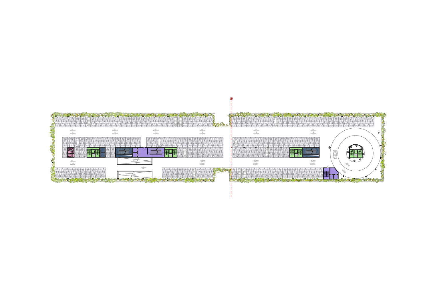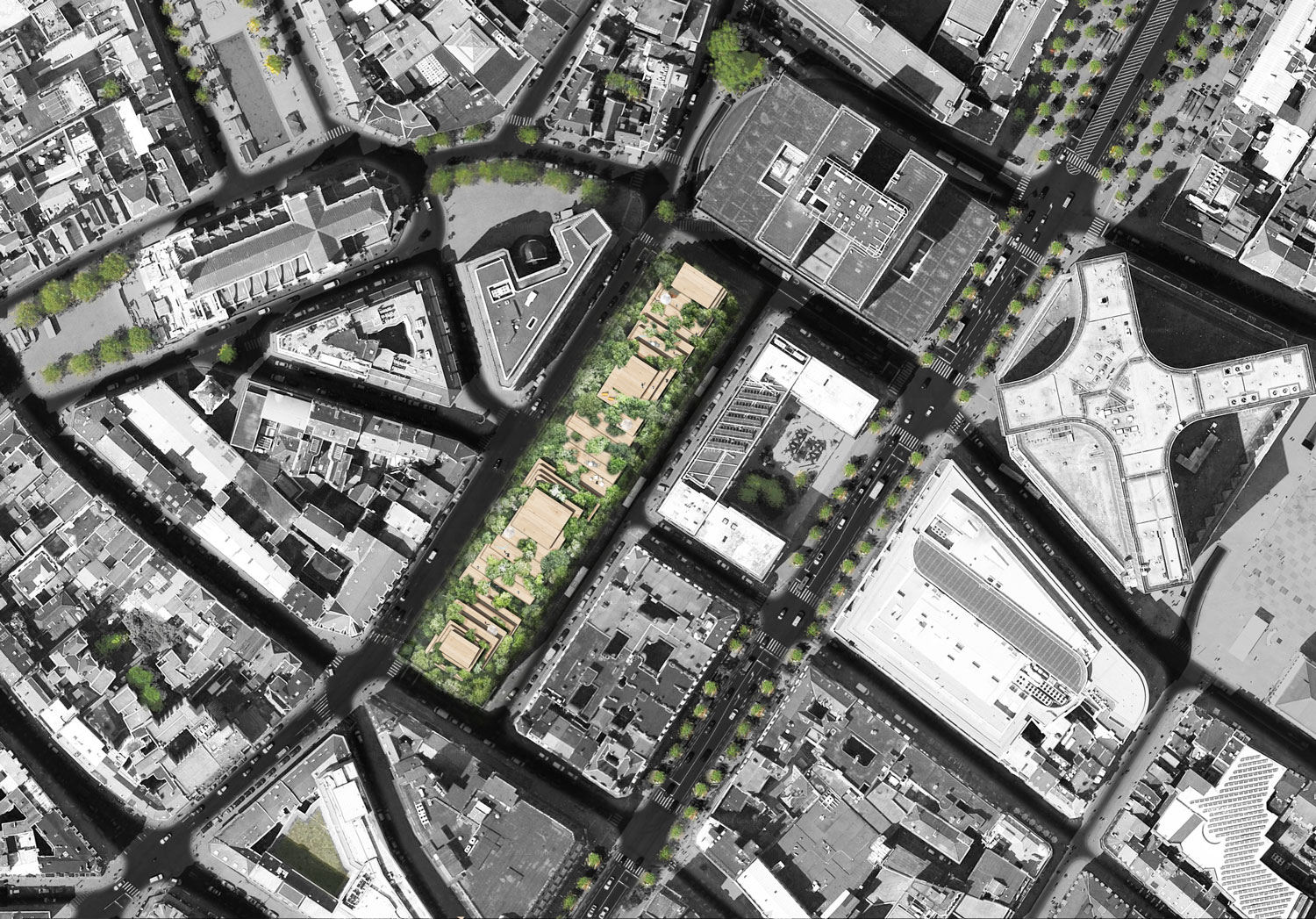 Notre projet est la transformation d’une infrastructure, d’un espace lié au stockage d’automobiles en un paysage habité, un parc, un élément Bruxellois où le végétal sera présent, affirmé dans une volonté de partager avec la ville un espace vert, une composition porteuse des valeurs d’imbrication de notre époque.