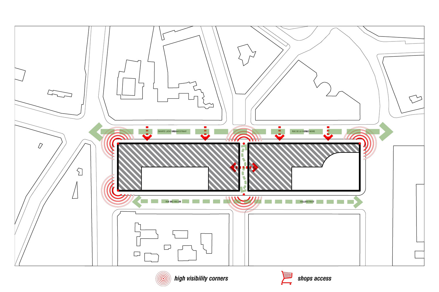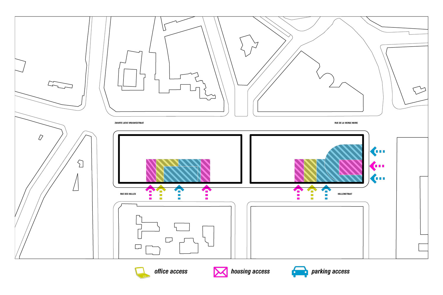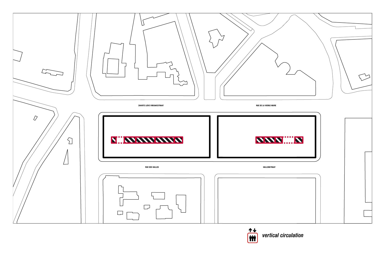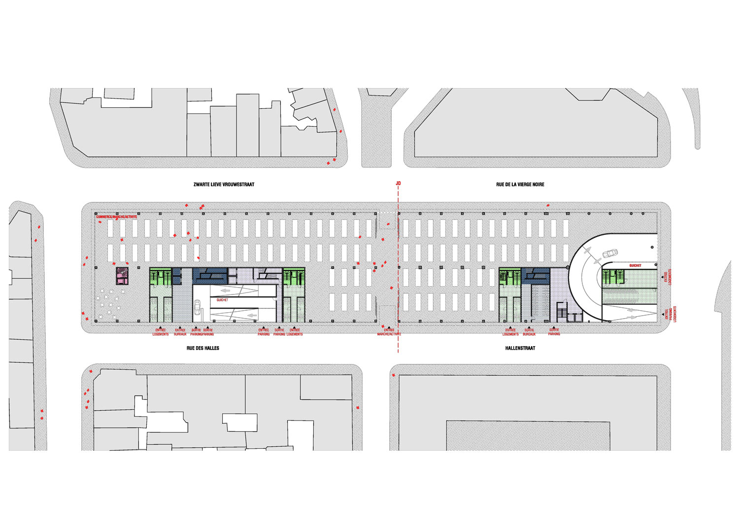 La programmation et le rapport à l’espace public qu’elle instaure est envisagée sous forme de strates horizontales. Il y a d’abord le rez-de-chaussée et ce rapport direct à la rue, puis une gradation progressive en adéquation avec les vis-à-vis. Rue de la Vierge Noire sur tout le linéaire du bâtiment, au sud rue du Marché aux poulets, nous mettons en œuvre un long linéaire vitré sur une hauteur de 6.50 m, occultable. Il s’agit d’avoir la limite la plus ténue possible entre intérieur et extérieur et de mettre le bâtiment en lévitation, suspendu au-dessus d’une vaste salle d’un seul tenant proposant. Les quatre premiers étages sont dévolus au parking dans la version de base. Dans une gestion rationnelle des surfaces, nous proposons de mettre le stationnement dans les niveaux bas pour libérer les surfaces plus qualitatives et les attribuer en totalité à des espaces habités, tous traités en villas superposées. Cette stratification résolument urbaine des programmes assure une qualification optimale des surfaces et des usages et permet une grande facilité de phasage. Ce parti pris de valorisation nous semble ainsi apporterune solution globale aux enjeux de l’ensemble de la parcelle. Au droit de la facade, les quatre niveaux de stationnement sont complètement libérés de tout élément architectonique afin d’assurer une bonne ventilation et un bon éclairage naturels. Ils sont traités telle une strate végétale.Un système de plantations en rives permet de les traiter tel un filtre végétal qui habille l’ensemble du volume du parking. Phagocytée par cet écrin végétal, l’infrastructure offfre dorenavant au voisinage, aux vis-à-vis directs, un parc vertical, une bio-diversité, de l’intimité, et de la privacité. La nature du paysage végétal est évolutive, elle prend en compte le rapport au sol et gère la hauteur dans ses spécificités. Au niveau du sol, nous proposons de regrouper l’ensemble des accès, de les concentrer rue des Halles. Prenant en compte les vis-à-vis, l’animation de la rue et le gabarit du batiment, nous proposons d’affirmer le caractère résidentiel de cette rue. En son centre, dans l’axe de la rue Grétry, nous ménageons une large percée visuelle et un passage ouvert au public.