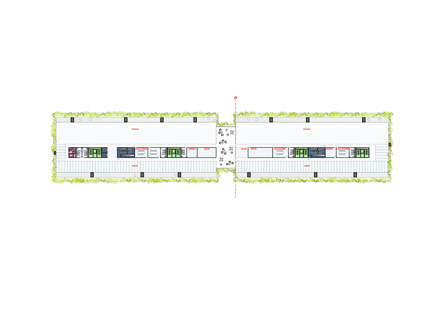 Une surface d’un seul tenant; tous les services sont sur le même plan; la mise en relation des éléments programmatiques est aisée. D’un coté des bureaux cloisonnables, au centre les services et la technique, et sur l’autre façade, un open space, long traveling sur l’ouest bruxellois. En périphérie une large terrasse de 2.50 m de large avec une ceinture végétale. Les terrasses sont le prolongement d’espaces de travail qui s’ouvrent largement sur l’extérieur pour une meilleure ventilation, mais aussi pour permettre d’organiser une réunion informelle, prendre un café, déjeuner ou prolonger de façon plus détendue une discussion de travail. Il s’agit de réaliser des espaces de travail qui soient un cadre de vie actuel favorisant les échanges et les nouveaux usages.