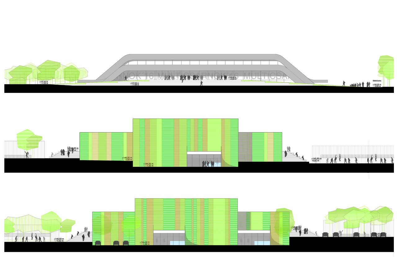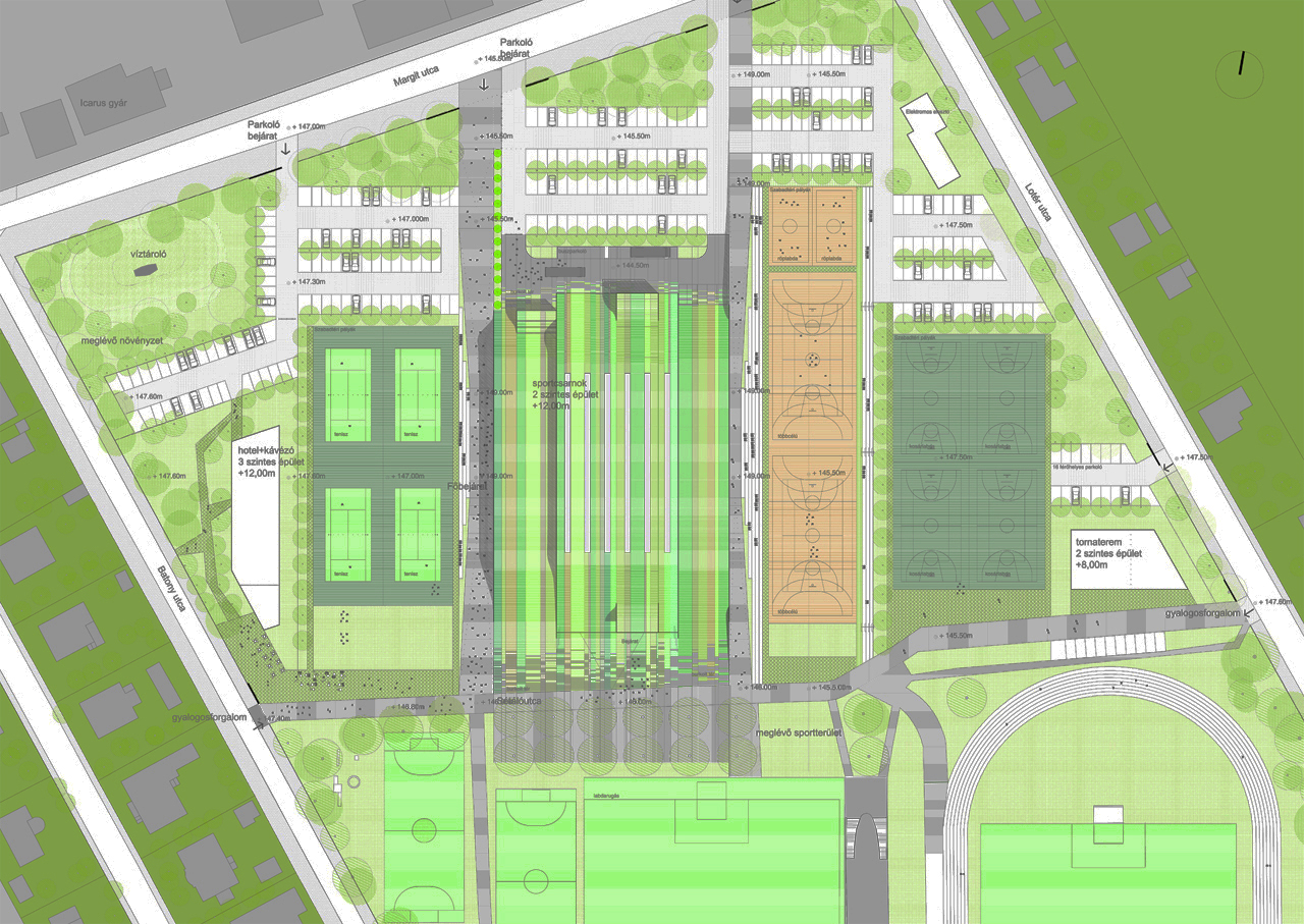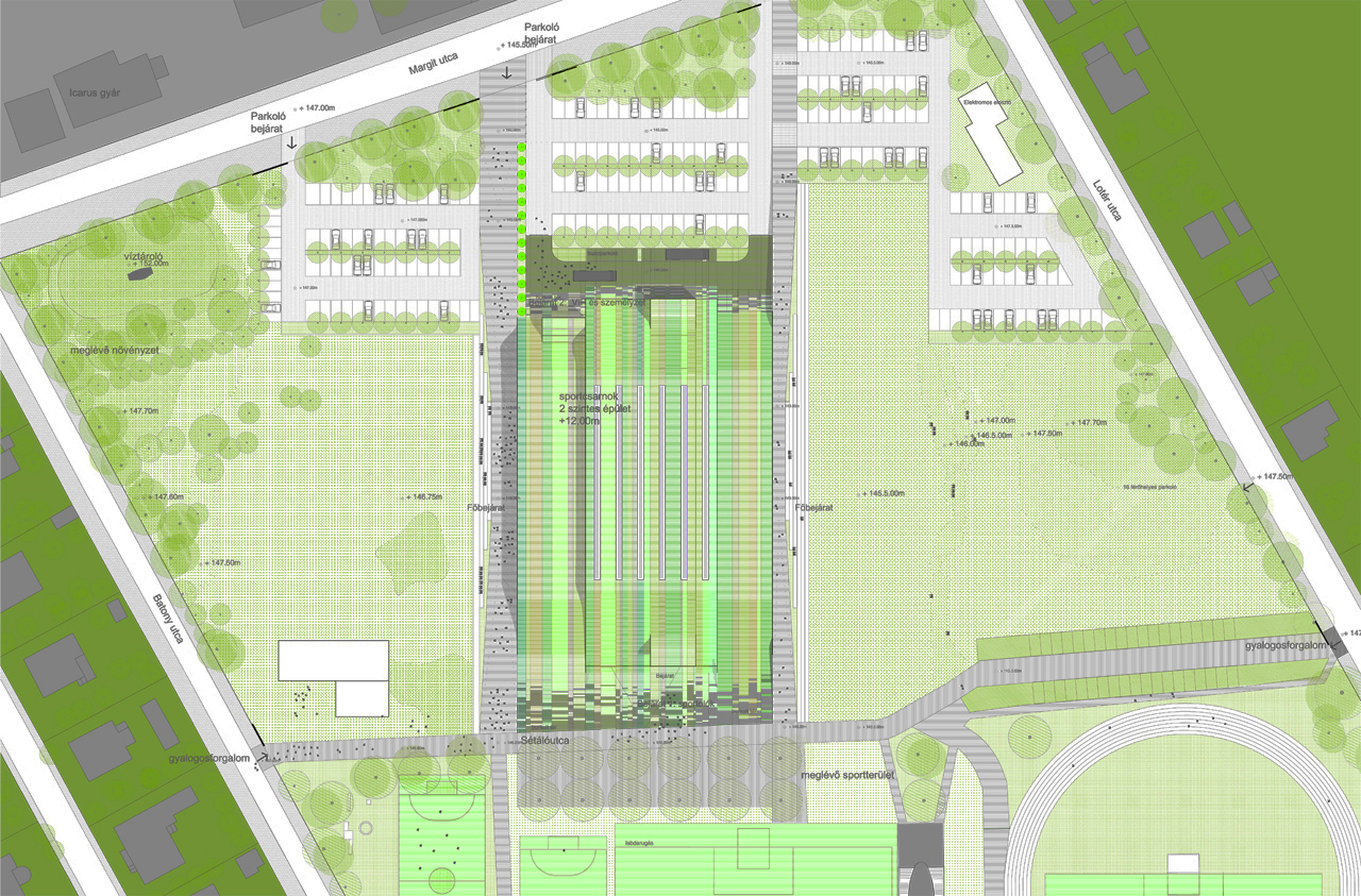A sports stadium is projected on a large green plot with existing sports facilities on the outskirts of Budapest. There is a proposal for the urban planning of the complete plot as a second phase within the competition. The building aims to be a transition between the urban landscape and the rural agricultural landscape nearby. It looks for an innovative but integrated image into the environment, with materials and colors that resemble the park and the trees of the area, like a still life that copies the tone and appearance of the surrounding vegetation. It aims to be a catalyst for the image of the neighborhood in which it is framed: a modern look for a different building. The project seeks to achieve both an effective circulation of the various users of sports: athletes and audiences, and the right position in the existing a park, complementing it with the necessary parking space and accesses. Instead of placing a large, squared volume, we choose to “continue” the green space integrating the sports park in it. The proposal is almost a landscape rather than a building, composed of folding surfaces and green waves.