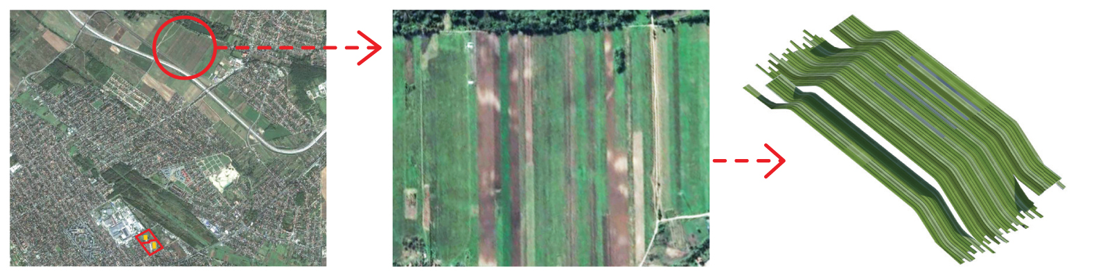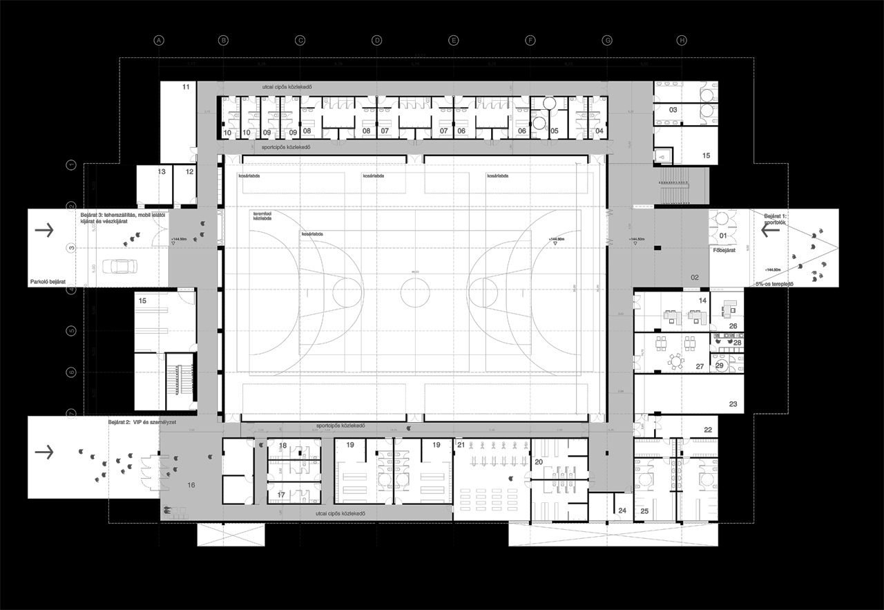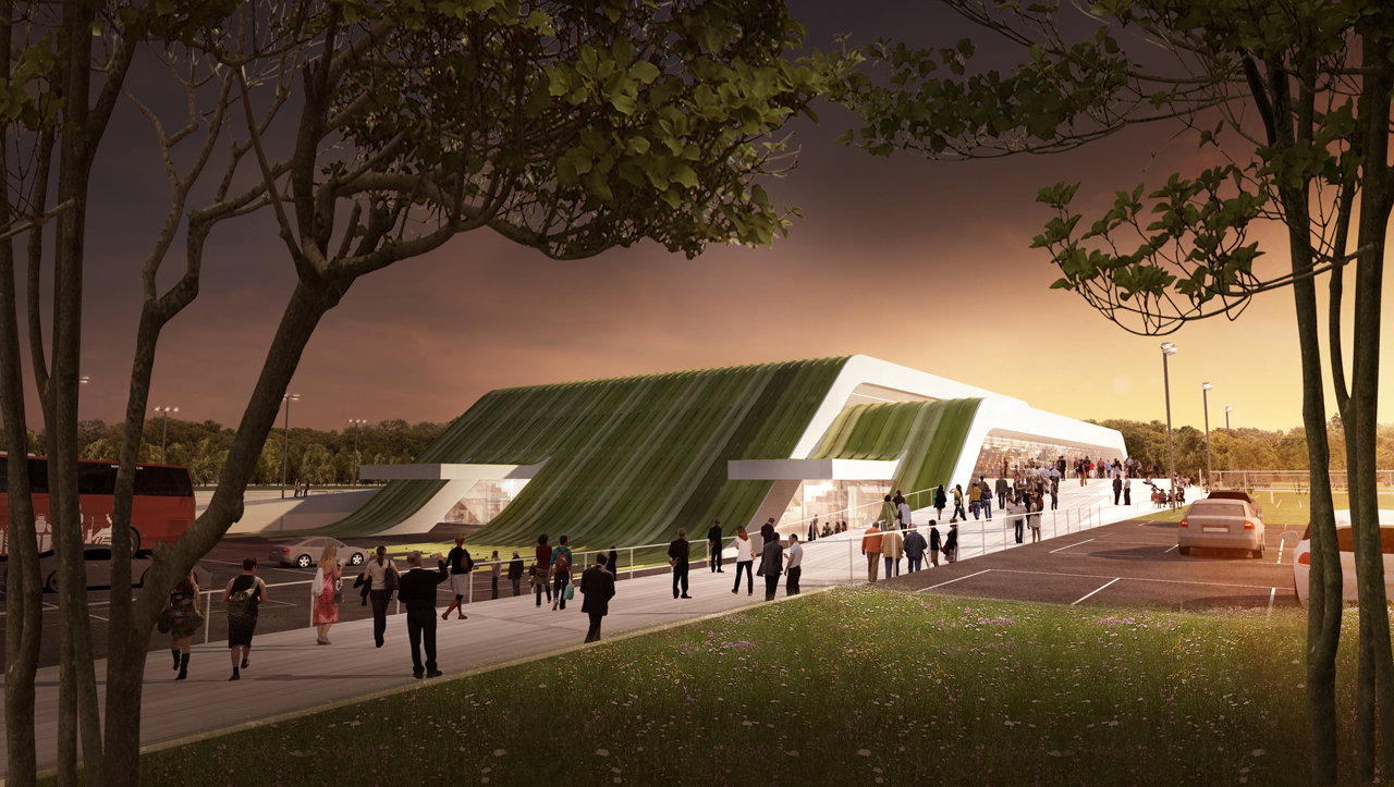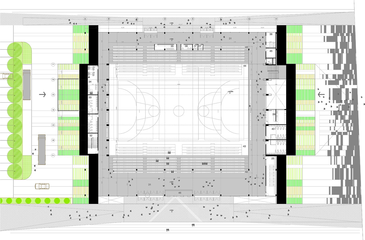 A sports stadium is projected on a large green plot with existing sports facilities on the outskirts of Budapest. There is a proposal for the urban planning of the complete plot as a second phase within the competition. The building aims to be a transition between the urban landscape and the rural agricultural landscape nearby. It looks for an innovative but integrated image into the environment, with materials and colors that resemble the park and the trees of the area, like a still life that copies the tone and appearance of the surrounding vegetation. It aims to be a catalyst for the image of the neighborhood in which it is framed: a modern look for a different building. The project seeks to achieve both an effective circulation of the various users of sports: athletes and audiences, and the right position in the existing a park, complementing it with the necessary parking space and accesses. Instead of placing a large, squared volume, we choose to “continue” the green space integrating the sports park in it. The proposal is almost a landscape rather than a building, composed of folding surfaces and green waves.