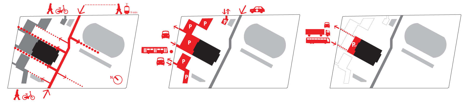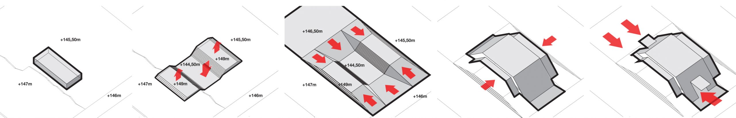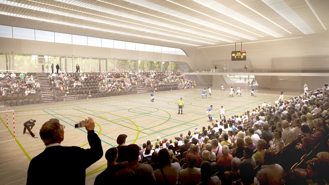 A large deck with three overlapping wavebands emerges on the lot, starting from the floor and rising above the ground to accommodate the different indoor activities beneath. Light is entering from the top and the height of the lower bands allows light entrance from both sides. The building sits in the park with some simple interventions that leverage the existing topography, placing the playing field and changing rooms on the lower level of the plot and raising the side stands to the upper bound of the plot. Gentle ramps link both levels with the parking to the north side and the main pedestrian path to the south, allowing pedestrian access to all users of the area. Finally, the large, light deck is placed above, unifying all the intervention with a smooth transition between the landscape of the park and the building.