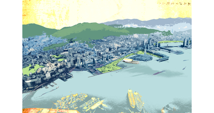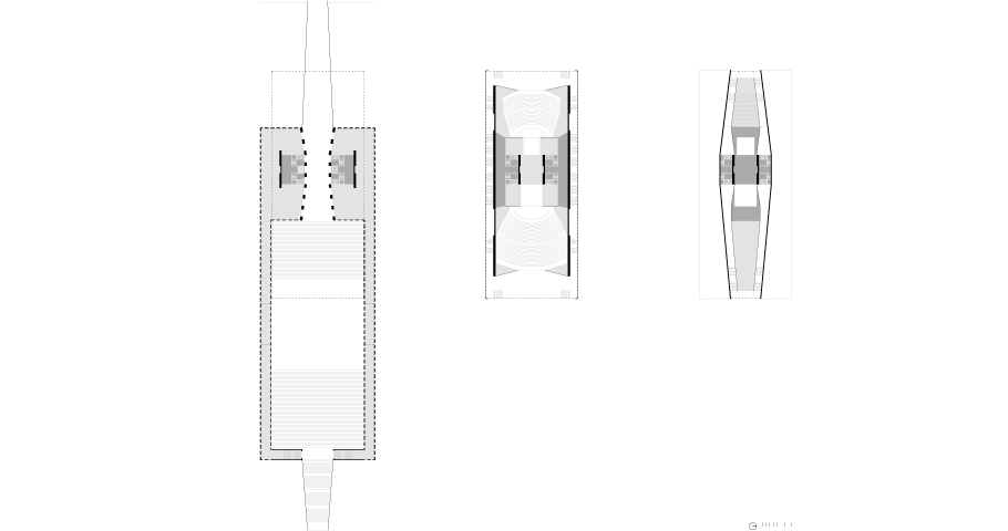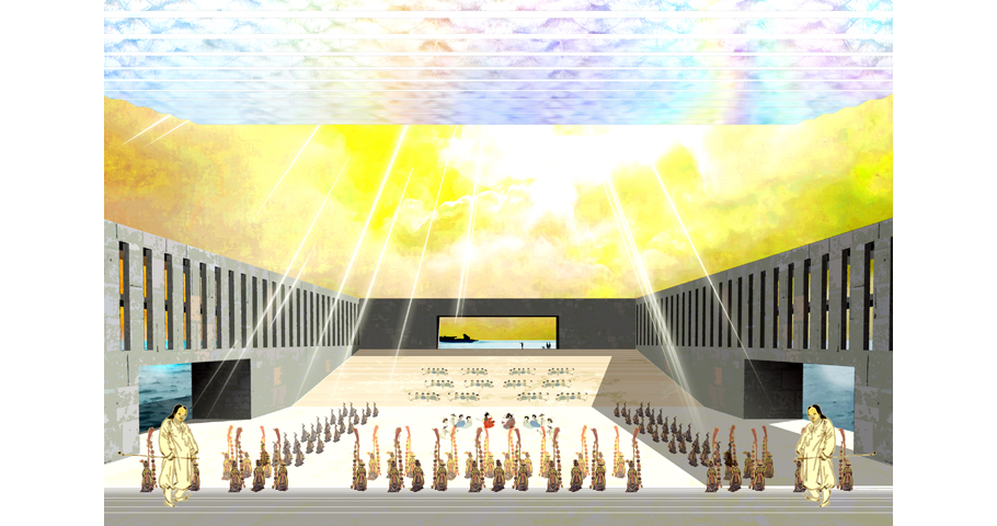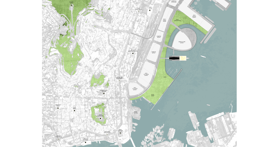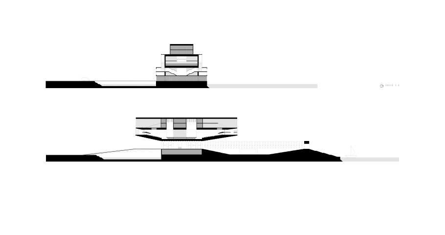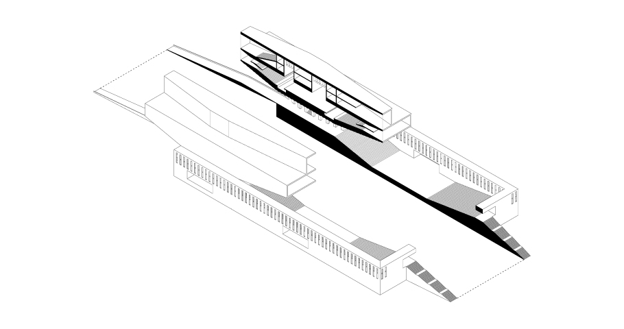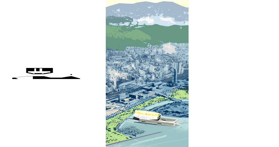 Since 1876, the metropolis of Busan has been one of the world’s premier sites for maritime exchange. The city has grown around its bay in a very tight available space between mountains and the Pacific Ocean. Based on this maritime tradition, the Opera House is designed as a gigantic docked container ship. The program is seen as an “island-building” connected to Busan through the Waterfront park. It extends along a perfect East-West axis, towards sunrise. The project features a 2.000-seat Opera House, a 1,300-seat Multi-Purpose Theatre, and a smaller 300-seat Theatre. As Busan wishes to be known as a cultural capital, the “island-building” offers an additional traditional korean open theatre as an alternative to the western performing way. As a link between earth and sea, between tradition and contemporaneity, between South-Korea and the World, the Opera House fully faces its large horizons. As the Yin Yang symbolizes harmony and the perfect balance of all things, the “solid volume” of the Opera House is exactly the same shape and size as the “void volume” is in the traditional theatre. The “solid” is elevated above the island’s base. Through the preserved “void”, the horizon from the city to the sea is set free.
