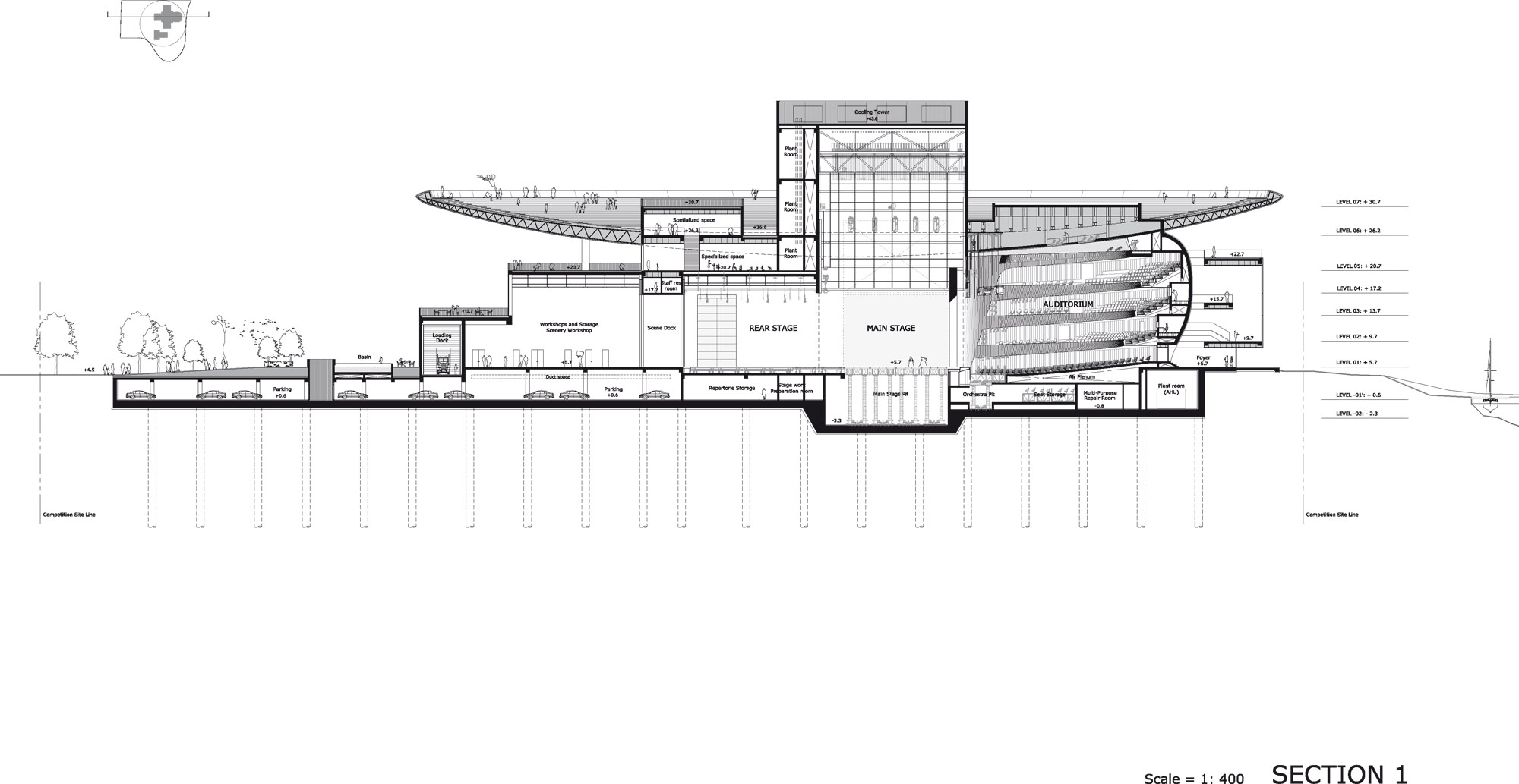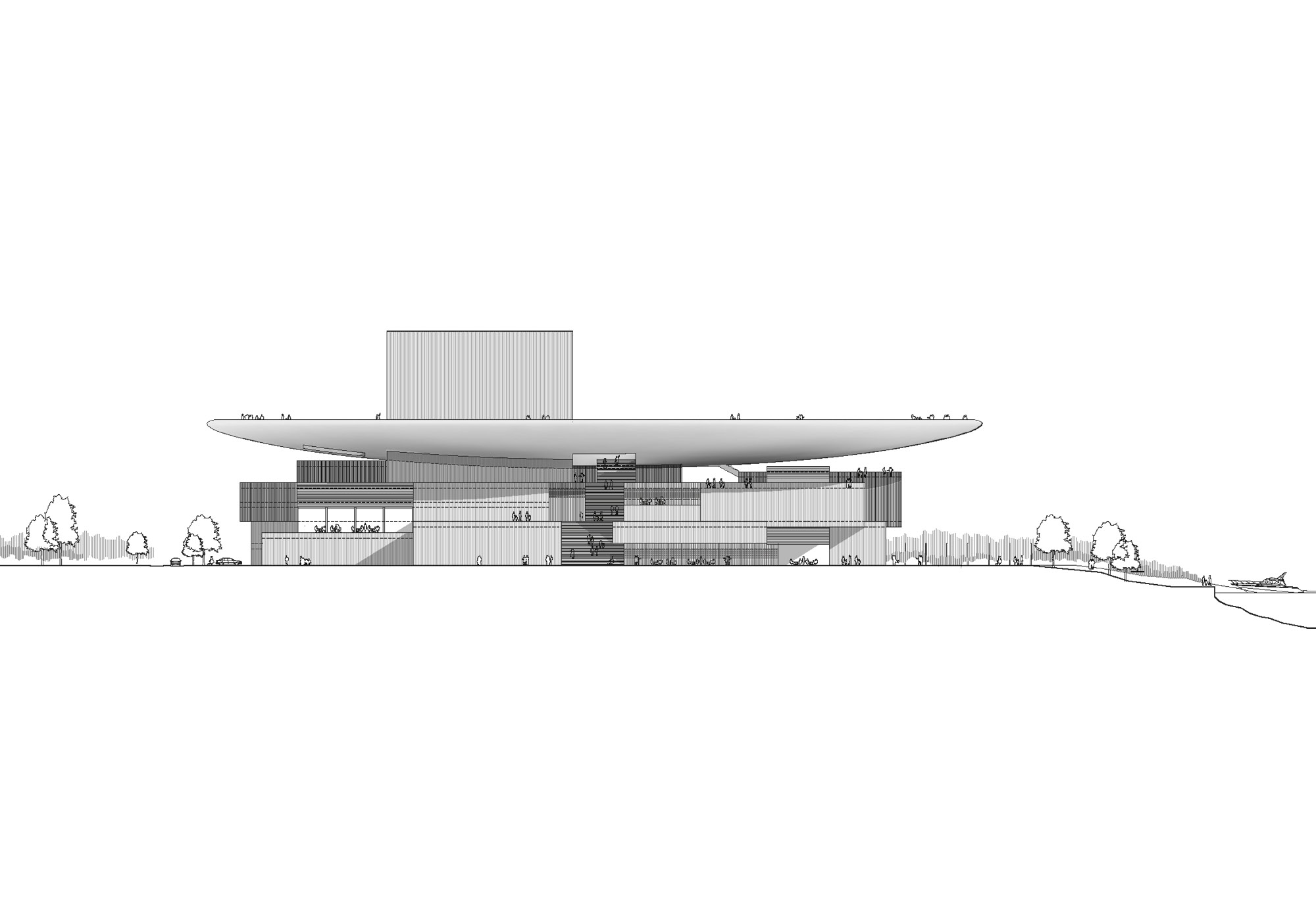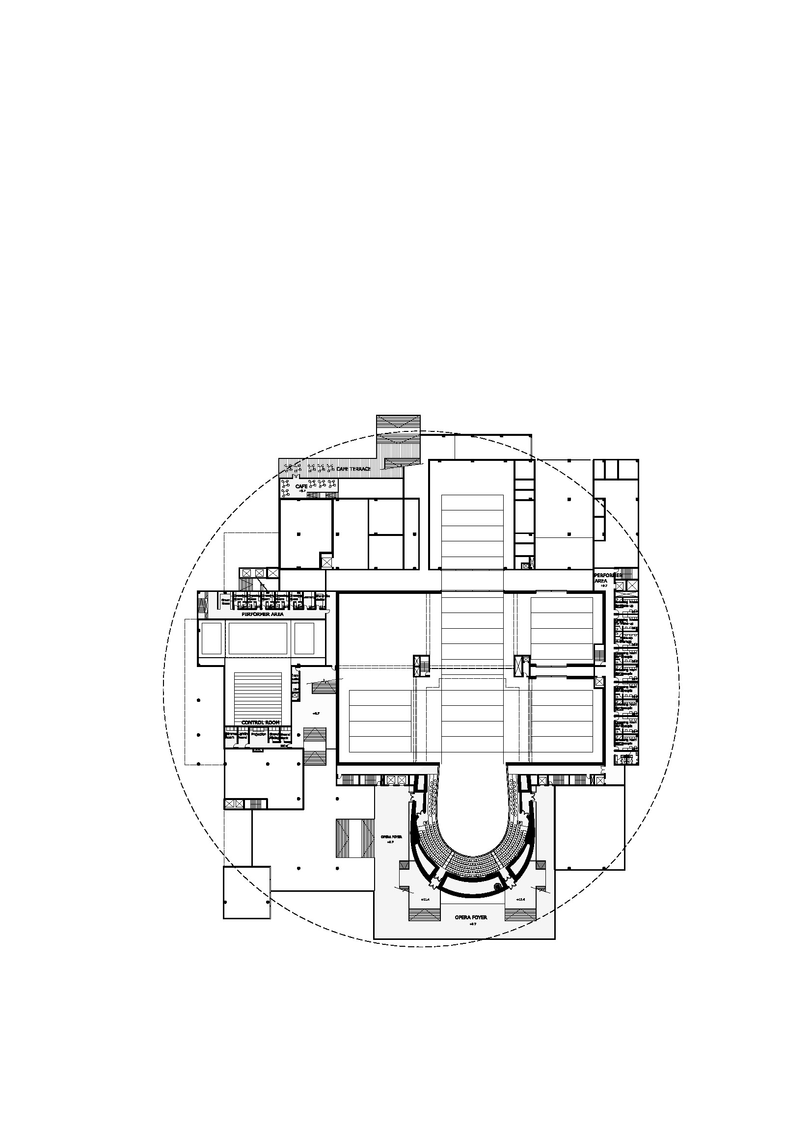 The architecture takes it’s inspiration from the particular location in Busan. The clear shape of the grand roof creates a magnificent icon in the vertical context of high-rises and mountains. At the same time it creates a subtle unity with the ocean and the horizon. The circle of the roof becomes a strong symbol encompassing a dynamic range of unique activities. The different functions of the cultural centre are conceived as houses and city blocks under the grand roof. The architecture envisions an “art or opera village” of fragile wooden chests that are sheltered from rain and sun. The auditorium is the symbolic heart of the house conceived as a giant pearl set between the wooden boxes. The inside of the auditorium follows the classic horseshoe form creating a festive social space where everybody sees everybody and still has excellent acoustics and views to the stage. The city has a beautiful location between high mountains and long fjords. The hilly terrain provides a rich, natural view of the cityscape. For the surrounding city, the new opera is The Stage of Busan – letting everyone become part of and follow the unique life at this special place. The roof functions as an amphitheatre and constitutes a grand new place capable of setting in scene the unique location with the sea, mountains and city of Busan.