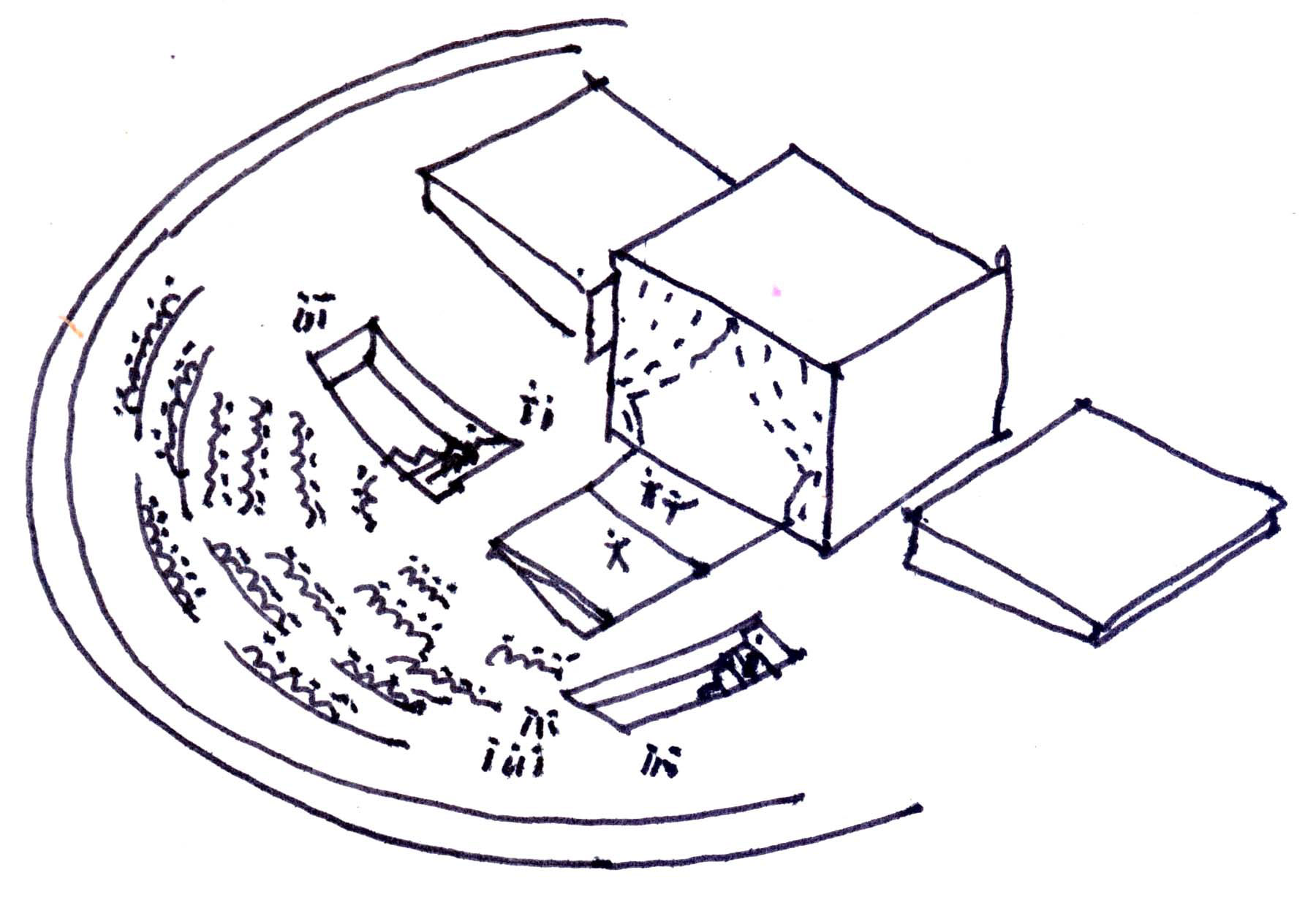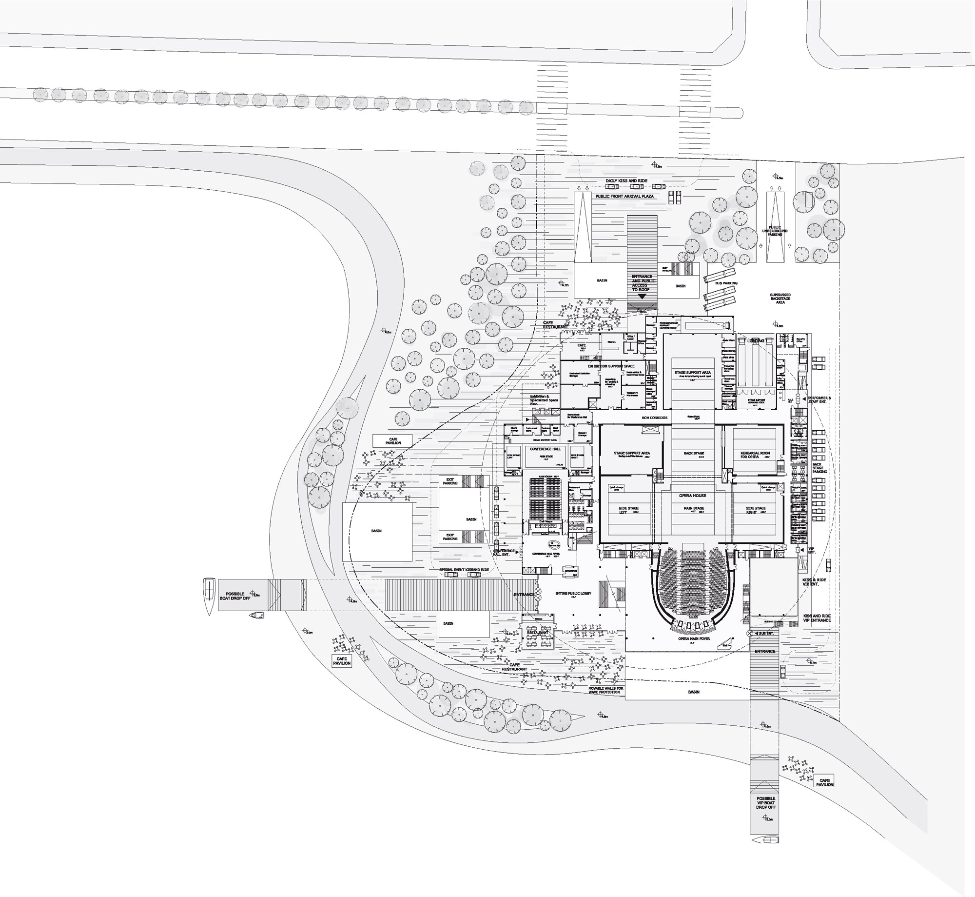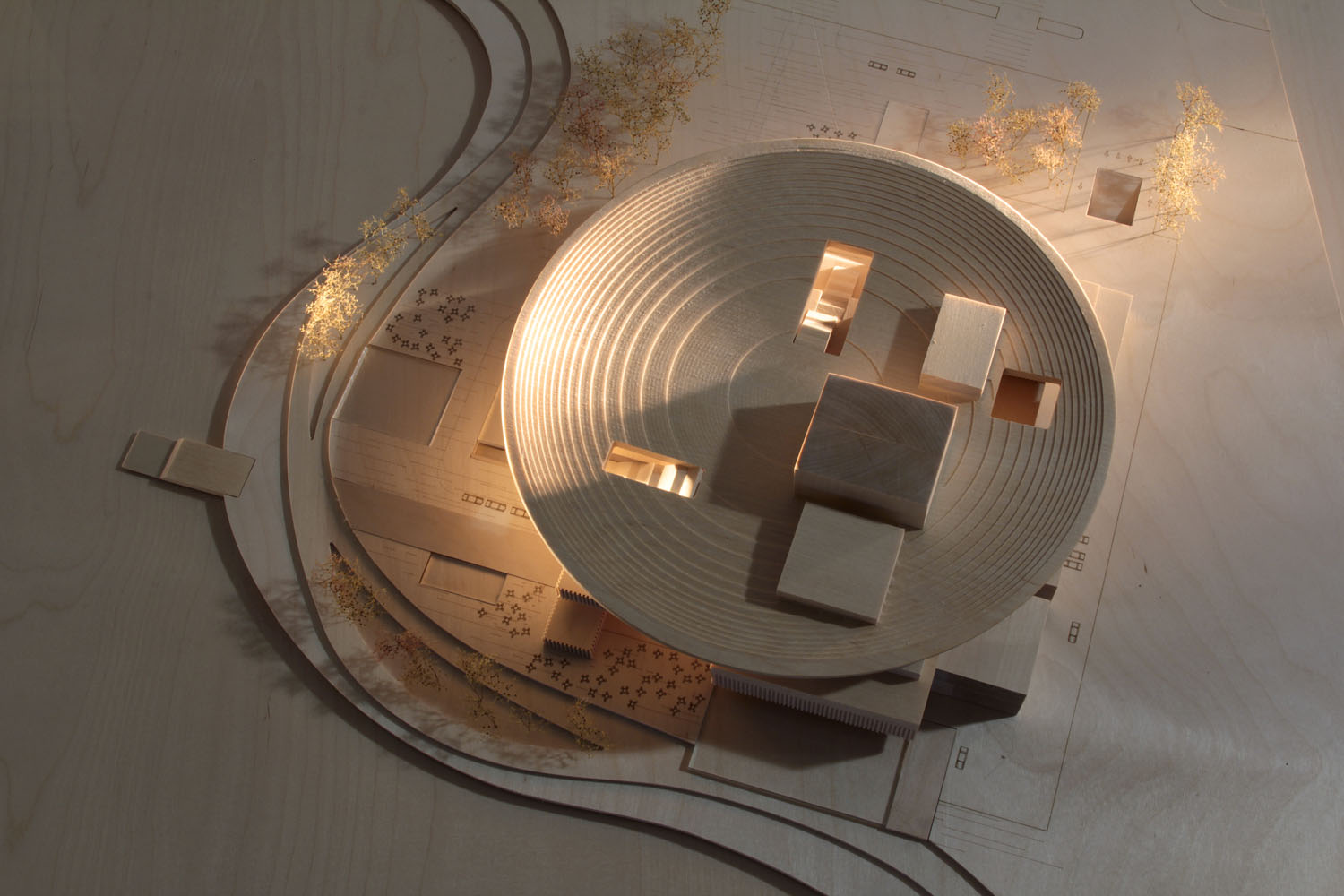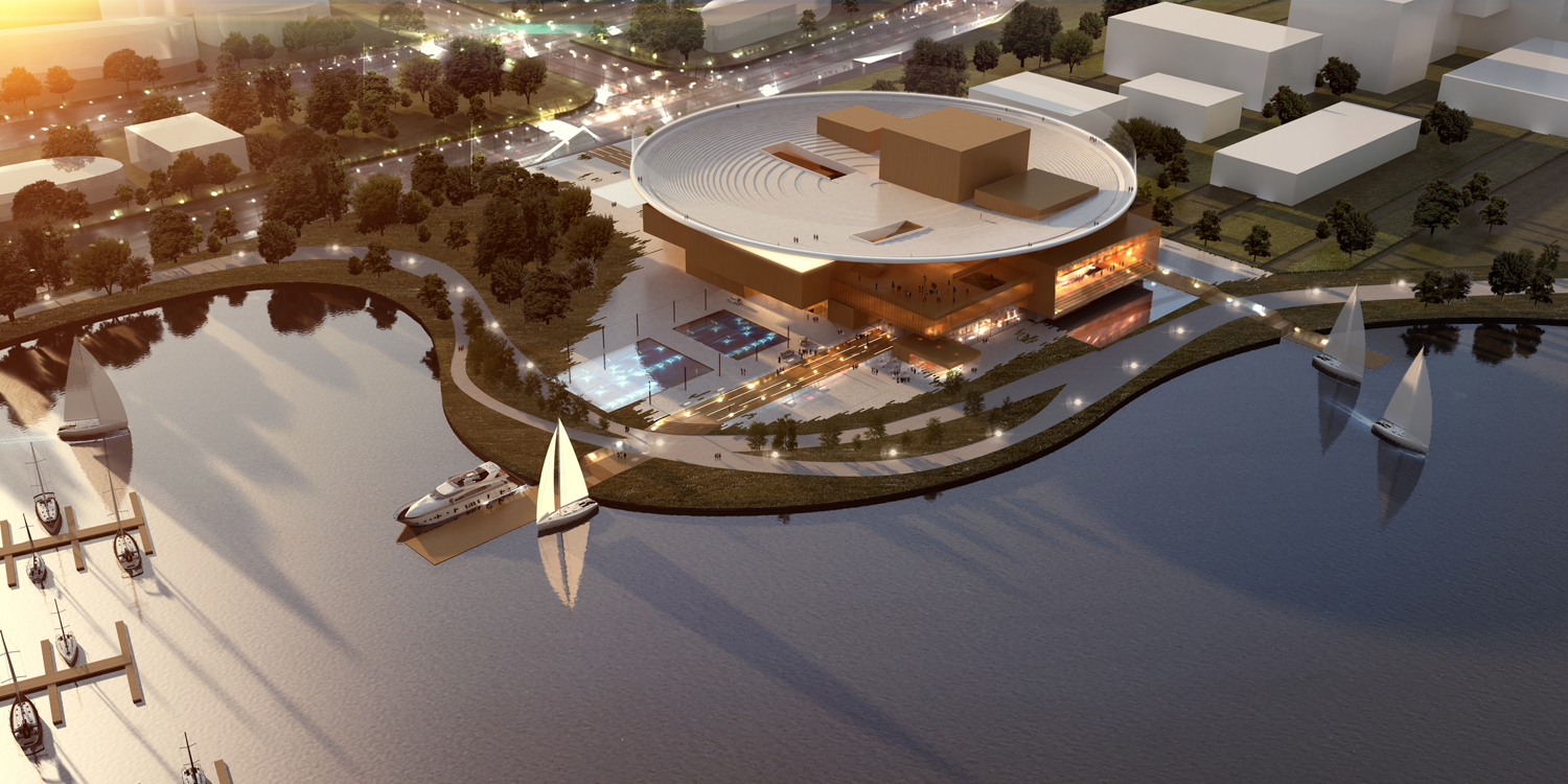 The architecture takes it’s inspiration from the particular location in Busan. The clear shape of the grand roof creates a magnificent icon in the vertical context of high-rises and mountains. At the same time it creates a subtle unity with the ocean and the horizon. The circle of the roof becomes a strong symbol encompassing a dynamic range of unique activities. The different functions of the cultural centre are conceived as houses and city blocks under the grand roof. The architecture envisions an “art or opera village” of fragile wooden chests that are sheltered from rain and sun. The auditorium is the symbolic heart of the house conceived as a giant pearl set between the wooden boxes. The inside of the auditorium follows the classic horseshoe form creating a festive social space where everybody sees everybody and still has excellent acoustics and views to the stage. The city has a beautiful location between high mountains and long fjords. The hilly terrain provides a rich, natural view of the cityscape. For the surrounding city, the new opera is The Stage of Busan – letting everyone become part of and follow the unique life at this special place. The roof functions as an amphitheatre and constitutes a grand new place capable of setting in scene the unique location with the sea, mountains and city of Busan.