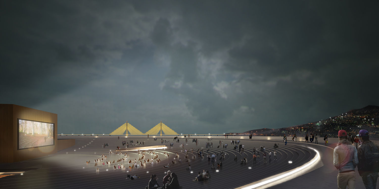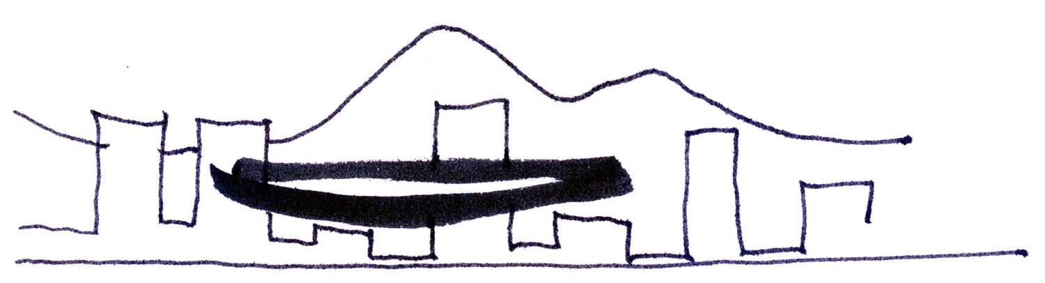 At the same time, the concave shape creates a strong unity of the roof amphitheatre. The roof amphitheatre creates a huge space that is shielded from the wind and separated from the noise and bustle of the city. In the evening, the collected heat from the sun creates a warm and protected plaza – like the amphitheatrically shaped city hall square in Sienna, Italy. The view of the contours of the mountains, the horizon of the Korea Strait, and the sky, at night with the moon and stars forms part of the experience. The roof changes over time depending on use, weather and seasons, day and night. Snow and rain, colours and scent of flowers can be complemented with artificial light shows in the night.