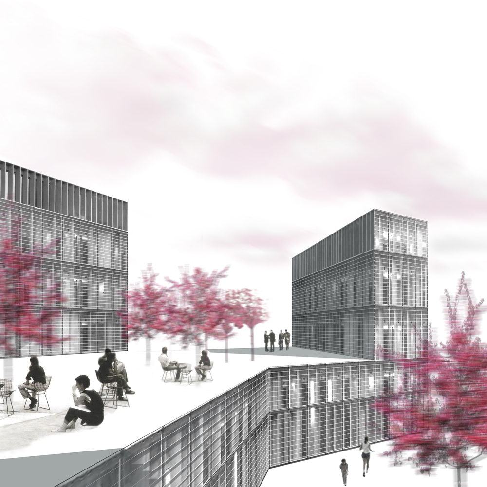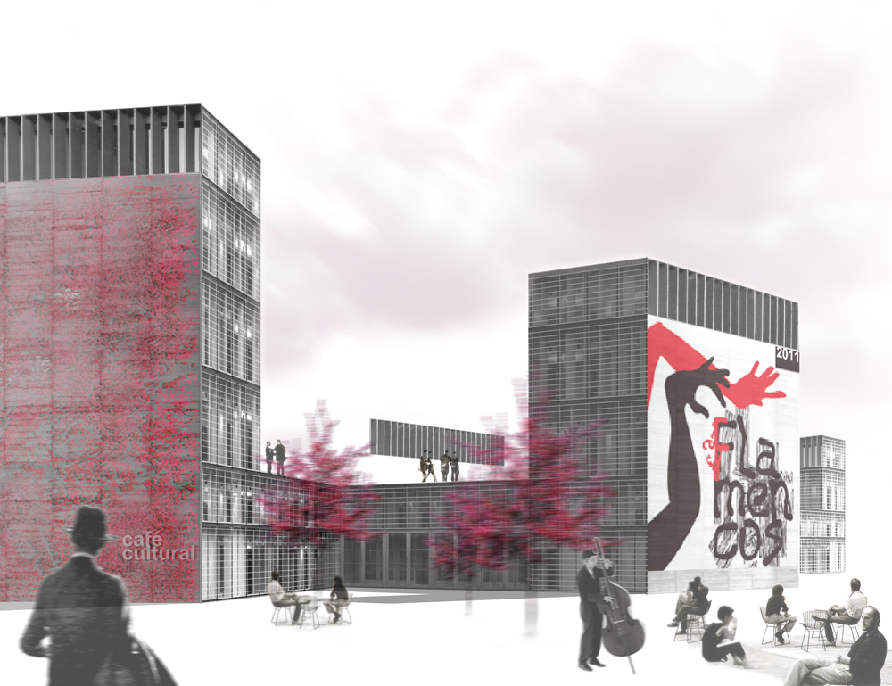 El Café Cultural se presenta al barrio a través de sus cinco torres que comparten la escala de los bloques de viviendas adyacentes. Las fachadas de las torres que se vuelcan hacia el barrio ofrecen cuatro jardines verticales y, en la entrada principal, un soporte para divulgar los contenidos culturales del centro. El edificio se abre, a nivel de suelo, a través de los espacios verdes que crea su implantación, dotando de cinco nuevos jardines al barrio que invitan a los vecinos a acercarse y disfrutar de la cultura. La propuesta incluye el ajardinamiento de los nuevos espacios verdes y su adecuación paisajística y ambiental para garantizar su integración con el entorno atendiendo a la aplicación de criterios de sostenibilidad en lo que se refiere a sistemas constructivos, especies vegetales, materiales y diseño de las instalaciones.