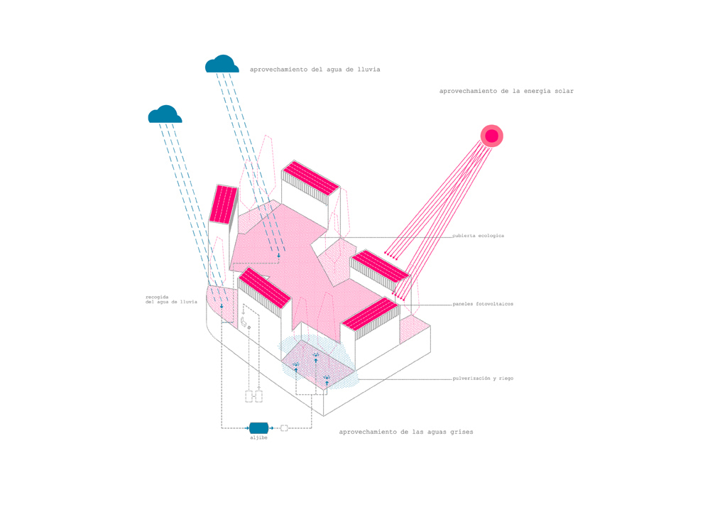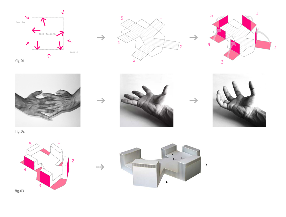 Entendemos nuestro edificio y el barrio como dos manos que se entrelazan. Pensamos en el café Cultural como una mano tendida hacia el Polígono en la que cada uno de sus cinco dedos se especializa y responde a cada uno de los cinco ámbitos del programa. Unos dedos que se levantan para no sobrepasar el límite de actuación y que de esta manera, como una mano llena de expresividad, como esas maravillosas manos del flamenco, dota al edificio del carácter representativo y de la escala que necesita.