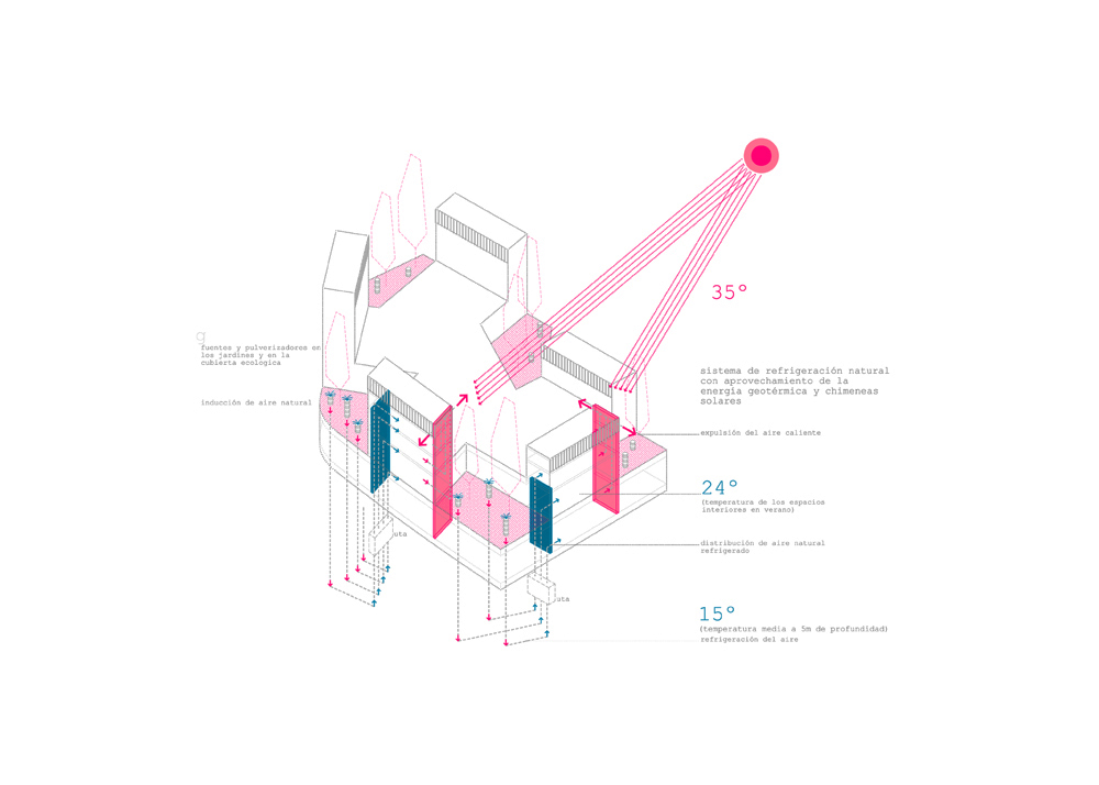 – Planta torres: espacios acotados con uso específico. Las cinco torres, que rematan cada uno de las naves, presentan distintas alturas en función de las necesidades espaciales del área al que pertenecen. Sus plantas son espacios acotados con un uso específico. En la planta baja de cada torre se concentran los elementos servidores y de comunicación vertical del edificio: ascensores, escaleras, baños, vestuarios, almacenes…En las plantas altas se ubican las instalaciones de cada área. El auditorio se ubica en planta sótano para conseguir que su dimensión y dotaciones sean generosas sin entrar en conflicto con los otros usos del conjunto, potenciando de este modo la flexibilidad espacial de la planta baja. El resto de la planta sótano lo ocupa el garaje desde el que se tiene acceso a un montacargas que da servicio al escenario del auditorio.