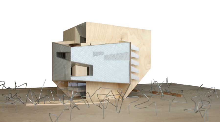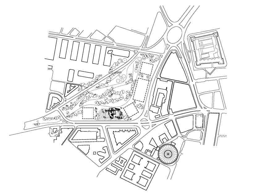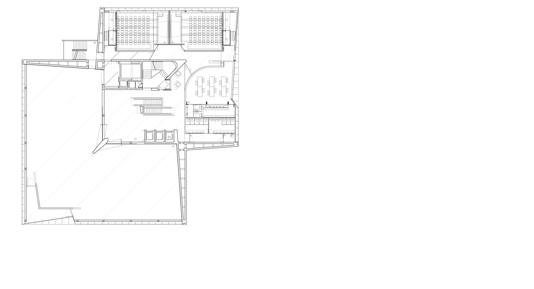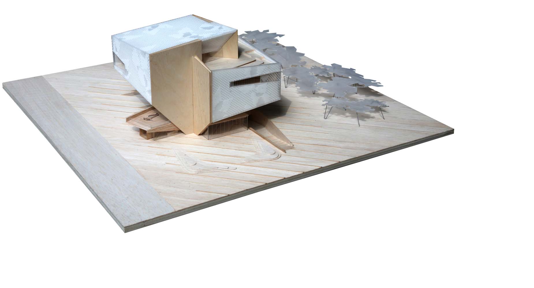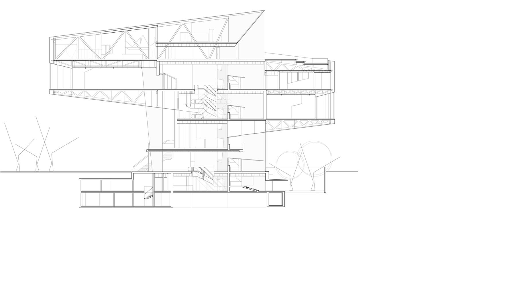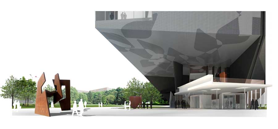 We started the Project considering two challenges. First: a building capable of “making the city”, by its singularity as well as by the public spaces generated. Second: a building that connects with the city and the new park through remote perspectives as one goes through it, but at the same time it should provide introspection in the exhibition halls. That is, a building “creating city” which at the same time makes us a part of it as we inhabit it. These two ways to approach the project are solved raising the exhibition halls in order to free the ground floor so the more open and transparent areas, such as the lobby and the shop, can be placed there. Our intention is to generate public space, taking the park towards the city and through the building; a space that will be lit at night with drawings coming from the metal sheet façade’s perforations. This metal sheet is also hiding the main structure supporting the elevated exhibition halls. The garden is placed underneath the raised exhibition hall and semi-buried, so that it is also auditorium’s evacuation. This garden can also be understood as a lobby and exterior catering zone for the auditorium, so that it is connected directly to the city even when it is placed in the basement.