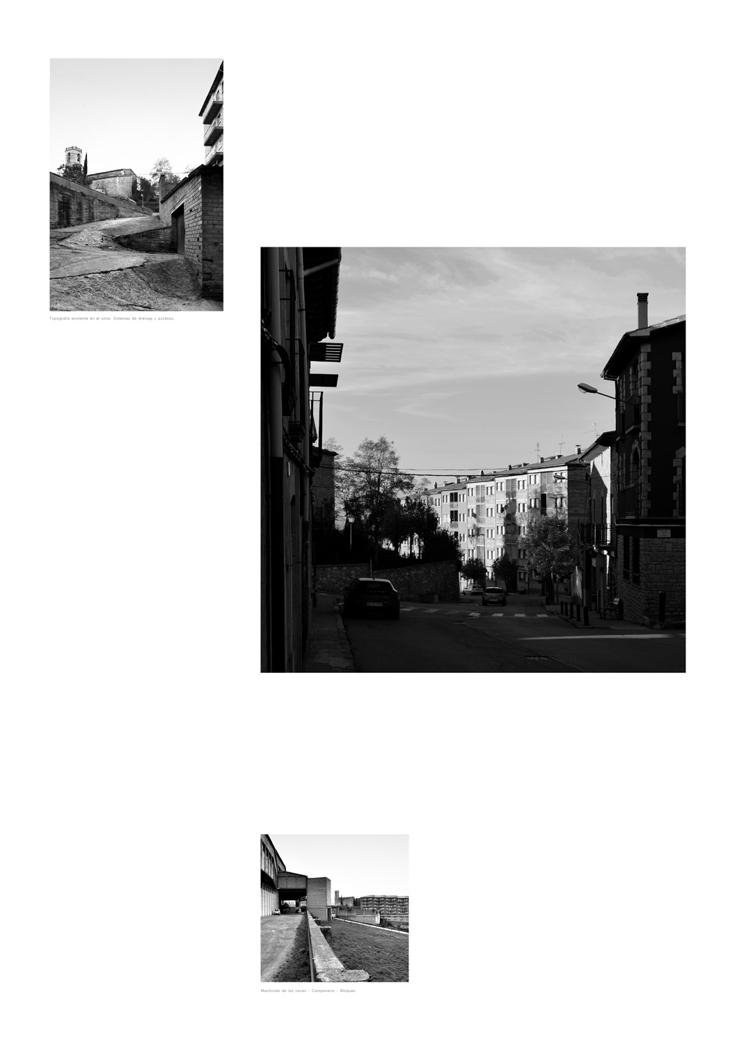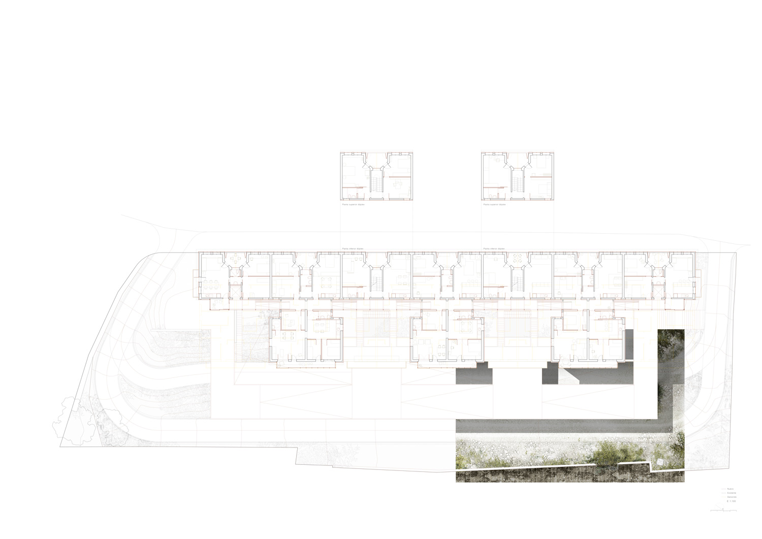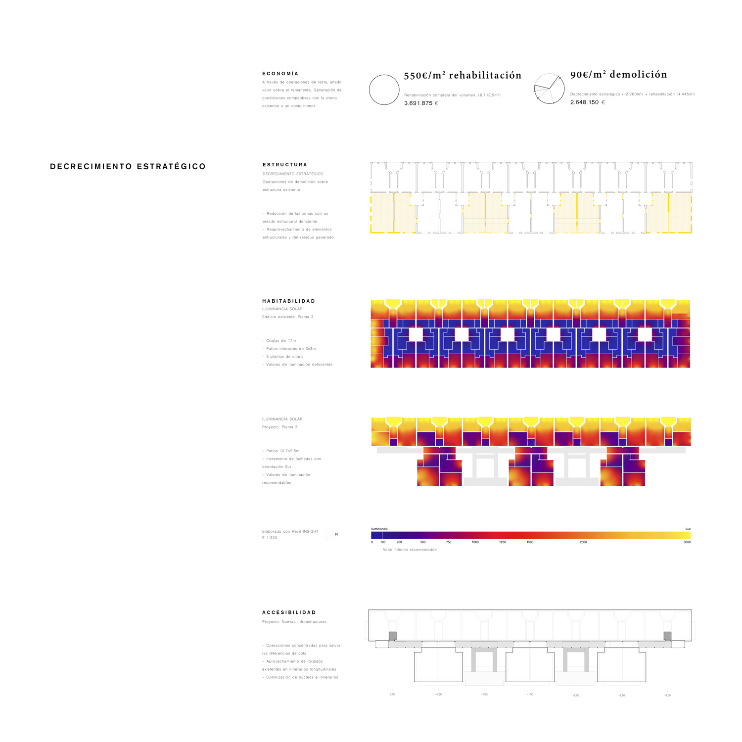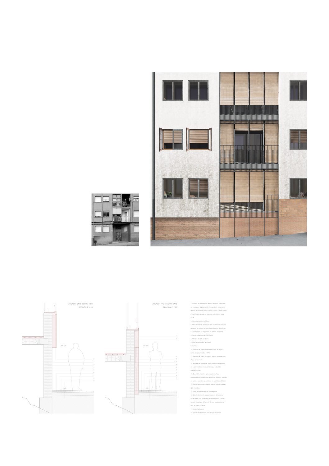 Cal Simó was built in 1965 to house the workers of the Puigneró factory in Sant Bartomeu del Grau. After the closure of the factory in 2003, these 70 dwellings experienced a gradual loss of inhabitants to a minimum of 8 currently occupied houses. With 62 empty houses (more than 66% of the locality), nowadays the building appears as an oversized structure for the town and its demand. The work shown here is based on the understanding that there is a cheaper way of intervention than rehabilitation, which is partial demolition. Even though being aware that this implies a loss of built volume, a strategic subtraction can entail an added value on the remaining structure resulting in a higher economic performance. In this sense, we understand that a strategic demolition on the most structurally compromised points enables to sponge the total volume improving key issues of the building such as accessibility or habitability. The privileged position of the building facing the landscape, the need of intervention on the structure in the back of the building, the poor state of the attached constructions… invite to develop a more intense intervention on the back of the volumes. We understand that in order to compete with the existing housing offer in the locality, it is necessary to generate substantial improvements in the lighting and ventilation of these dwellings. With this, 4 strong demolition operations are carried out on strategically selected points aiming to substantially correct the building’s problems while carrying contained operations in the rest of the volume. Once the surplus of built volume has been identified, the project aims to add value to the infrastructure through subtraction.