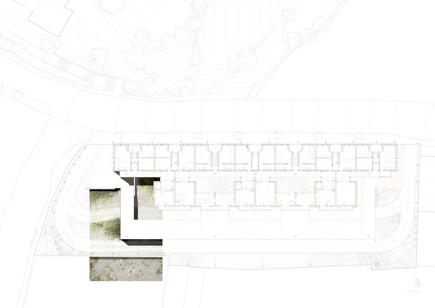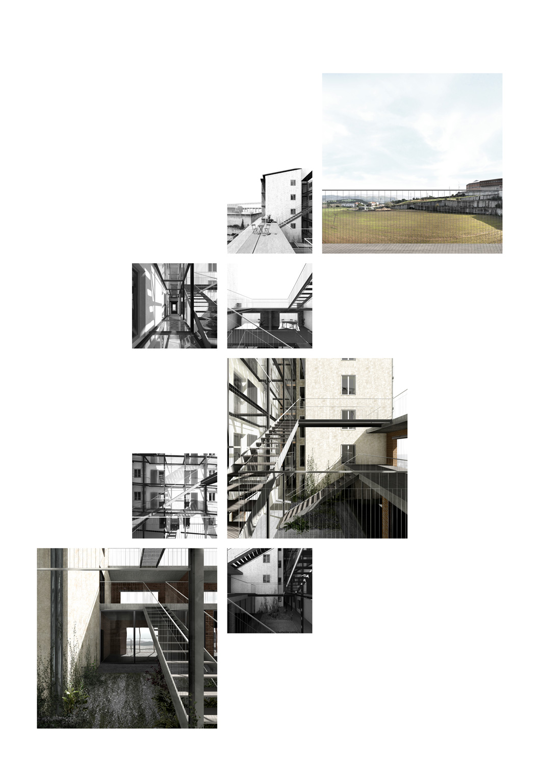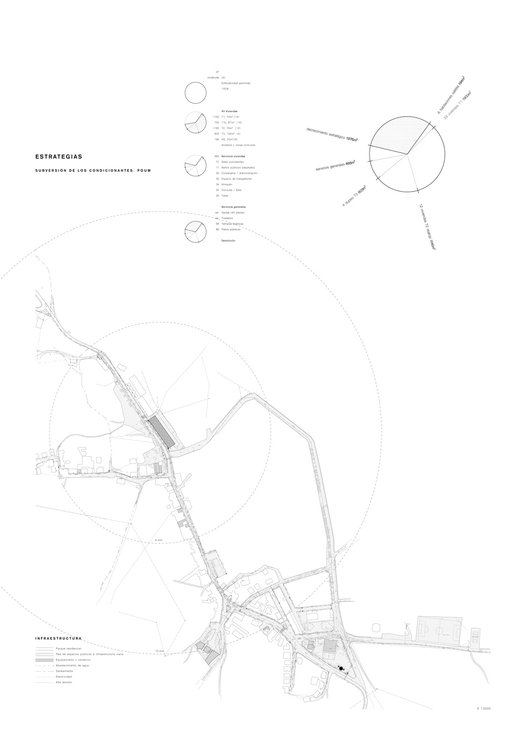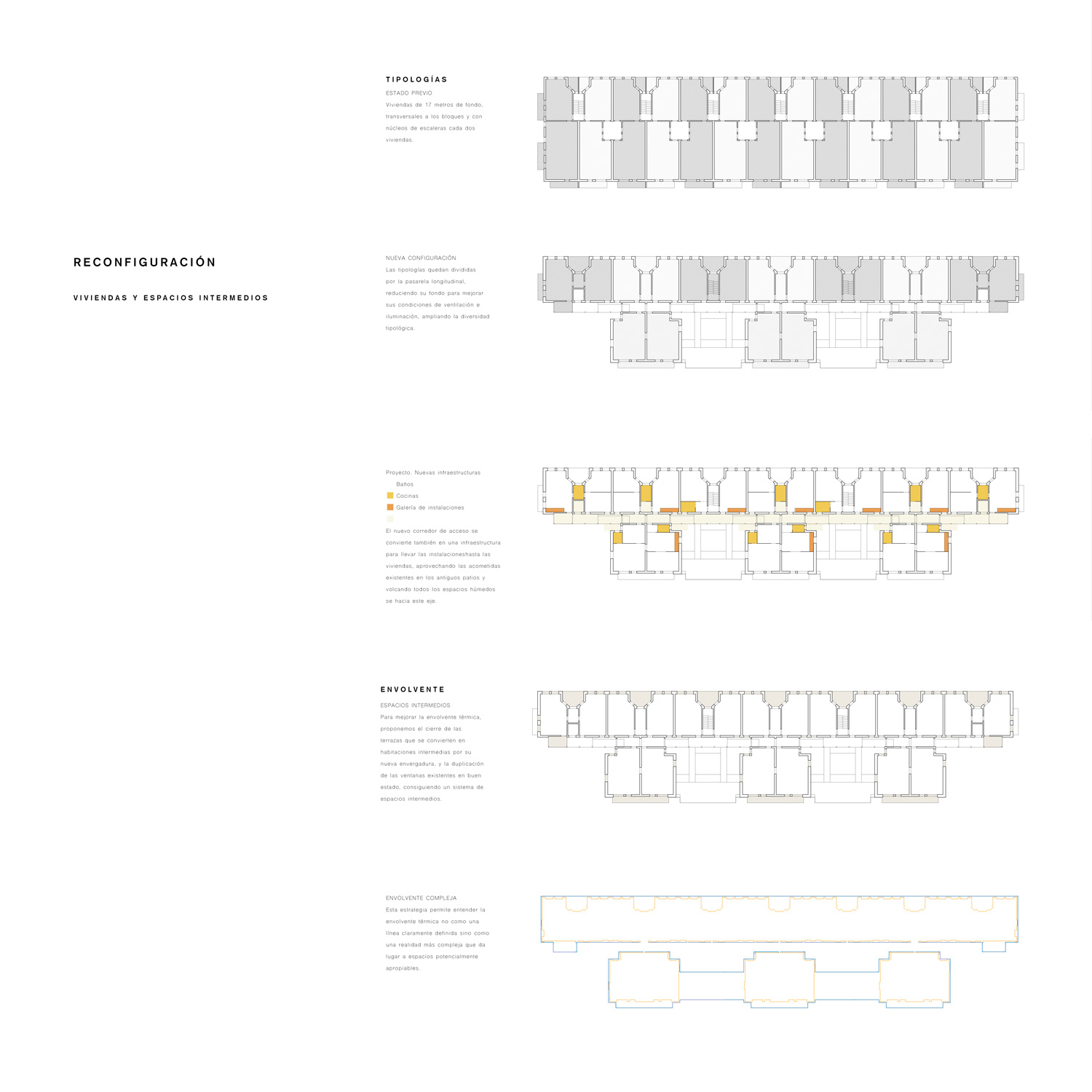 Cal Simó was built in 1965 to house the workers of the Puigneró factory in Sant Bartomeu del Grau. After the closure of the factory in 2003, these 70 dwellings experienced a gradual loss of inhabitants to a minimum of 8 currently occupied houses. With 62 empty houses (more than 66% of the locality), nowadays the building appears as an oversized structure for the town and its demand. The work shown here is based on the understanding that there is a cheaper way of intervention than rehabilitation, which is partial demolition. Even though being aware that this implies a loss of built volume, a strategic subtraction can entail an added value on the remaining structure resulting in a higher economic performance. In this sense, we understand that a strategic demolition on the most structurally compromised points enables to sponge the total volume improving key issues of the building such as accessibility or habitability. The privileged position of the building facing the landscape, the need of intervention on the structure in the back of the building, the poor state of the attached constructions… invite to develop a more intense intervention on the back of the volumes. We understand that in order to compete with the existing housing offer in the locality, it is necessary to generate substantial improvements in the lighting and ventilation of these dwellings. With this, 4 strong demolition operations are carried out on strategically selected points aiming to substantially correct the building’s problems while carrying contained operations in the rest of the volume. Once the surplus of built volume has been identified, the project aims to add value to the infrastructure through subtraction.