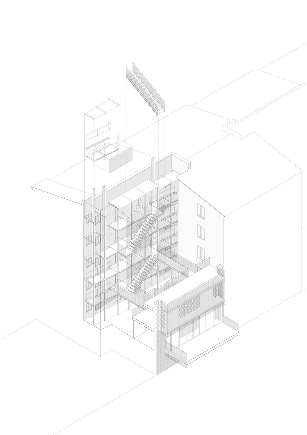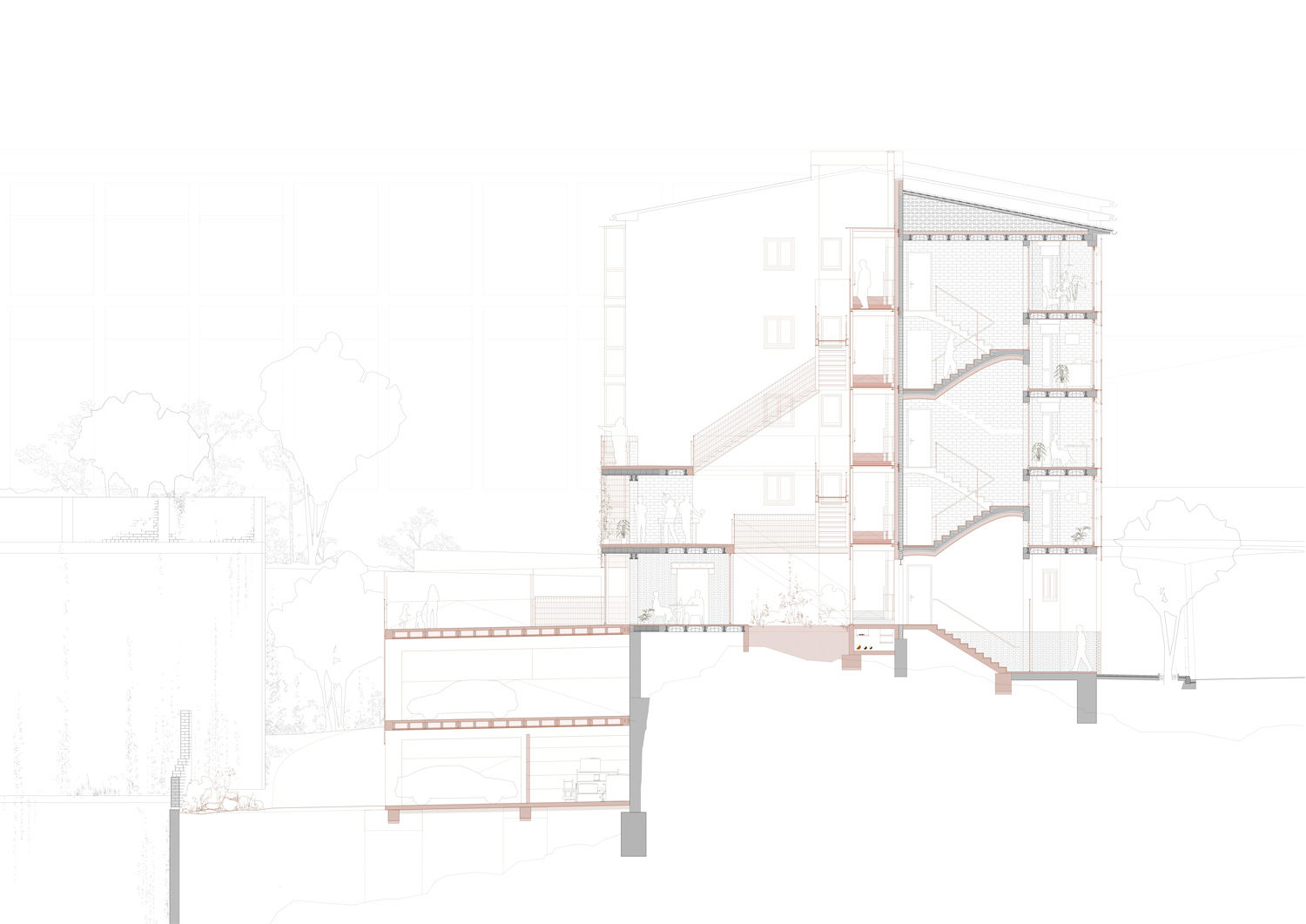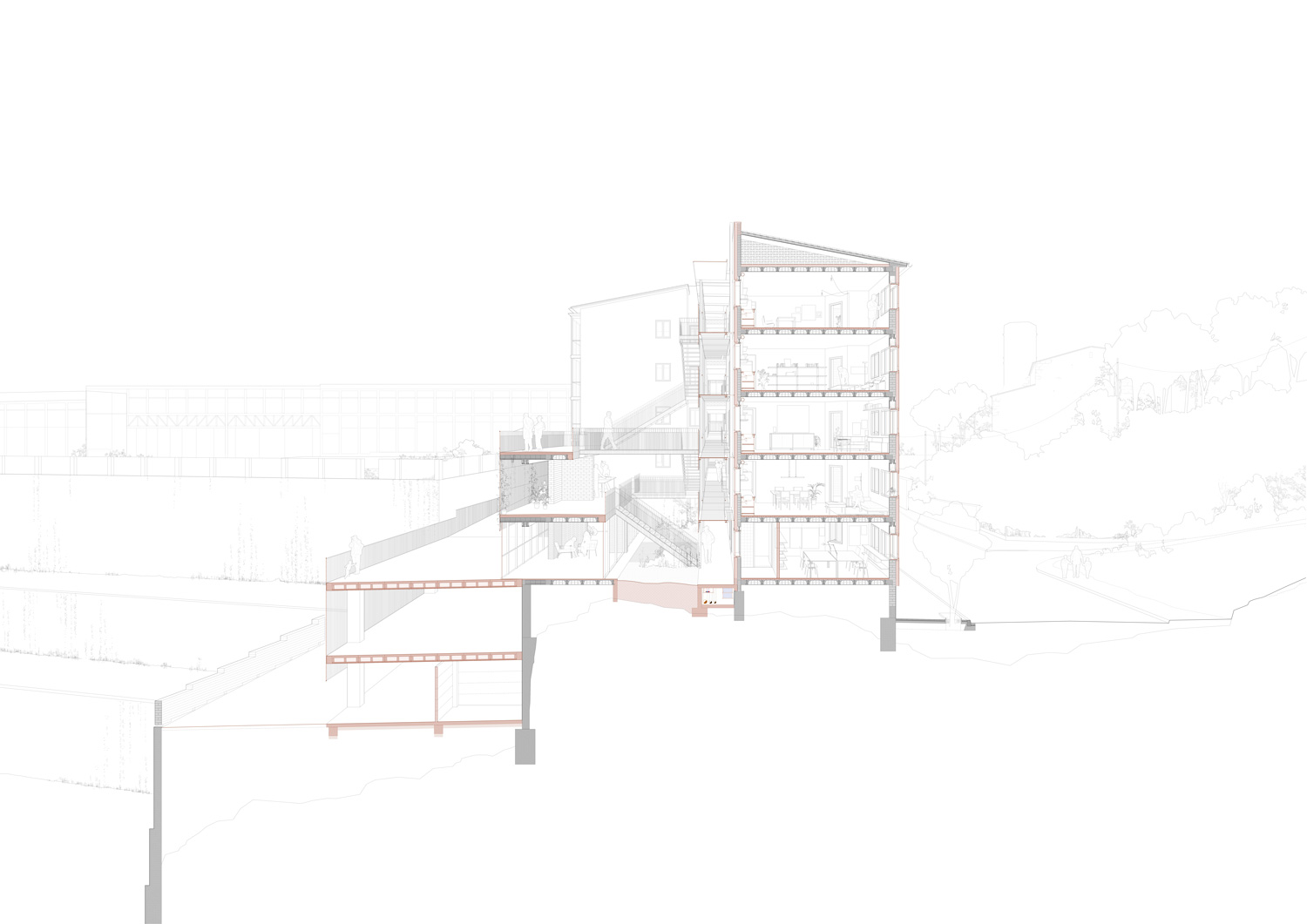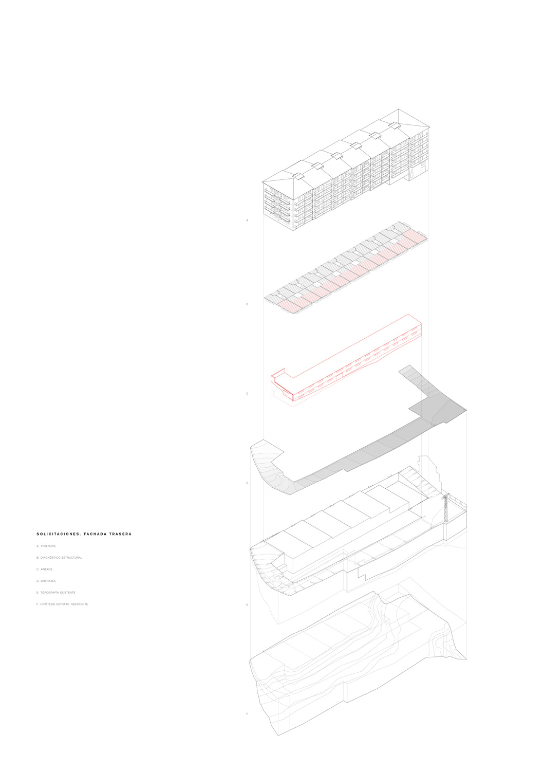 Cal Simó was built in 1965 to house the workers of the Puigneró factory in Sant Bartomeu del Grau. After the closure of the factory in 2003, these 70 dwellings experienced a gradual loss of inhabitants to a minimum of 8 currently occupied houses. With 62 empty houses (more than 66% of the locality), nowadays the building appears as an oversized structure for the town and its demand. The work shown here is based on the understanding that there is a cheaper way of intervention than rehabilitation, which is partial demolition. Even though being aware that this implies a loss of built volume, a strategic subtraction can entail an added value on the remaining structure resulting in a higher economic performance. In this sense, we understand that a strategic demolition on the most structurally compromised points enables to sponge the total volume improving key issues of the building such as accessibility or habitability. The privileged position of the building facing the landscape, the need of intervention on the structure in the back of the building, the poor state of the attached constructions… invite to develop a more intense intervention on the back of the volumes. We understand that in order to compete with the existing housing offer in the locality, it is necessary to generate substantial improvements in the lighting and ventilation of these dwellings. With this, 4 strong demolition operations are carried out on strategically selected points aiming to substantially correct the building’s problems while carrying contained operations in the rest of the volume. Once the surplus of built volume has been identified, the project aims to add value to the infrastructure through subtraction.