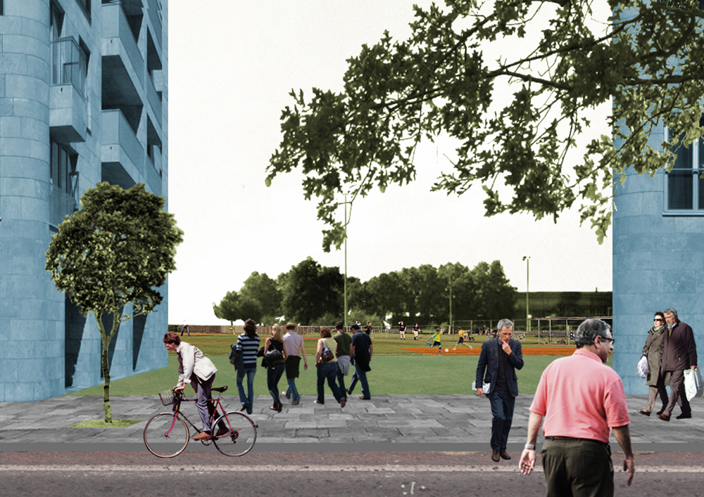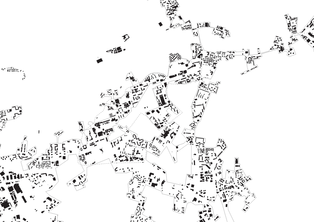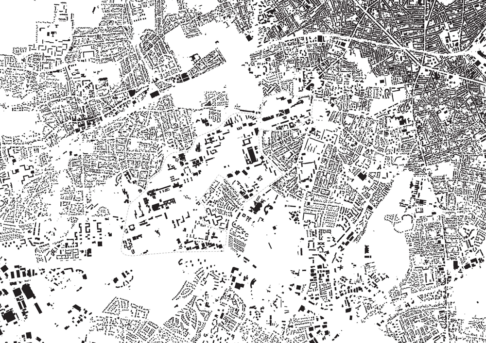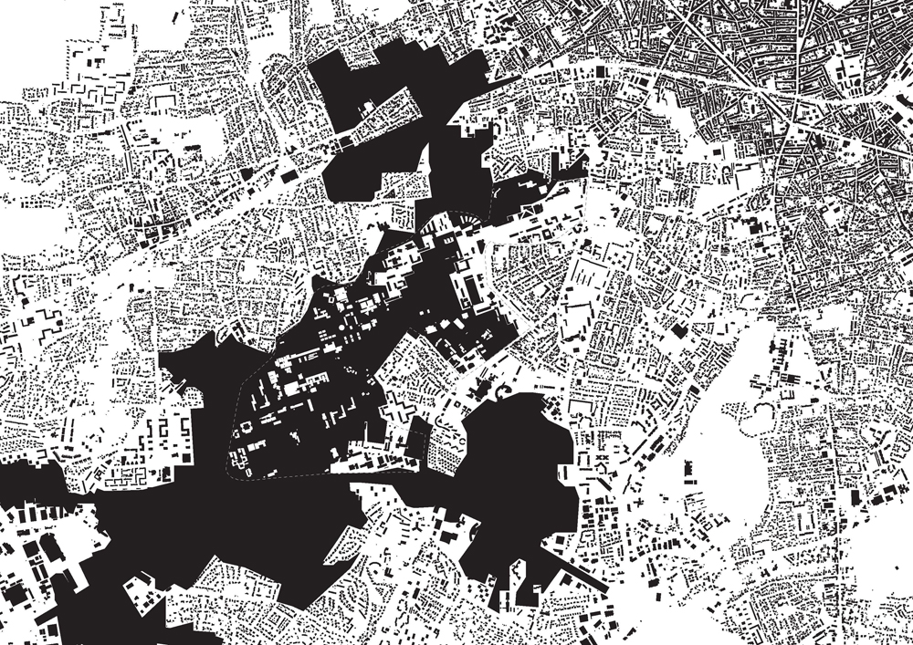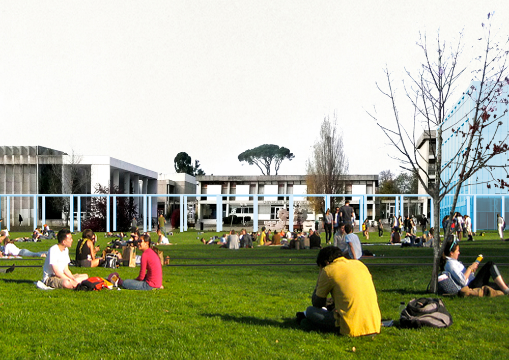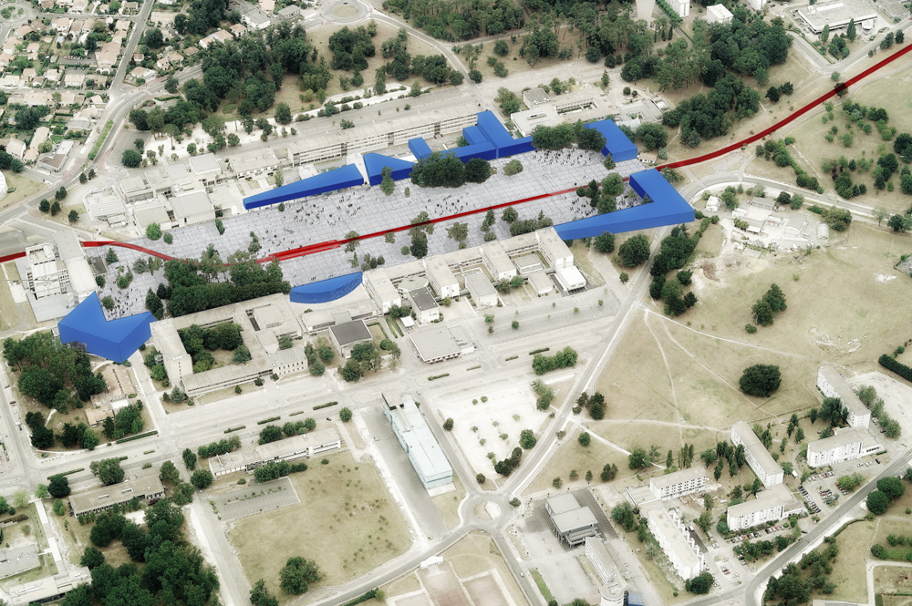 Les limites du Campus sont à l’intérieur de celui-ci. Nous proposons 3 pôles. Ils s’organisent autour de 3 arrêts de tramway une « Piazza » universitaire, une promenade urbaine et un cœur de Parc Régional, ils sont l’image du Campus, son label. Le secteur Ouest, pour lequel nous sommes plus précisément missionnés, se coordonne donc autour d’une “Piazza” correspondant à l’arrêt de Tram Montaigne-Montesquieu. Ici sont concentrés tous les programmes déjà définis permettant le déroulement de la vie Universitaire, de l’échange : une polarité étudiante dense et forte. A cette stratégie exclusive, vient s’additionner une logique plus opportuniste et en même temps prospective. Des morphologies en rapport avec une programmation de logement, de service et de commerces de proximité, viennent se positionner en fonction de qualités spécifiques relevées : ouverture sur un bois, proximité de terrains de sport, accessibilité, surface déjà imperméabilisées (stationnement, terrains abandonnés) et réutilisables. Plus qu’une stratégie intransigeante, nous proposons par-dessus tout une tactique d’organisation du Campus, appropriable et partagée par l’ensemble des acteurs alternant éléments durs et parties négociées.