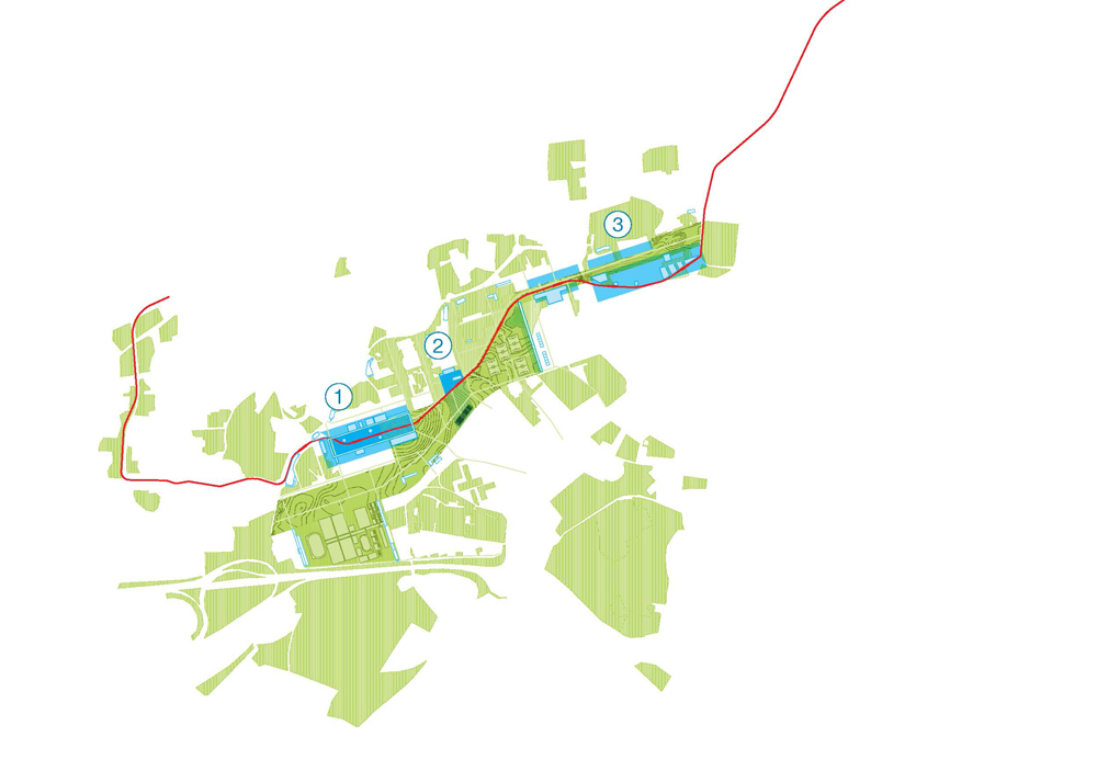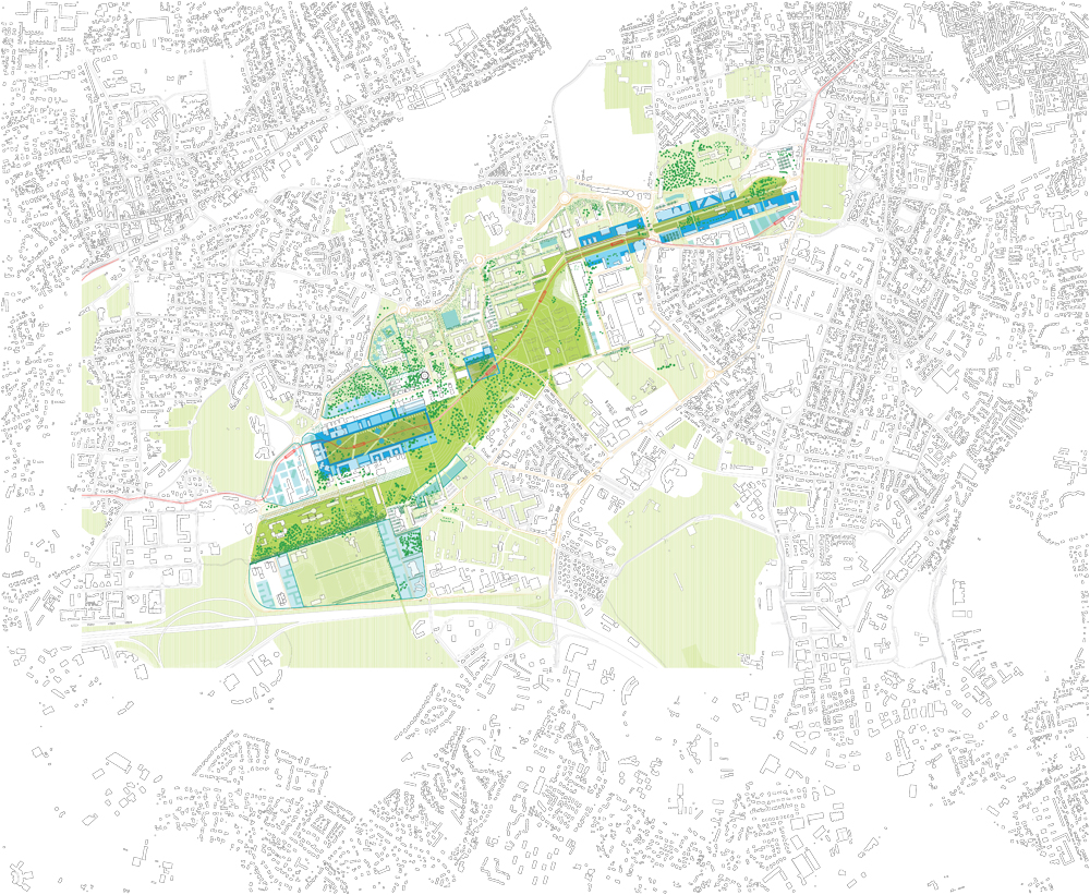 Ceci correspond à l’implantation de 5000 à 7500 logements et à la réorganisation des fonctions universitaires du Campus en divisant celui-ci en 3 entités, le Lot Est dont Architecture Studio est mandataire, le Lot Centre avec l’agence TER, et le Lot Ouest dons nous assurons la direction. Un premier constat est le suivant : le plan guide de Sainsaulieu (architecte urbaniste à l’origine de la création du Campus) ne s’est pas totalement réalisé. Depuis, d’autres logiques urbaines sont apparues, un autre contexte s’est constitué. A une emprise et une urbanisation tramée prévue pour être homogène et totale, s’est substituée une logique de territoires, de polarités, parfois transversales au Campus, il serait vain de remettre en cause cette situation mais plutôt de lui donner du sens et de la cohérence en poussant ce qui existe déjà, en confortant en polarités fortes ce qui était déjà des intensités fragiles.
