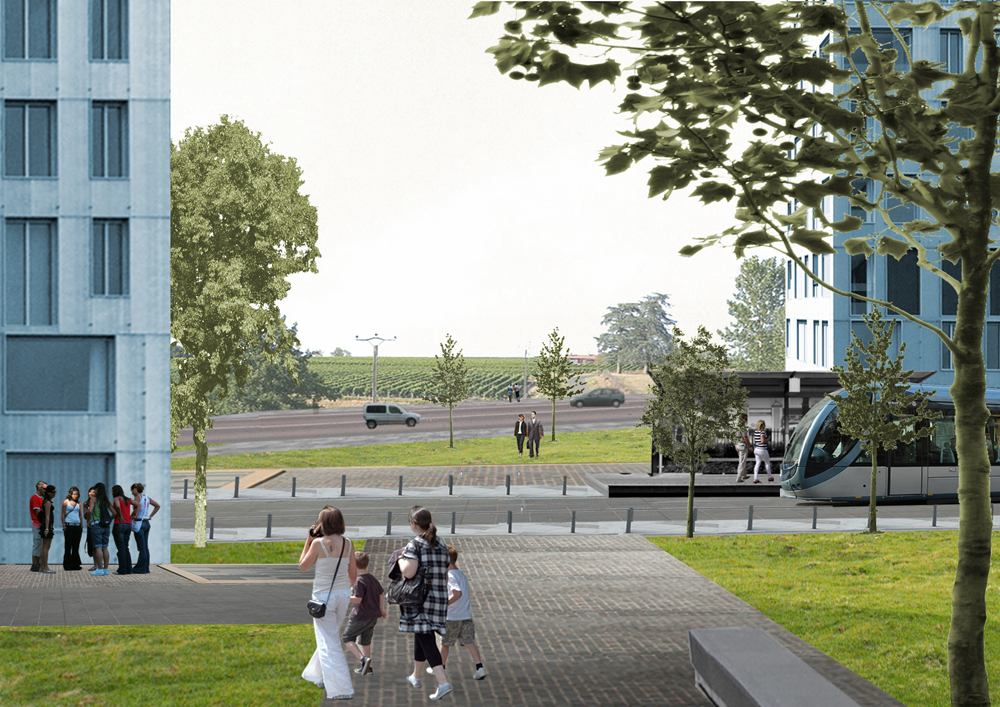 Le campus de TPG de Bordeaux est déconnecté de son territoire, il n’entretient pas de rapport avec les villes qui l’entourent. Mais ce n’est pas tout, il est lui-même porteur de problème d’image, de lisibilité… L’espace libre, pourtant généreux (le Campus TPG, 90ha est le 2ème plus grand Campus d’Europe avec 60 000 étudiants) a tendance à donner la sensation d’enfermement dans un désert démultipliant les places de stationnement, les vestiges d’espace public. Les arrêts de Tram n’ont pas particulièrement occasionné de dynamisme autour d’eux, le Parc n’est pas prégnant, il a tendance à s’émietter en espaces peu qualitatifs. L’objectif de l’étude, tel qu’il est définit par la maîtrise d’ouvrage, est « la réalisation d’études de programmation architecturale urbaine et paysagère dans le but d’assurer le développement optimisé et harmonieux du Campus et son intégration à la Ville, sans dissoudre son identité […] dans un délai de 10 à 15 ans ».