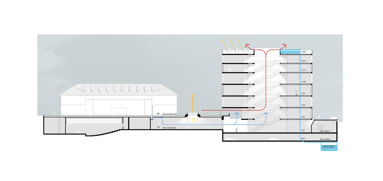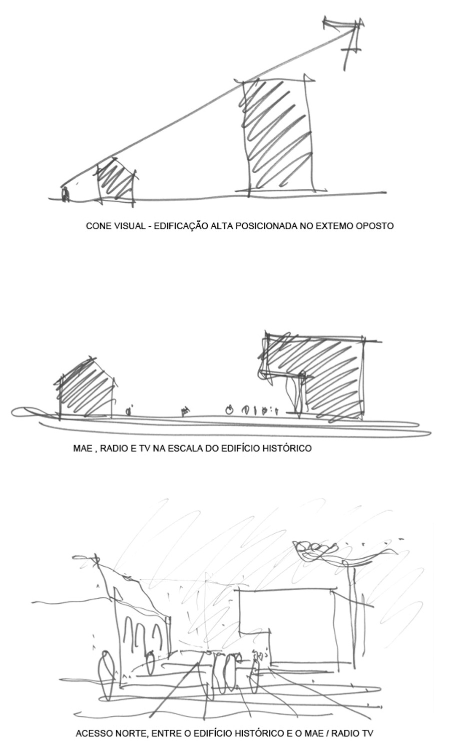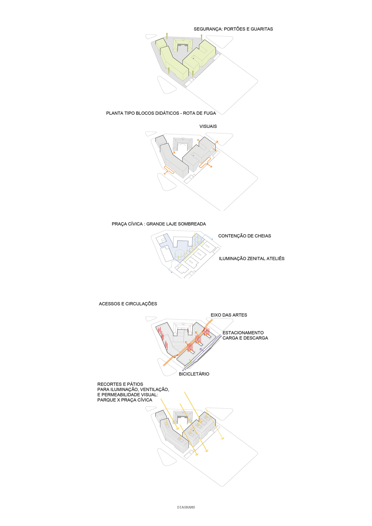 O projeto para o concurso do Campus Cabral – futura sede dos Cursos de Cominicação, Design e Artes – se diferencia de um espaço institucional educativo convencional por sua clara vocação para a criação artística, isto é, sua construção pode também ser entendida como um grande laboratório para as artes. O desafia lançado foi o de construir um lugar – um Campus Universitário Urbano – em duas etapas de concretização. Projetar a parte e o todo, de forma a criar um conjunto coerente na primeira etapa e seu ‘complemento independente’ na segunda etapa. Duas paisagens edificadas, independentes em sua execução e período de concretização, mas complementares em sua funcionalidade e, principalmente, na criação de seu lugar como paisagem institucional.