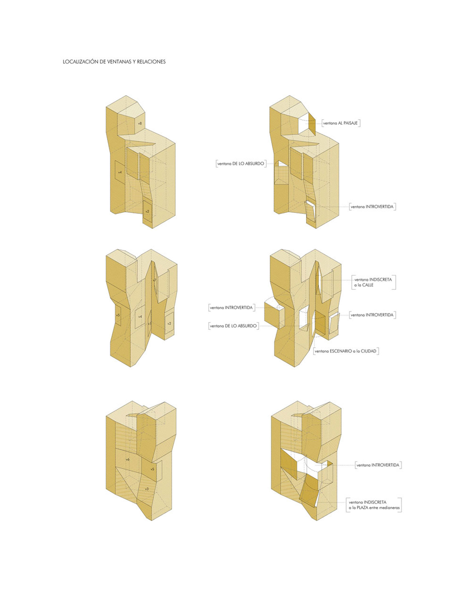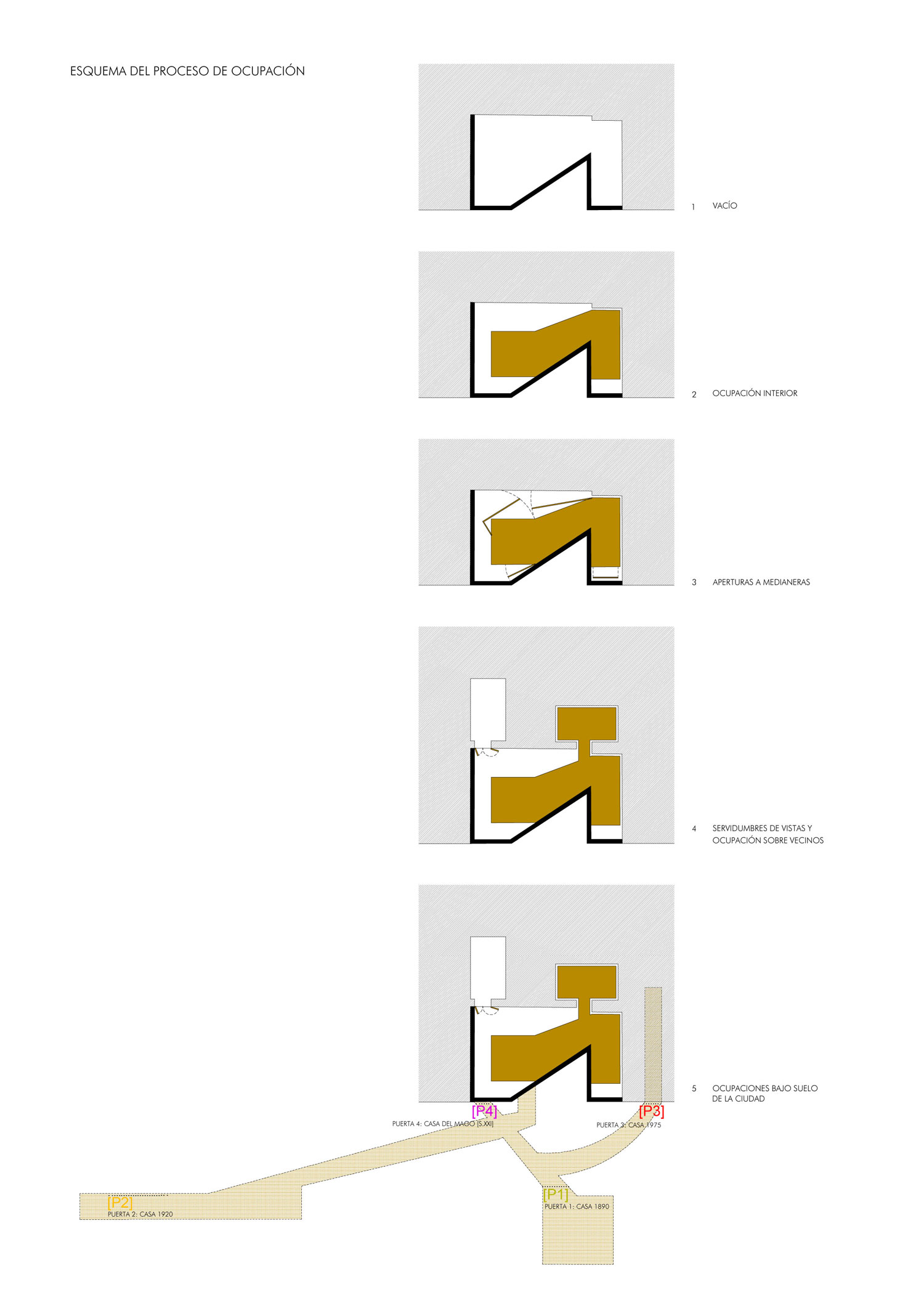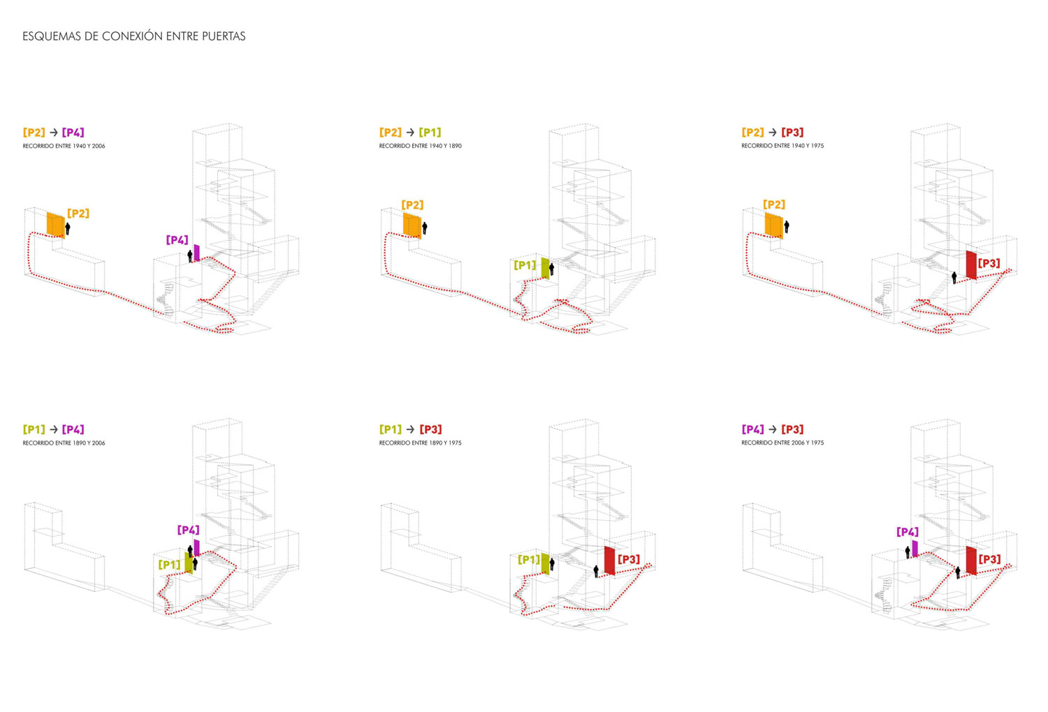 Para llevar a cabo esta idea se han elegido tres arquitecturas próximas existentes correspondientes a tres casas de épocas diferentes, una de finales del s.XIX, otra de 1920 de carácter historicista, y la última, de 1975, perteneciente a la etapa desarrollista. Cada una de ellas dispone de un espacio reservado en planta baja, y simbólicamente representan un umbral de tiempos que configuran una secuencia de entradas diferentes que nos transportan a una cuarta casa de nueva construcción. La comunicación entre ellas se produce a través de una serie de conexiones subterráneas, laberintos de lo absurdo que nos trasladan en el tiempo. Tres caminos que desembocan en un mismo lugar o en lugares diferentes y que sólo tienen sentido vistos en conjunto. Podemos acceder a una estancia del XIX para desembocar en un espacio del XXI o circular de adelante para atrás como si estuviéramos en un túnel del tiempo. Las cuatro casas elegidas hacen referencia a cuatro tiempos de la historia de la ciudad, cuatro puertas que nos conducen a cuatro espacios con características diferentes, como los cuatro naipes de una baraja.