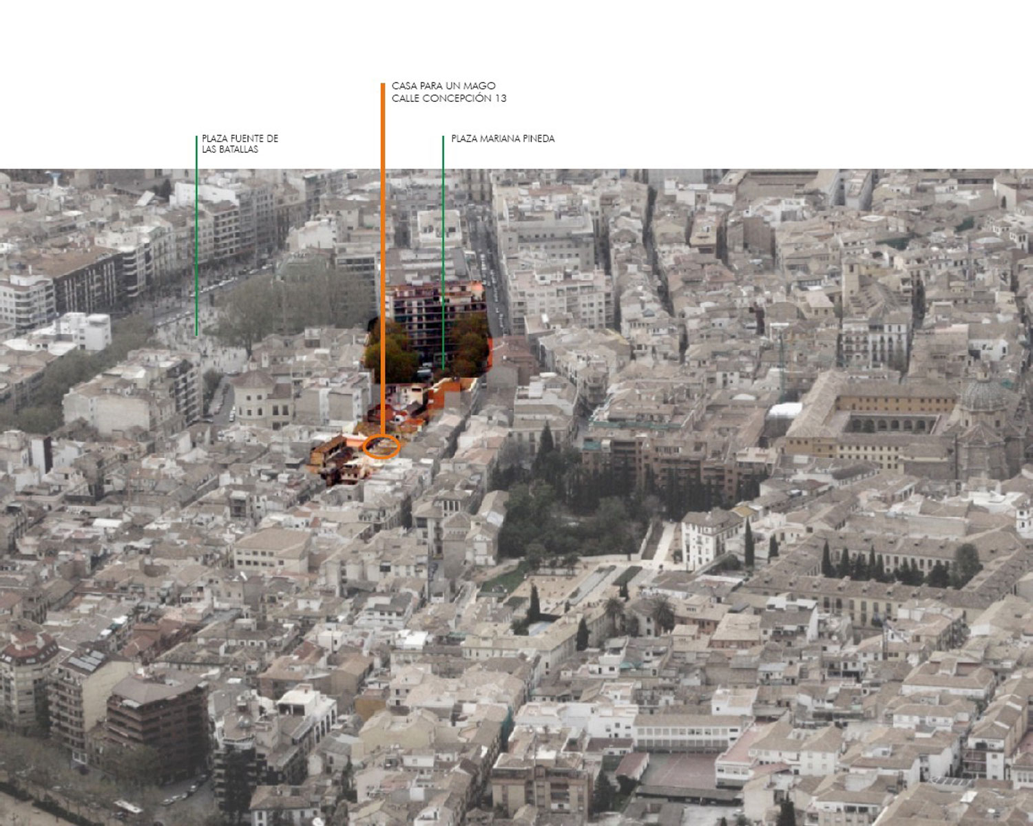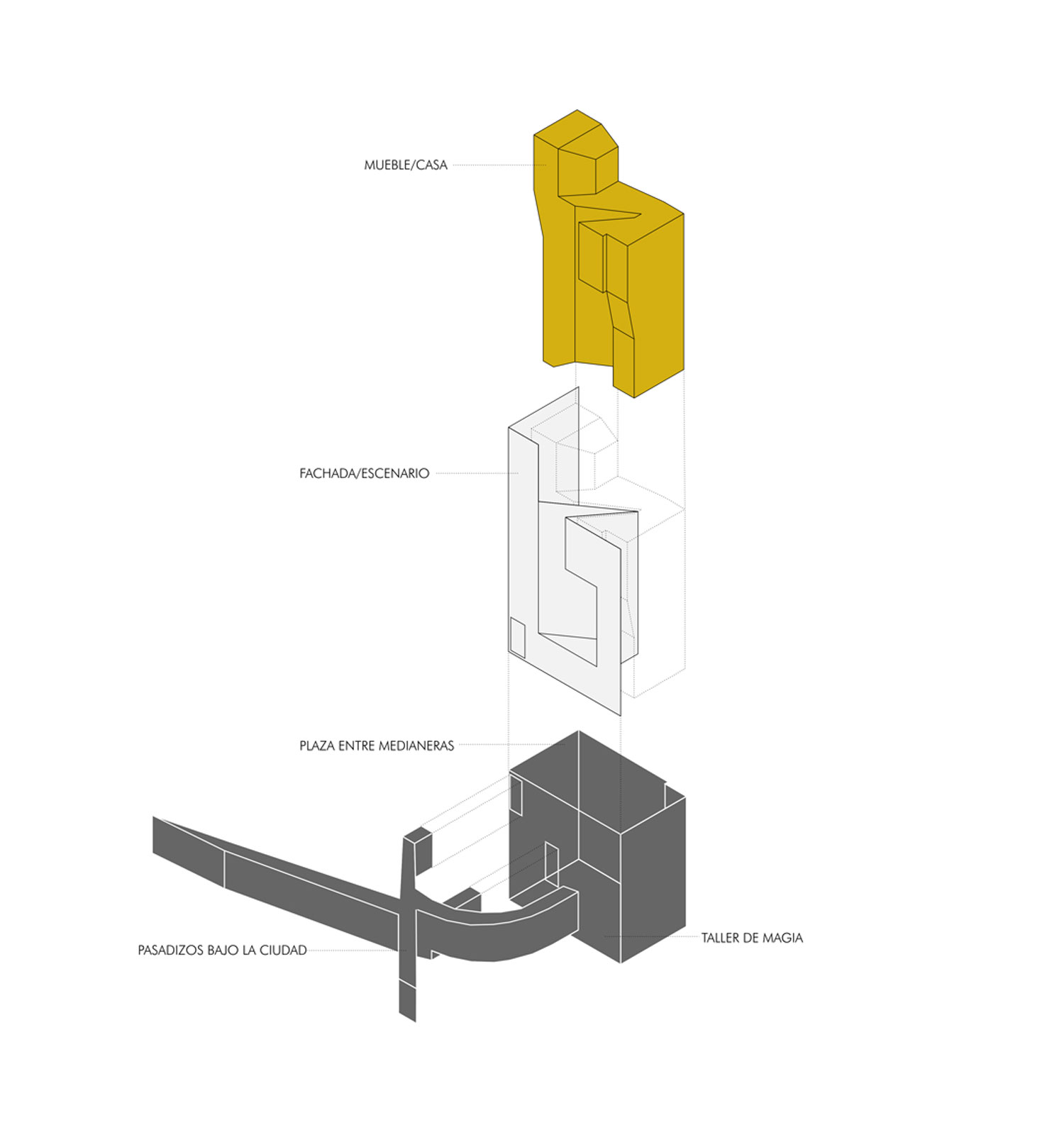 La magia convierte la fantasía en realidad, hace participar un hecho común de acontecimientos extraordinarios. Una casa para un mago es un espacio misterioso como lo son su chistera o el baúl de trabajo, en los que la ilusión y los secretos forman parte indivisible de una realidad cotidiana. Ver un mago en acción es una experiencia fascinante, se asiste con naturalidad a situaciones inexplicables, cosas jamás vistas que nos colocan fuera de toda lógica. Con la magia es posible, por ejemplo, hacer realidad el sueño de poseer simultáneamente en una misma casa varias de estilos y épocas diferentes; o mejor aún, diferentes casas que convergen en una sola. Imaginemos un espacio en la ciudad histórica al que pudiéramos acceder a conveniencia desde construcciones distintas, desplazándonos entre edificaciones que nada tienen que ver entre si. El resultado sería una arquitectura comunicada por estancias temporales que como en el “original hombre transportado” nos permite decidir en cada momento la ocupación deseada.