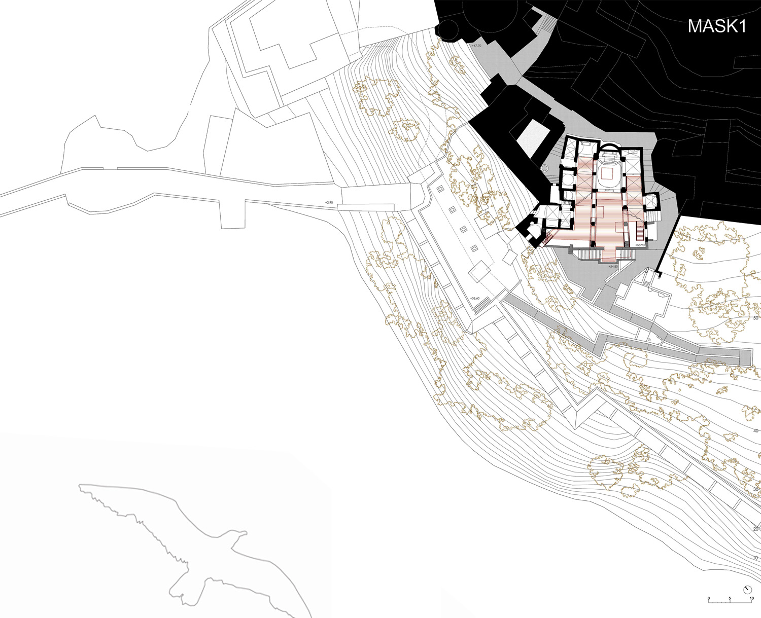 Una Máscara envolvente que evoque el espacio mediterráneo de la Catedral, un gran vacío blanco abierto al mar, y le ofrezca la necesaria protección a los elementos más delicados, permitiendo el transcurrir de las instalaciones entre sus dobleces. La superficie de la máscara discurrirá por muros, suelo y cubierta, recortada allí donde queramos fijar la mirada e inducir recorridos, y trepará por la torre para permitir la visión perdida con el tiempo. Actuará como una protección frágil, de emergencia, que preserve la presencia inacabada de la catedral como una realidad vinculada definitivamente al paisaje y a la topografía del Castello Aragonese.