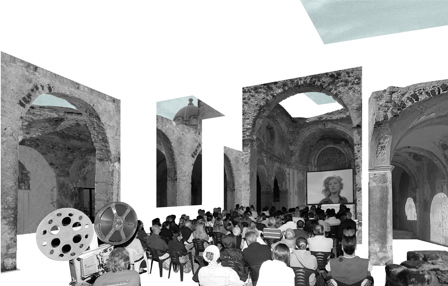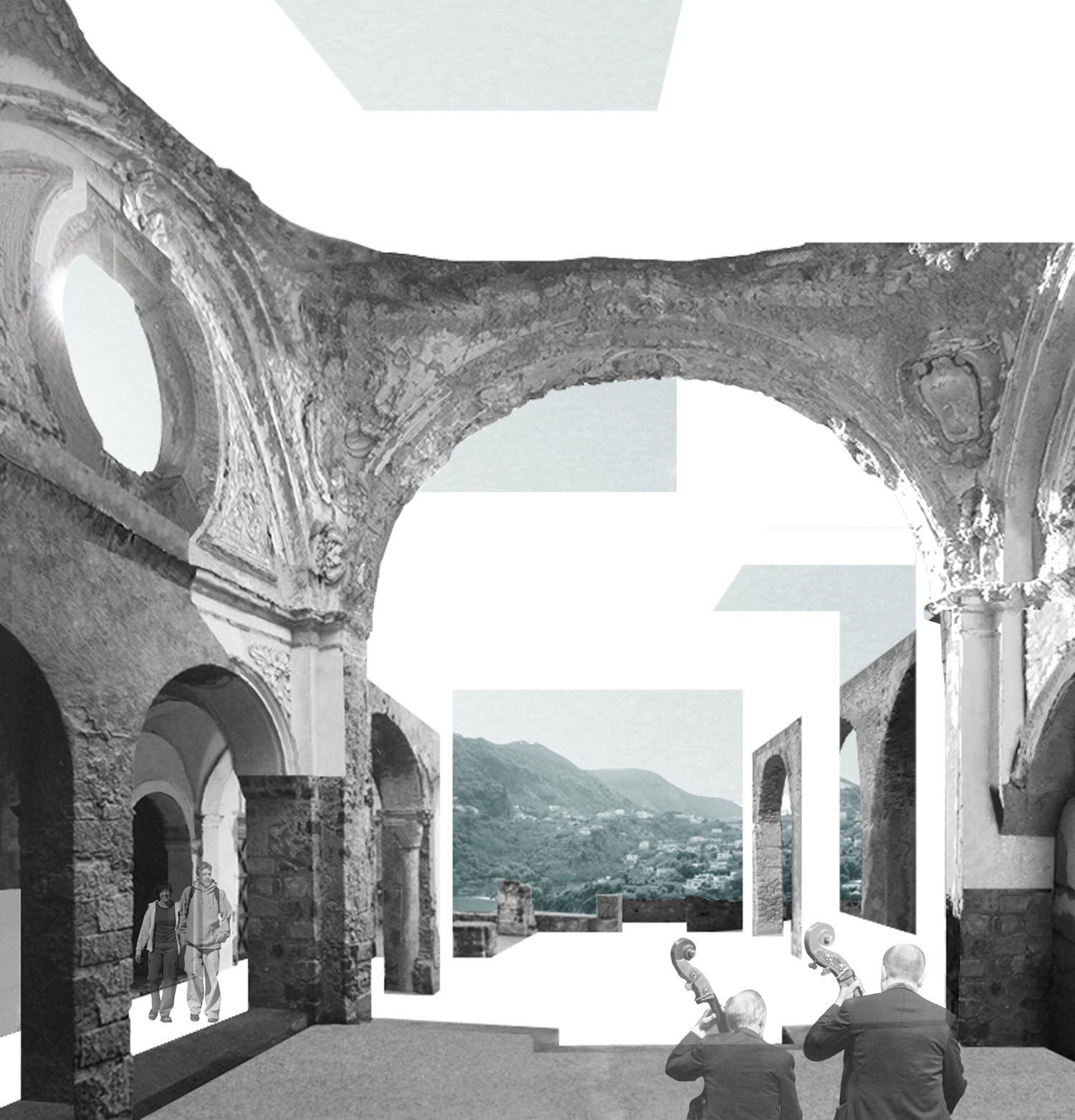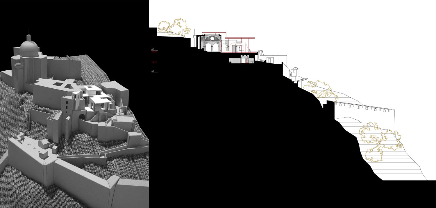 Recuperar la nave blanca, la mirada axial desde el gran hueco abierto al mar y la cota perdida del campanario son intervenciones que atienden a las ausencias, a aquello que desapareció con en el tiempo pero que hoy podemos recobrar como verdadera esencia de la Catedral. Proponemos tejer una camisa que vista la ruina, ofreciendo refugio a ésta y enmarcando mediante recortes superpuestos los elementos que constituyen la realidad esencial de la Catedral: los elementos constructivos (el arco y el muro), los stucchi settecenteschi, las miradas sobre el paisaje y la relación con el Castello Aragonese.