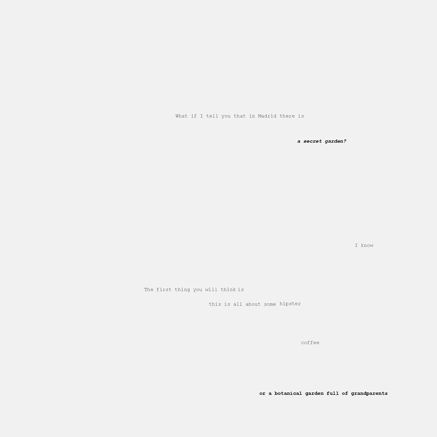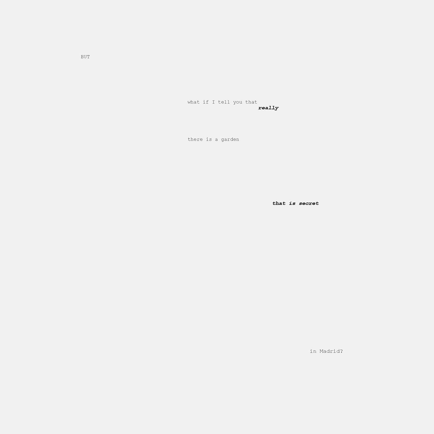 Nosotros vamos a ponerle una guinda al pastel. Imaginamos en la Calle Candanchú un jardín secreto, oculto tras sus cuatro muros. Un paraíso contemporáneo concebido exclusivamente como un espacio donde poder leer en calma. La única manera de acceder a este espacio es utilizando el código que portan los libros prestados en cualquier biblioteca de la ciudad. El libro es la llave. No es una metáfora. Es necesario llevarlo consigo, transportarlo por la ciudad y escanear el código en la única puerta que hay en la gran tapia.