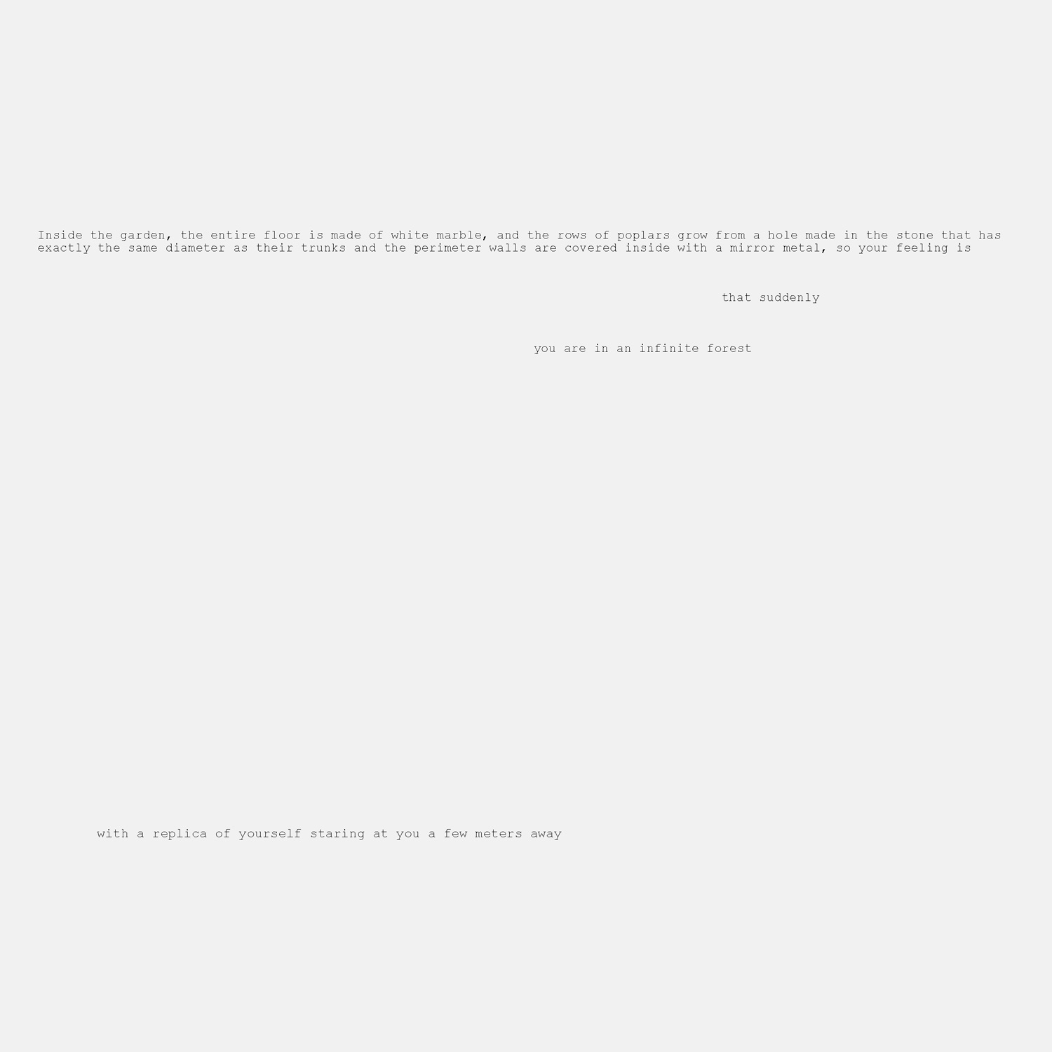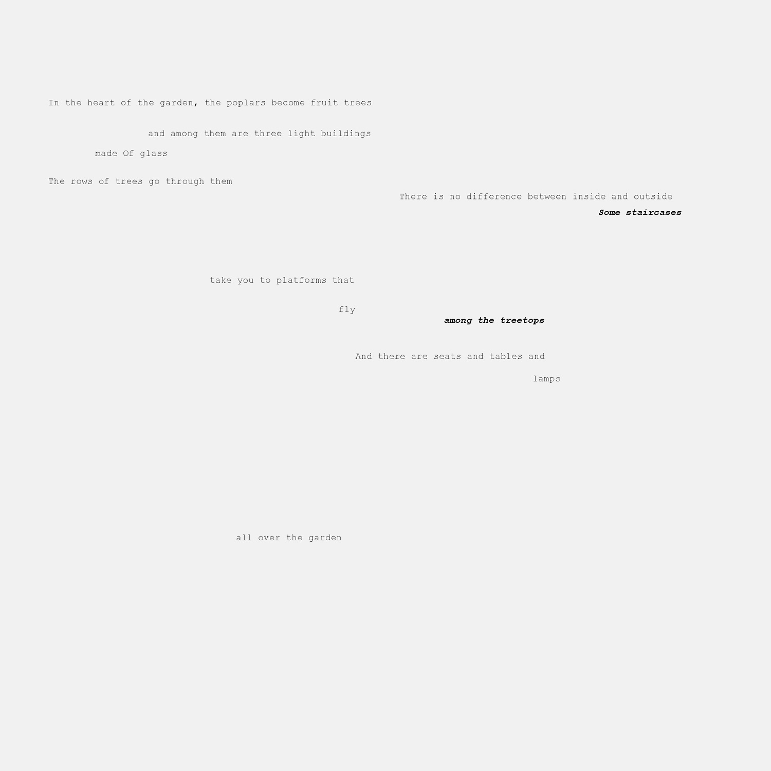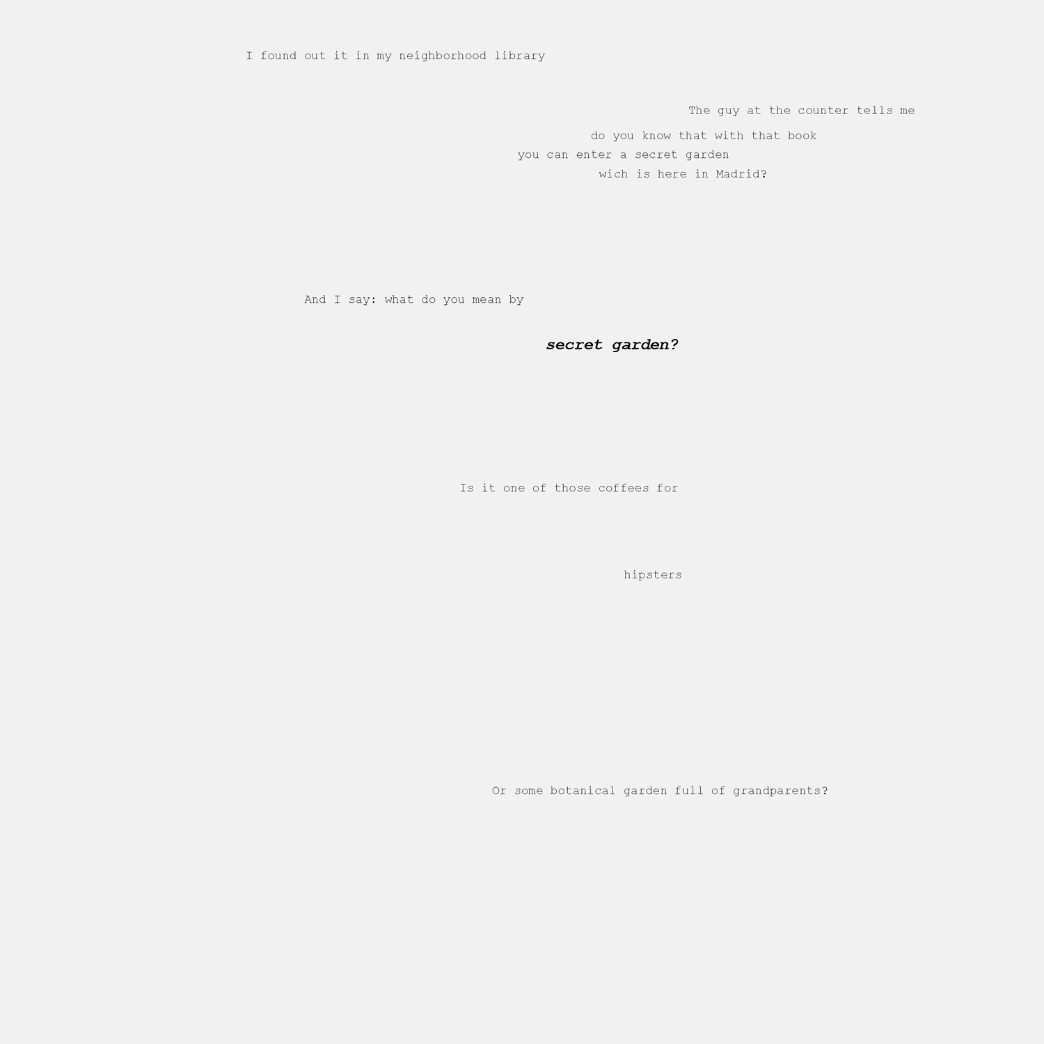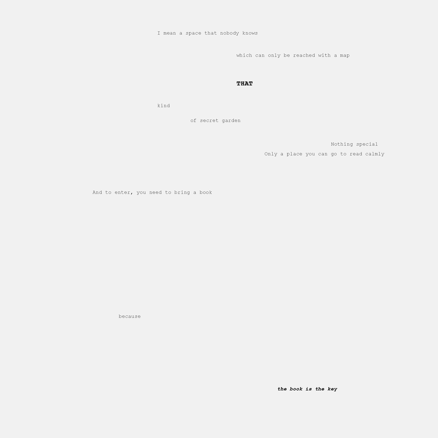 Así mismo, la única forma de localizar el lugar exacto donde se encuentra el jardín es a través del mapa que se entrega junto al libro prestado en la biblioteca de origen y que sirve al mismo tiempo como separador de páginas. Frente al ya establecido modelo de edificio público abierto y llamativo, proponemos un edificio envuelto en misterio, el cual es necesario encontrar a través de un mapa y al que solo se puede acceder llevando un libro. Erotismo frente a pornografía. La red de bibliotecas de Nueva York querrá un sitio así. Y la de Tokyo.