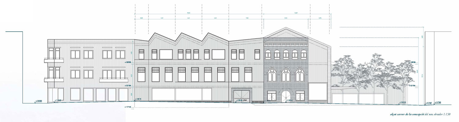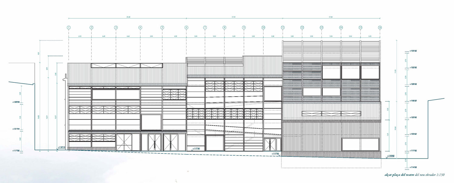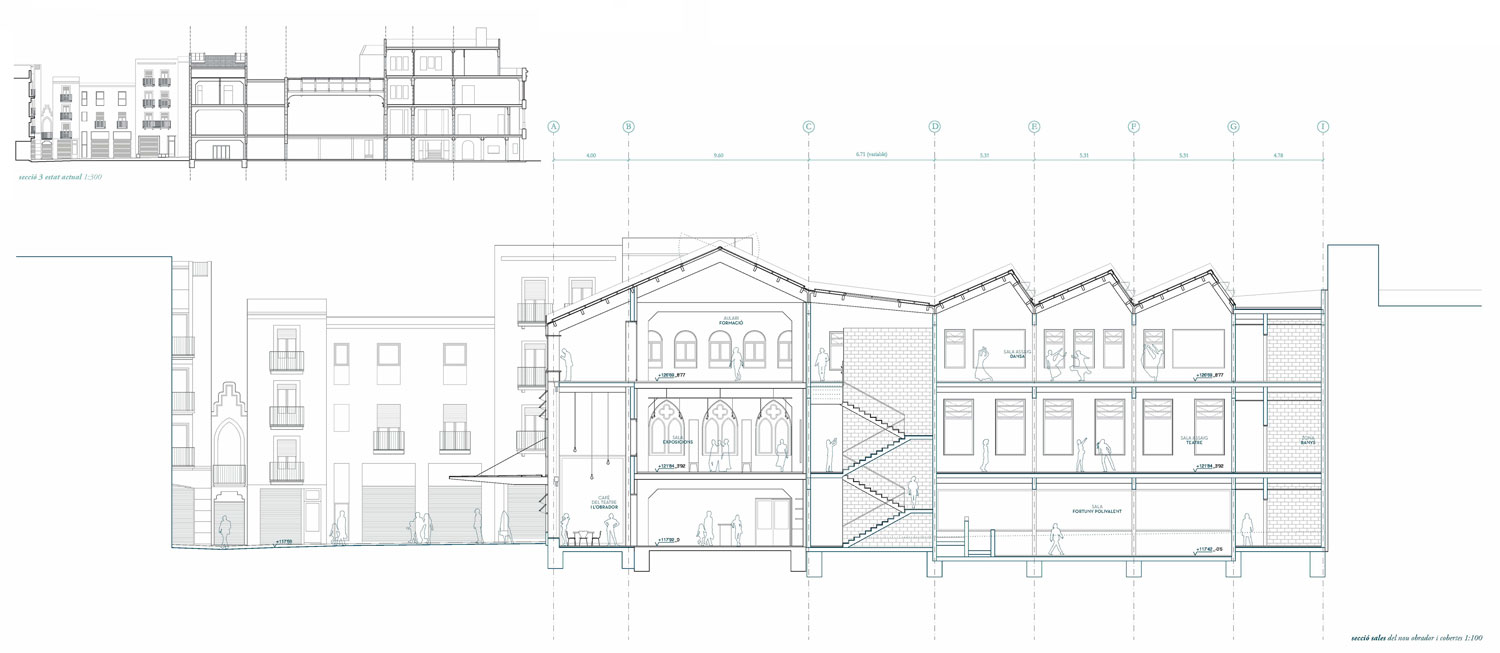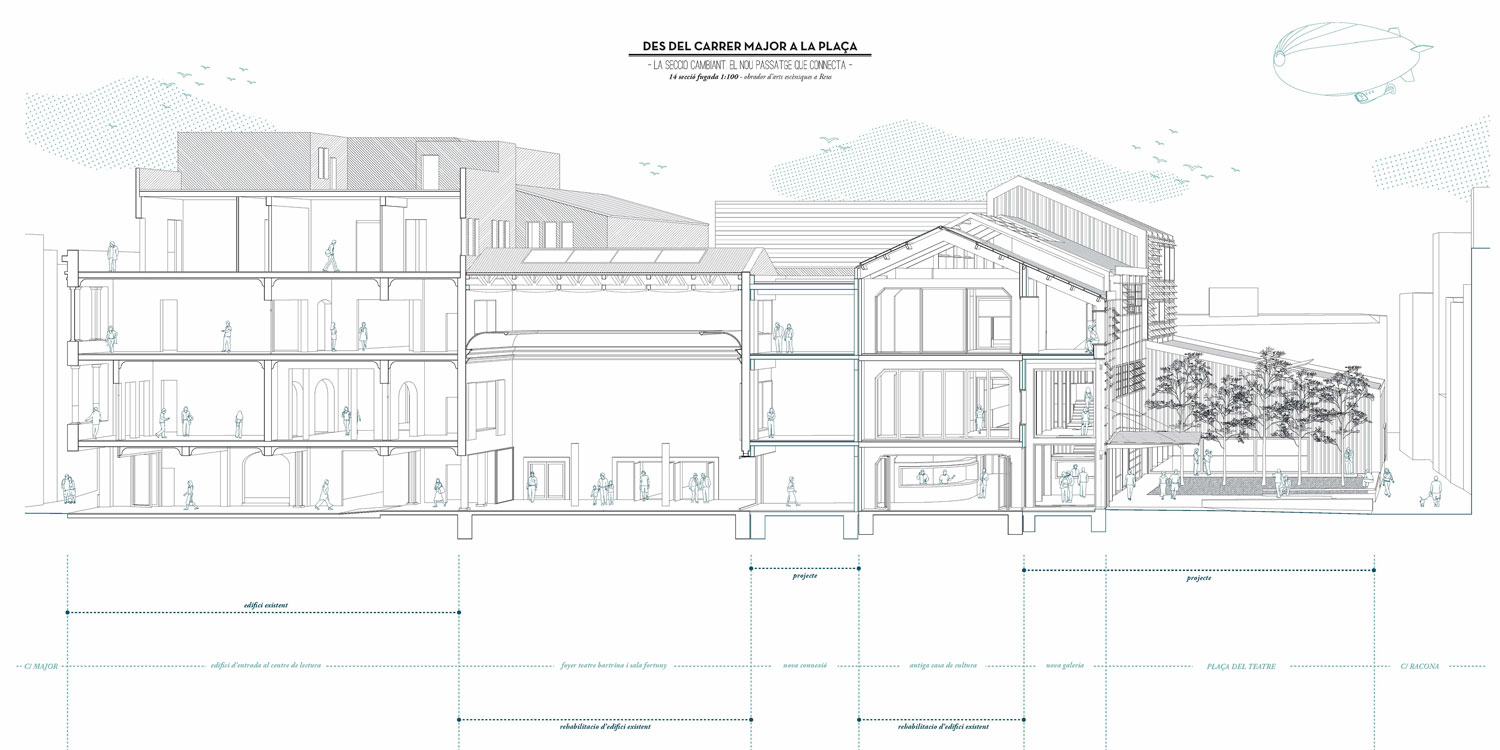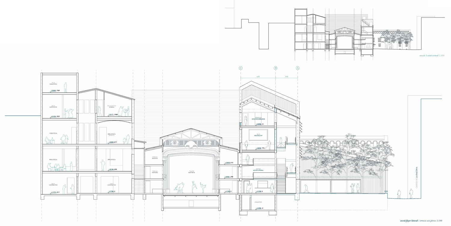 A new passage merges the historical entrance of the center and the new one placed in the Theater Square, creating a visual and physical connection between the main street and the renovated square in the ground floor. The passage also links the two main restored halls of the theater and it is also the nexus for the entire public program: a new cafeteria, the information point, the box office for the theater and the new multi-functional space. The proposed structural steel frames and the sloped roofs contain the new theater and dance practice studios in the upper floors. The 4 meter wide gallery wraps the existing backstage theater building and the ‘Culture House’ party wall creating a new circulation space which allocates the stairs and ramps that join the different section of the existing buildings, and also generates a new representative glass facade in the Theatre Square. The intervention ends with the new volume between the ‘Culture House’ and a residential building in Concepció street. This northern facade has more inertia, its openings are rhythmic empathizing with the ‘Culture House’ composition and it is materialized in a wavy corrugated aluminum panel. The project’s identity aims to boost the relationship between the public space, the people and the Center for the performing arts, building a strong synergy and invigorating its social character.