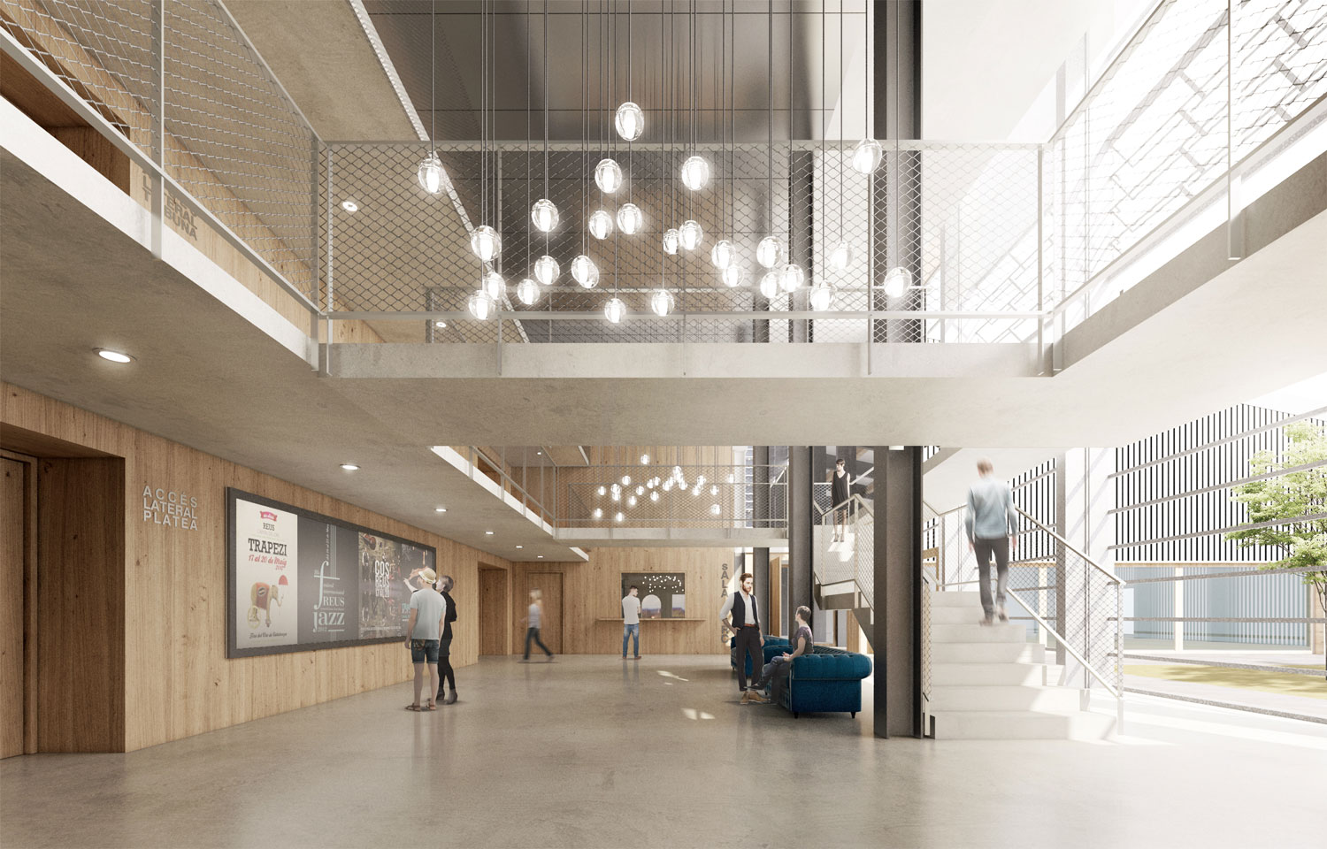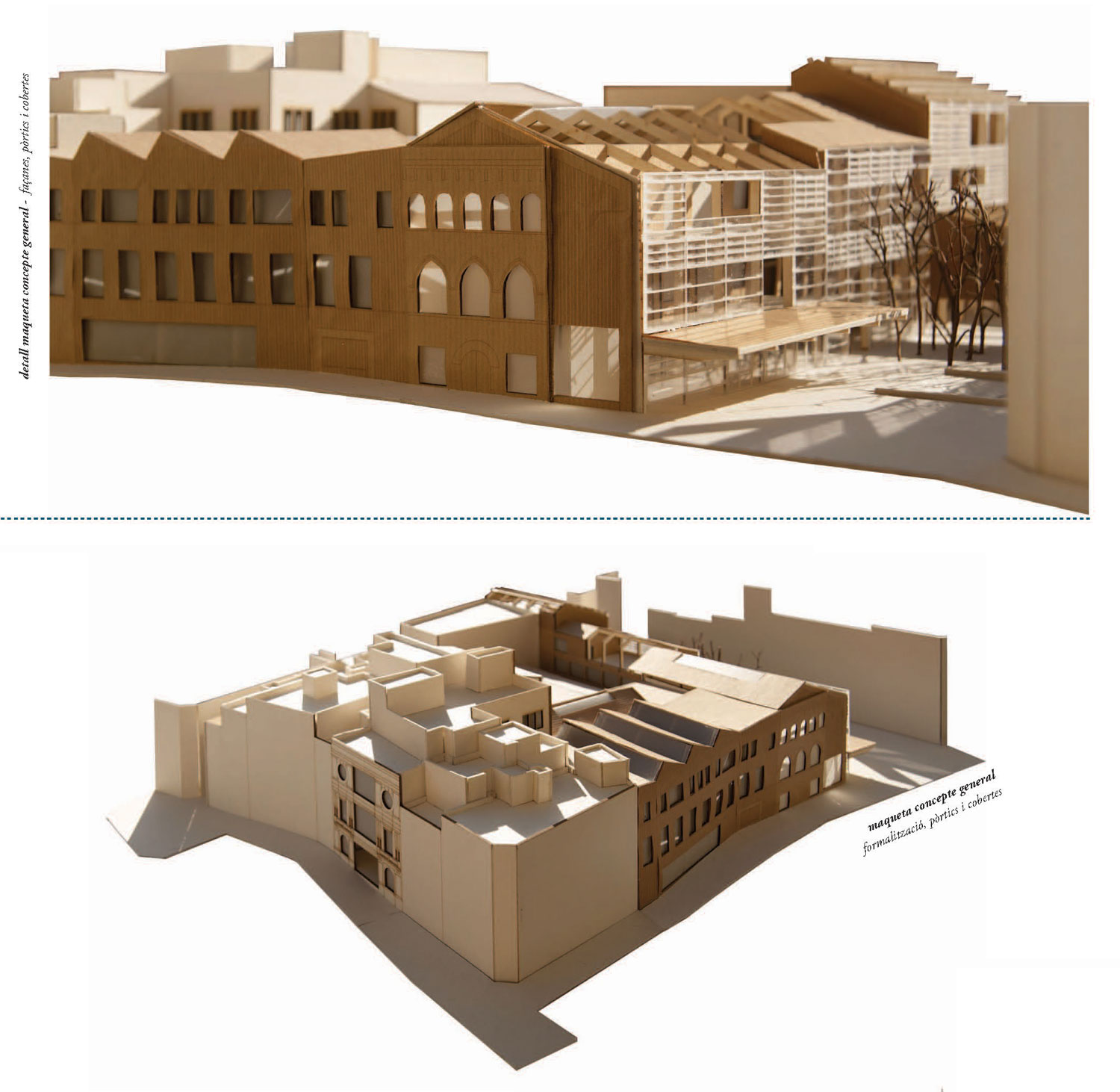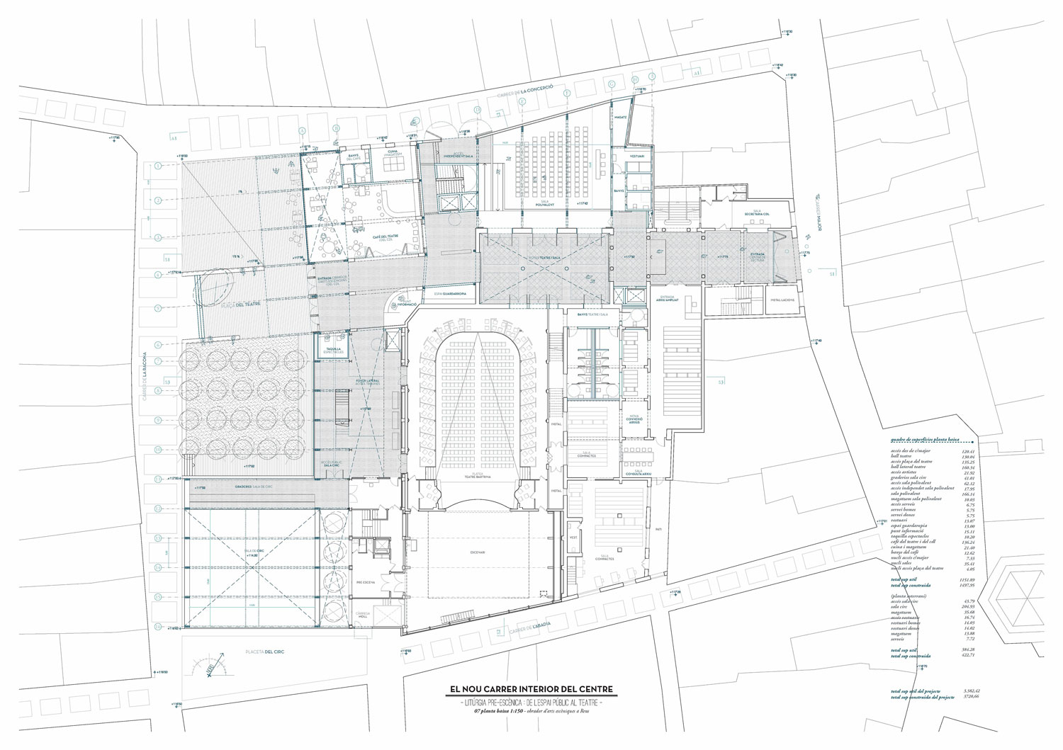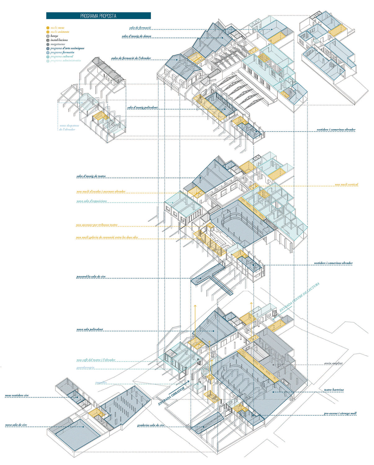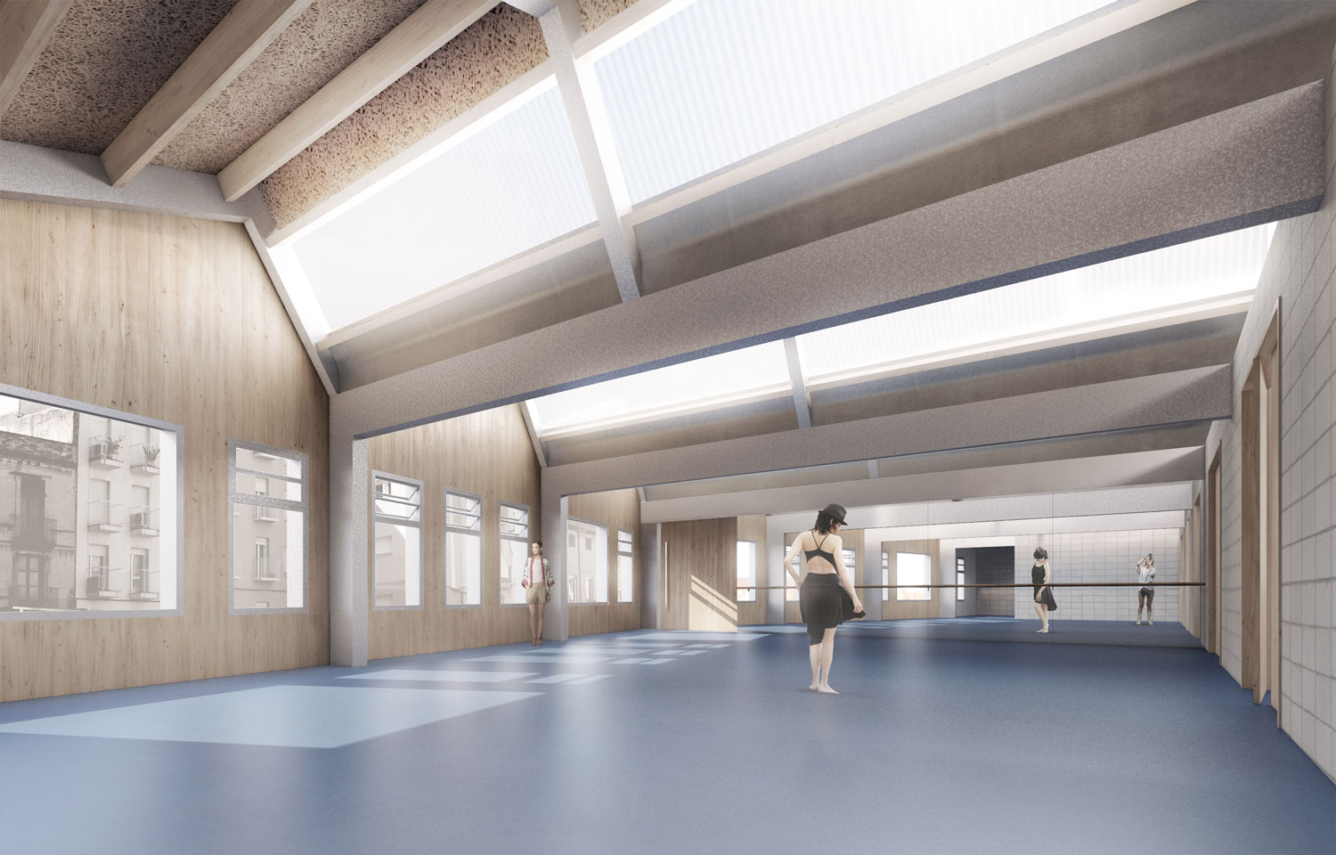 A new passage merges the historical entrance of the center and the new one placed in the Theater Square, creating a visual and physical connection between the main street and the renovated square in the ground floor. The passage also links the two main restored halls of the theater and it is also the nexus for the entire public program: a new cafeteria, the information point, the box office for the theater and the new multi-functional space. The proposed structural steel frames and the sloped roofs contain the new theater and dance practice studios in the upper floors. The 4 meter wide gallery wraps the existing backstage theater building and the ‘Culture House’ party wall creating a new circulation space which allocates the stairs and ramps that join the different section of the existing buildings, and also generates a new representative glass facade in the Theatre Square. The intervention ends with the new volume between the ‘Culture House’ and a residential building in Concepció street. This northern facade has more inertia, its openings are rhythmic empathizing with the ‘Culture House’ composition and it is materialized in a wavy corrugated aluminum panel. The project’s identity aims to boost the relationship between the public space, the people and the Center for the performing arts, building a strong synergy and invigorating its social character.