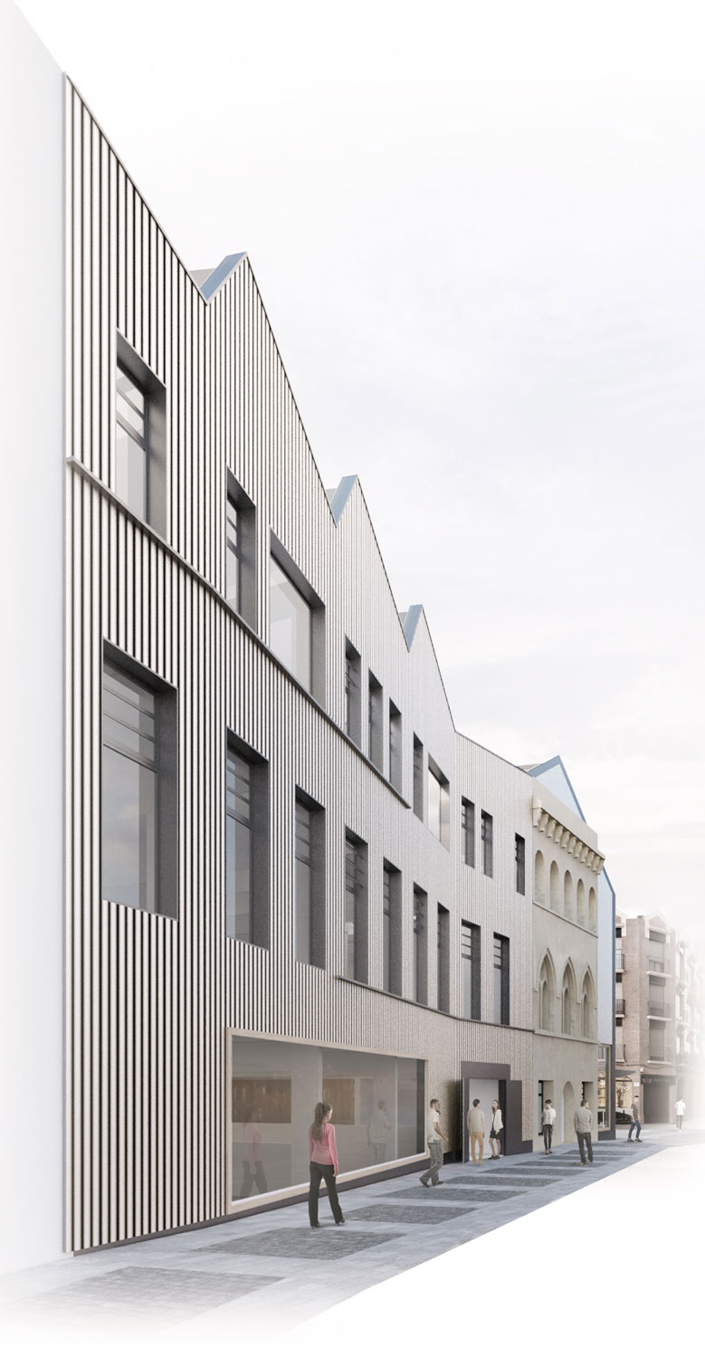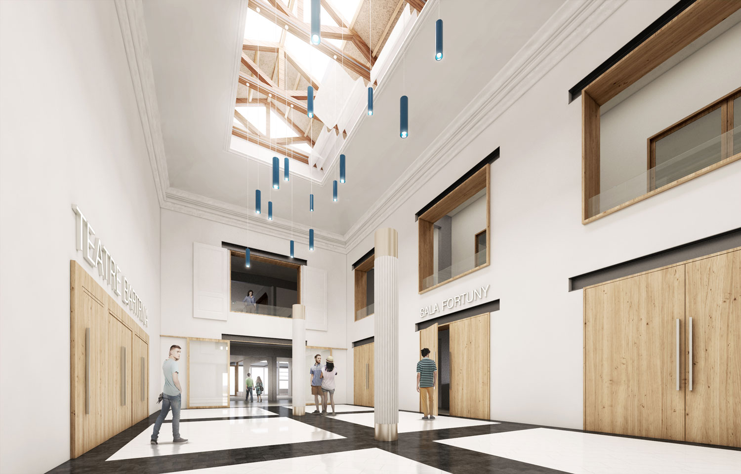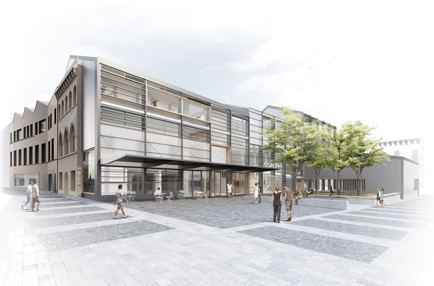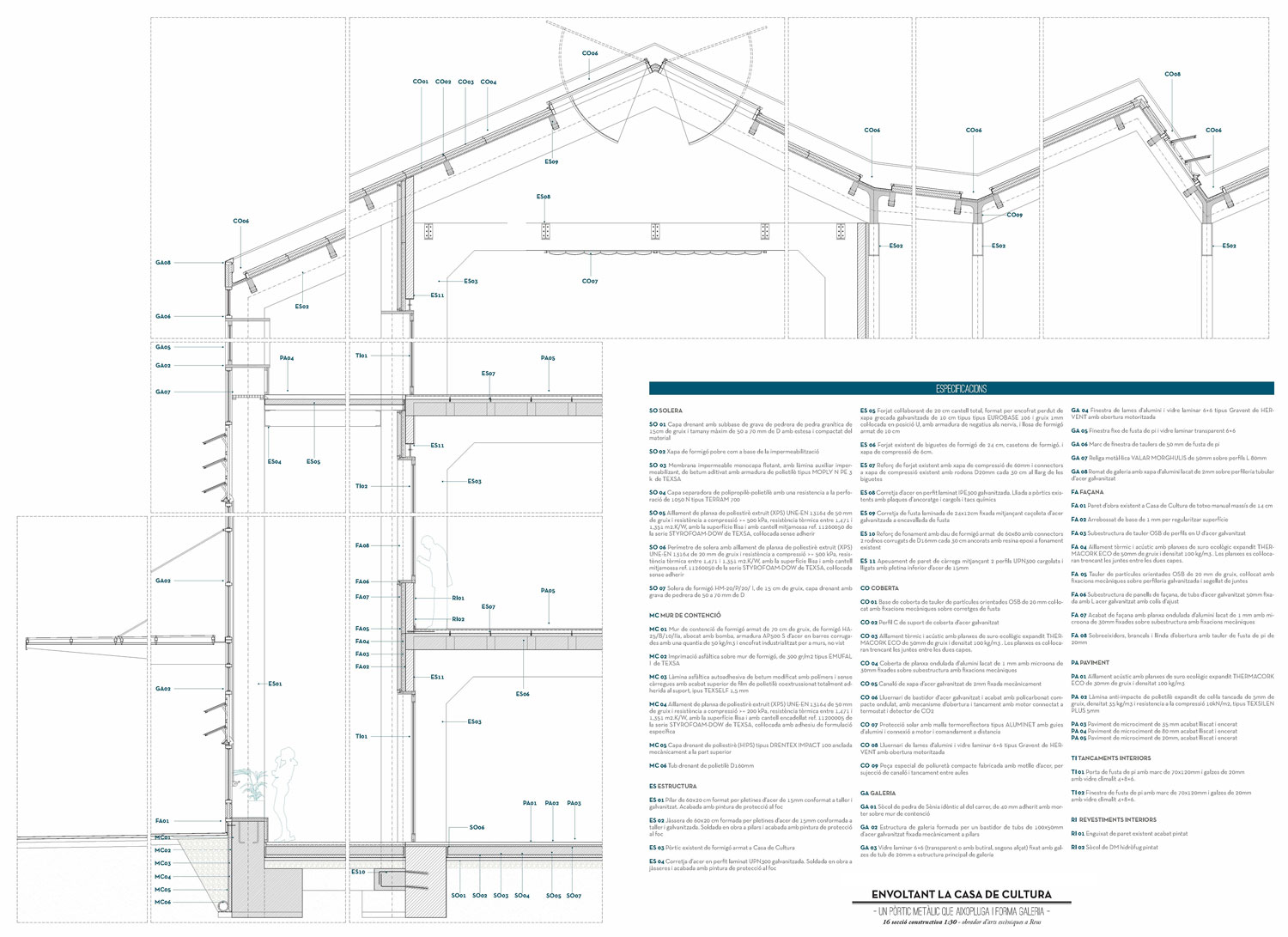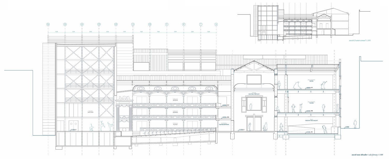 A new passage merges the historical entrance of the center and the new one placed in the Theater Square, creating a visual and physical connection between the main street and the renovated square in the ground floor. The passage also links the two main restored halls of the theater and it is also the nexus for the entire public program: a new cafeteria, the information point, the box office for the theater and the new multi-functional space. The proposed structural steel frames and the sloped roofs contain the new theater and dance practice studios in the upper floors. The 4 meter wide gallery wraps the existing backstage theater building and the ‘Culture House’ party wall creating a new circulation space which allocates the stairs and ramps that join the different section of the existing buildings, and also generates a new representative glass facade in the Theatre Square. The intervention ends with the new volume between the ‘Culture House’ and a residential building in Concepció street. This northern facade has more inertia, its openings are rhythmic empathizing with the ‘Culture House’ composition and it is materialized in a wavy corrugated aluminum panel. The project’s identity aims to boost the relationship between the public space, the people and the Center for the performing arts, building a strong synergy and invigorating its social character.