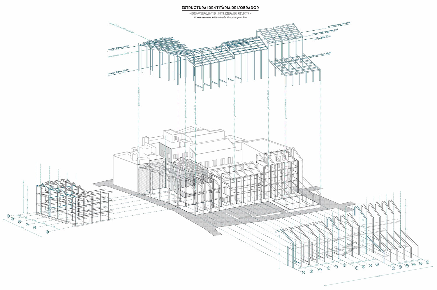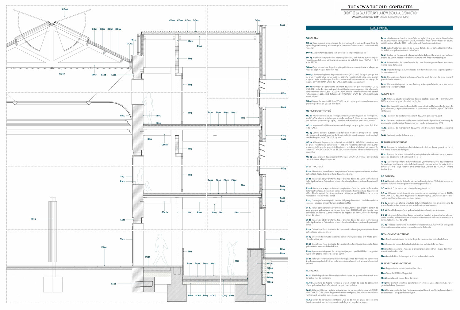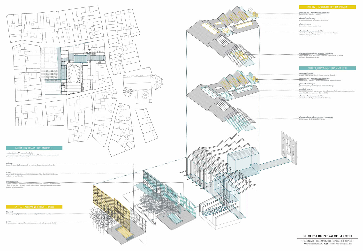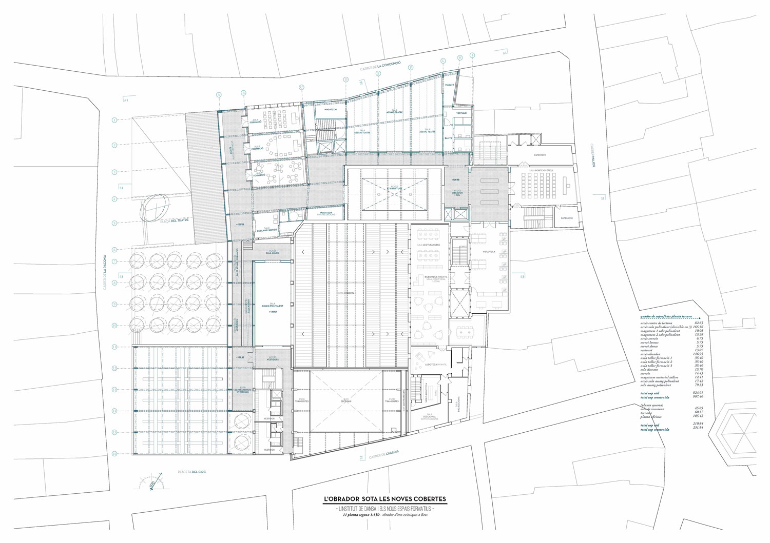 A new passage merges the historical entrance of the center and the new one placed in the Theater Square, creating a visual and physical connection between the main street and the renovated square in the ground floor. The passage also links the two main restored halls of the theater and it is also the nexus for the entire public program: a new cafeteria, the information point, the box office for the theater and the new multi-functional space. The proposed structural steel frames and the sloped roofs contain the new theater and dance practice studios in the upper floors. The 4 meter wide gallery wraps the existing backstage theater building and the ‘Culture House’ party wall creating a new circulation space which allocates the stairs and ramps that join the different section of the existing buildings, and also generates a new representative glass facade in the Theatre Square. The intervention ends with the new volume between the ‘Culture House’ and a residential building in Concepció street. This northern facade has more inertia, its openings are rhythmic empathizing with the ‘Culture House’ composition and it is materialized in a wavy corrugated aluminum panel. The project’s identity aims to boost the relationship between the public space, the people and the Center for the performing arts, building a strong synergy and invigorating its social character.