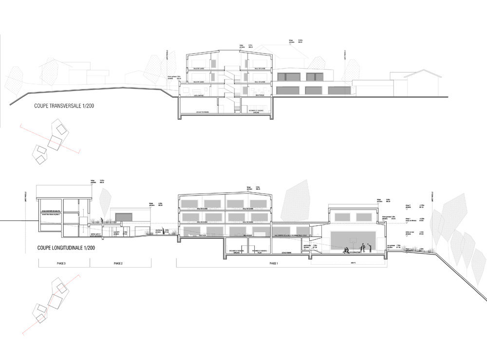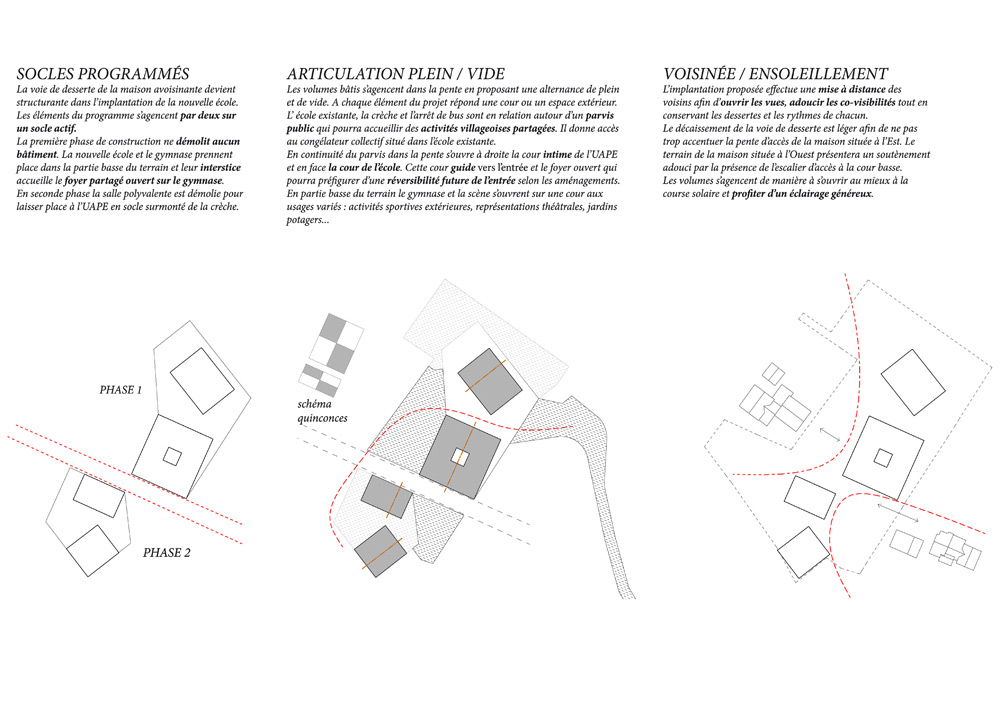 Les éléments du programme s’agencent par deux sur un socle actif. La première phase de construction ne démolit aucun bâtiment. La nouvelle école et le gymnase prennent place dans la partie basse du terrain et leur interstice accueille le foyer partagé ouvert sur le gymnase. En seconde phase la salle polyvalente est démolie pour laisser place à l’UAPE en socle surmonté de la crèche.