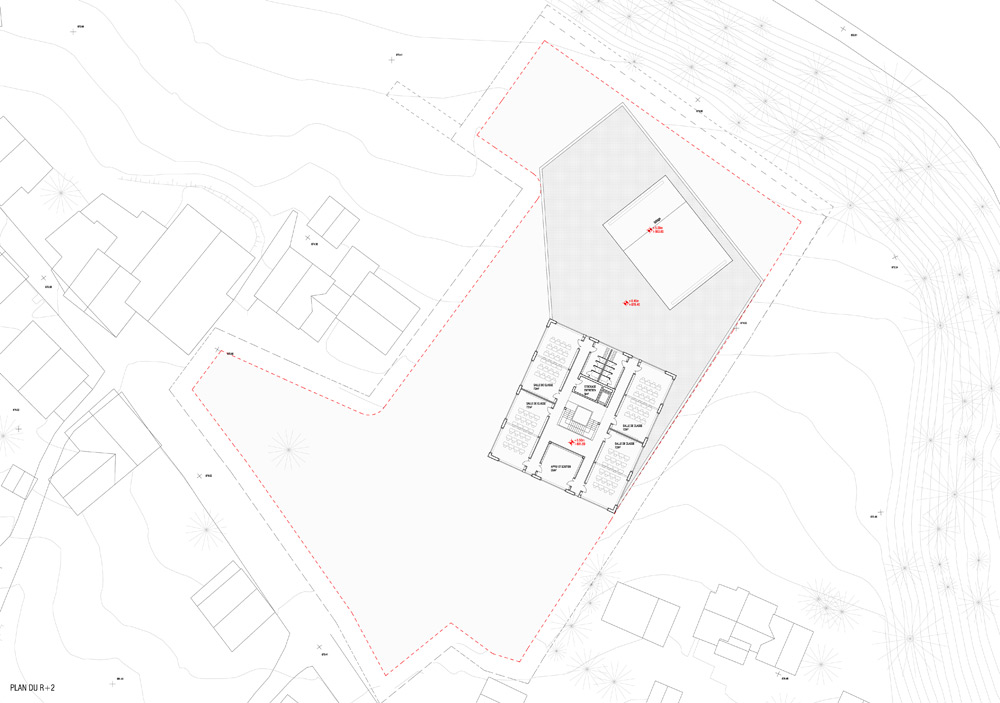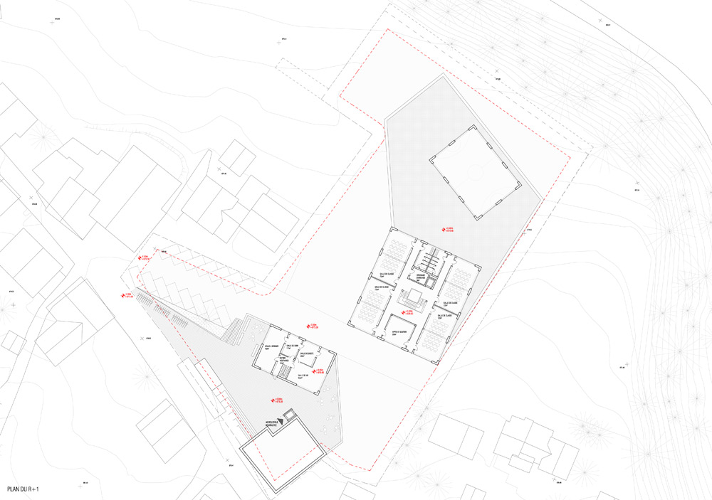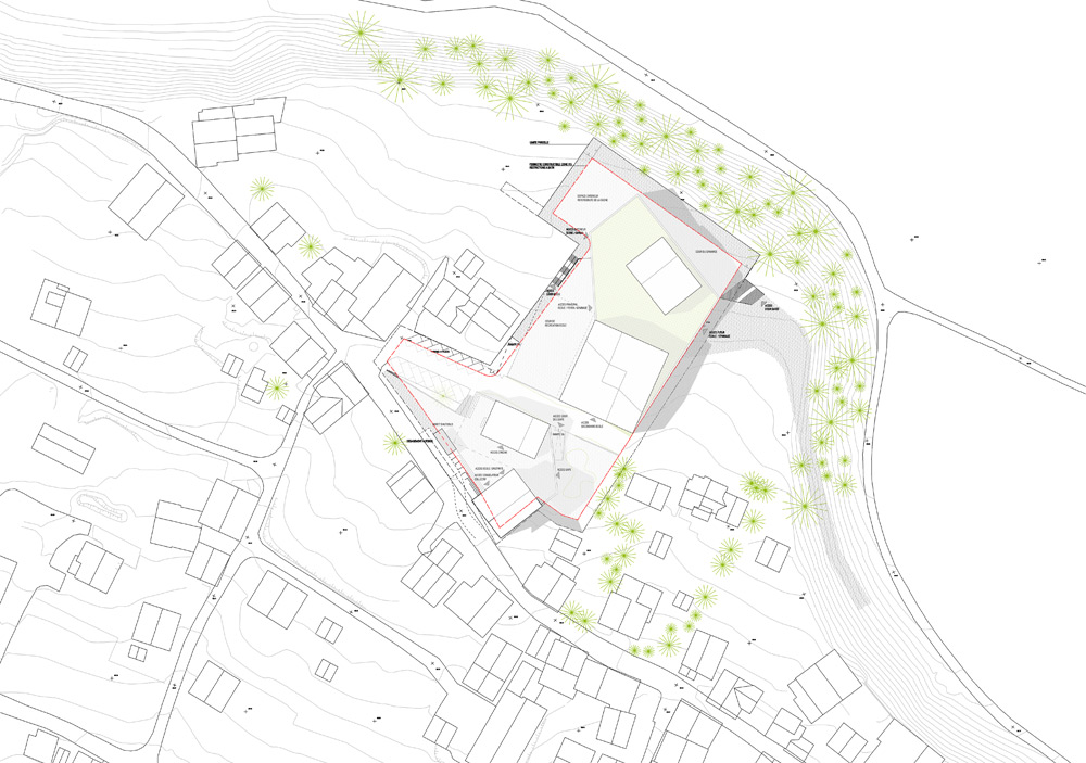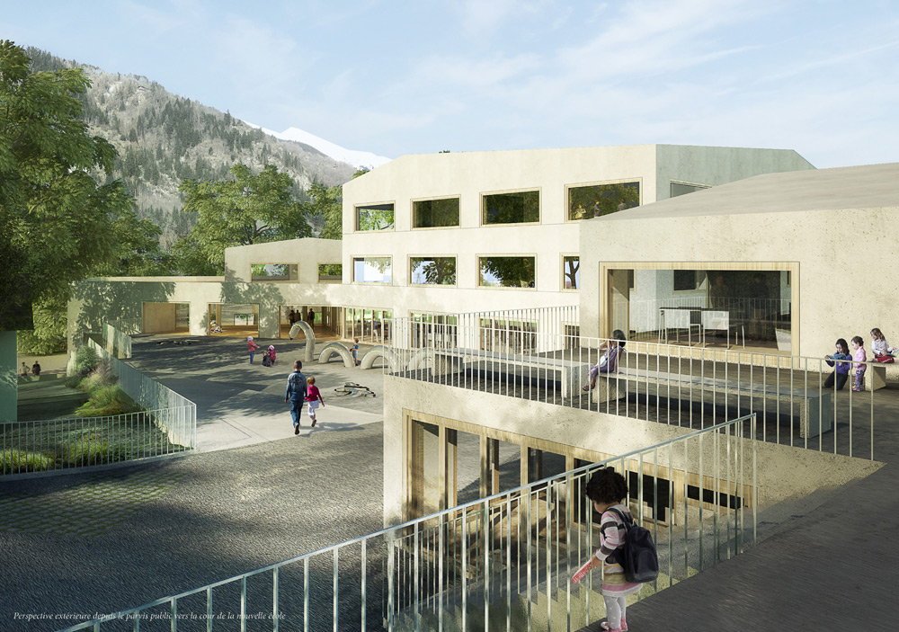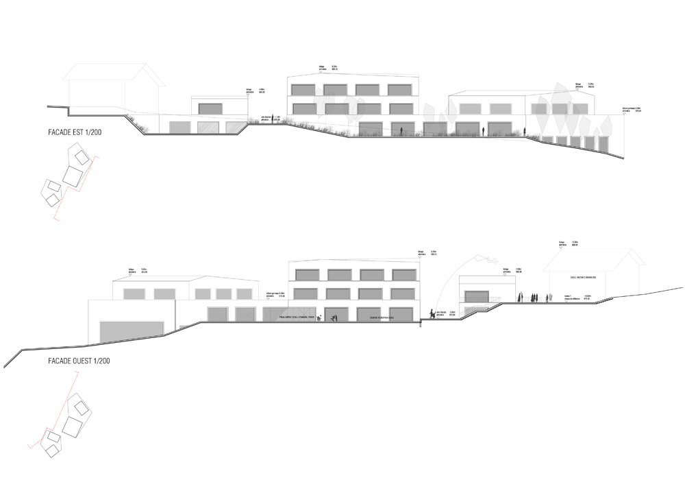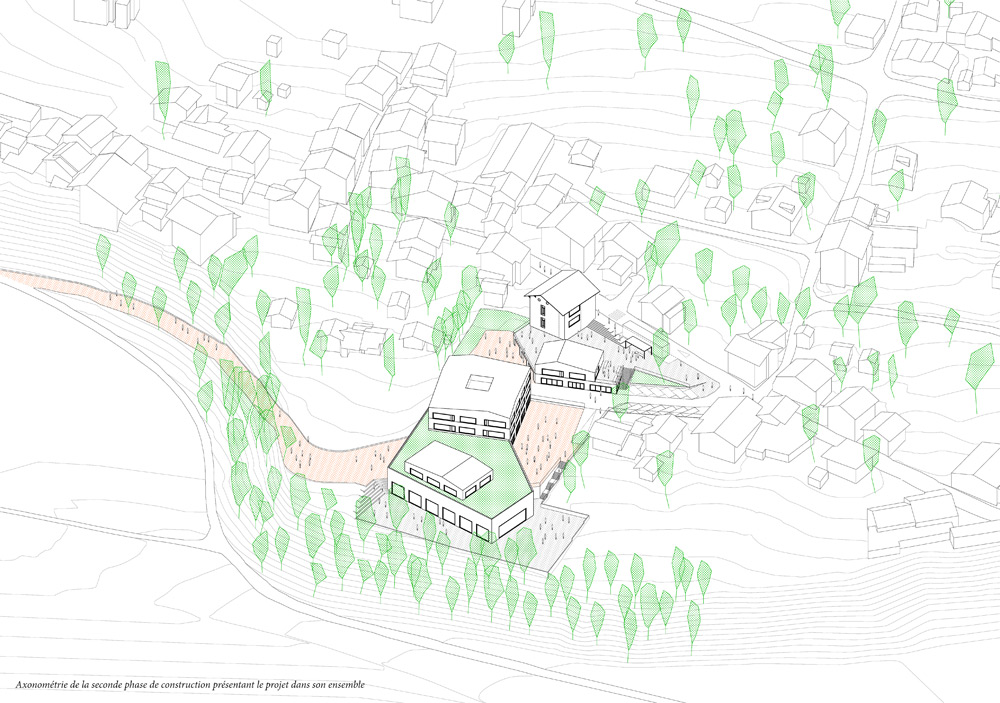 Les volumes bâtis s’agencent dans la pente en proposant une alternance de plein et de vide. A chaque élément du projet répond une cour ou un espace extérieur. L’ école existante, la crèche et l’arrêt de bus sont en relation autour d’un parvis public qui pourra accueillir des activités villageoises partagées. Il donne accès au congélateur collectif situé dans l’école existante. En continuité du parvis dans la pente s’ouvre à droite la cour intime de l’UAPE et en face la cour de l’école. Cette cour guide vers l’entrée et le foyer ouvert qui pourra préfigurer d’une réversibilité future de l’entrée selon les aménagements. En partie basse du terrain le gymnase et la scène s’ouvrent sur une cour aux usages variés : activités sportives extérieures, représentations théâtrales, jardins potagers…