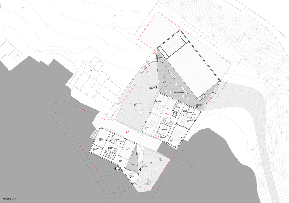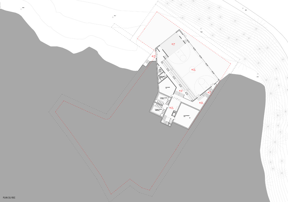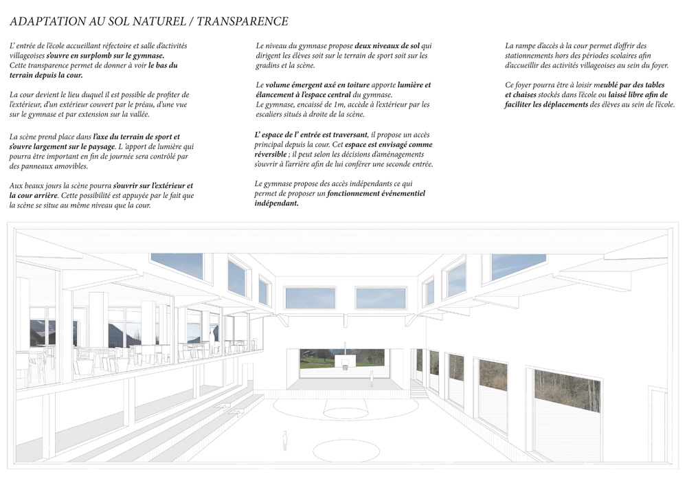 L’ entrée de l’école accueillant réfectoire et salle d’activités villageoises s’ouvre en surplomb sur le gymnase. Cette transparence permet de donner à voir le bas du terrain depuis la cour. La cour devient le lieu duquel il est possible de profiter de l’extérieur, d’un extérieur couvert par le préau, d’une vue sur le gymnase et par extension sur la vallée. La scène prend place dans l’axe du terrain de sport et s’ouvre largement sur le paysage. L ’apport de lumière qui pourra être important en fin de journée sera contrôlé par des panneaux amovibles. Aux beaux jours la scène pourra s’ouvrir sur l’extérieur et la cour arrière. Cette possibilité est appuyée par le fait que la scène se situe au même niveau que la cour.