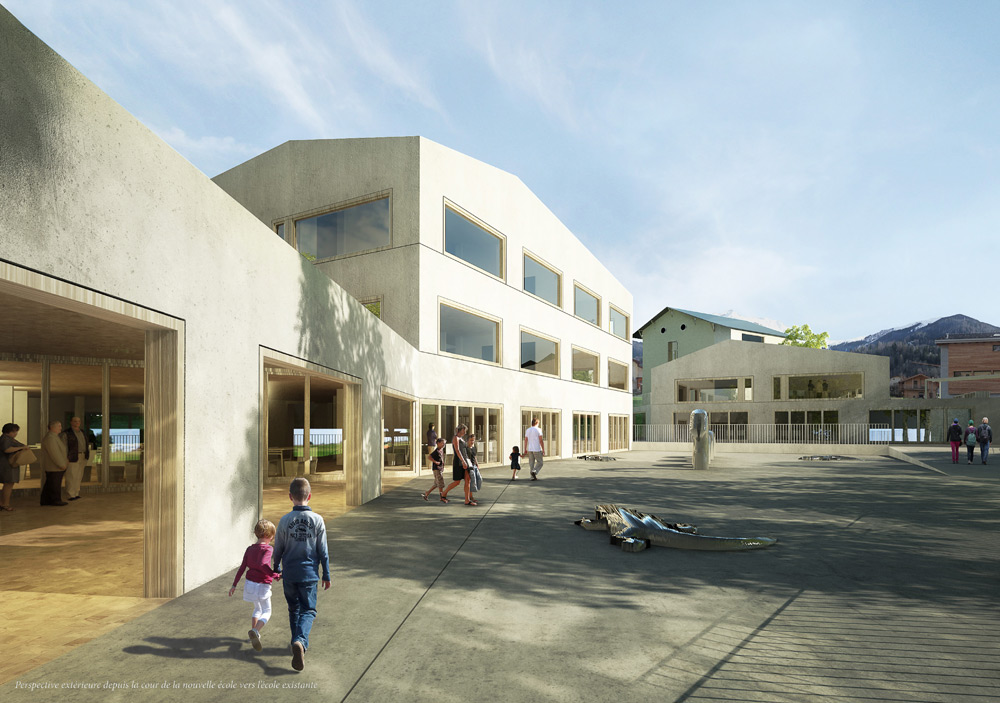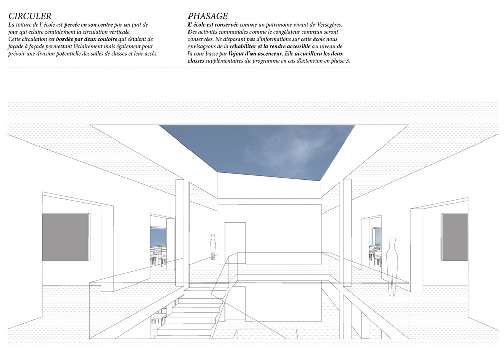 L’ école est conservée comme un patrimoine vivant de Versegères. Des activités communales comme le congélateur commun seront conservées. Ne disposant pas d’informations sur cette école nous envisageons de la réhabiliter et la rendre accessible au niveau de la cour basse par l’ajout d’un ascenceur. Elle accueillera les deux classes supplémentaires du programme en cas d’extension en phase 3.
