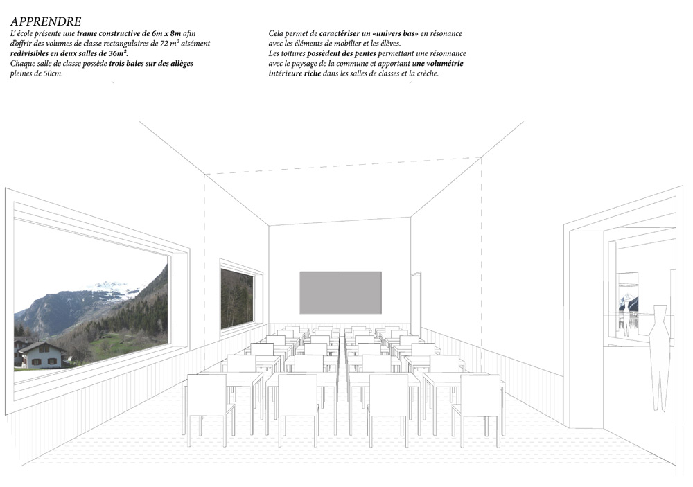 L’ école présente une trame constructive de 6m x 8m afin d’offrir des volumes de classe rectangulaires de 72 m² aisément redivisibles en deux salles de 36m². Chaque salle de classe possède trois baies sur des allèges pleines de 50cm. Cela permet de caractériser un «univers bas» en résonance avec les éléments de mobilier et les élèves. Les toitures possèdent des pentes permettant une résonance avec le paysage de la commune et apportant une volumétrie intérieure riche dans les salles de classes et la crèche.