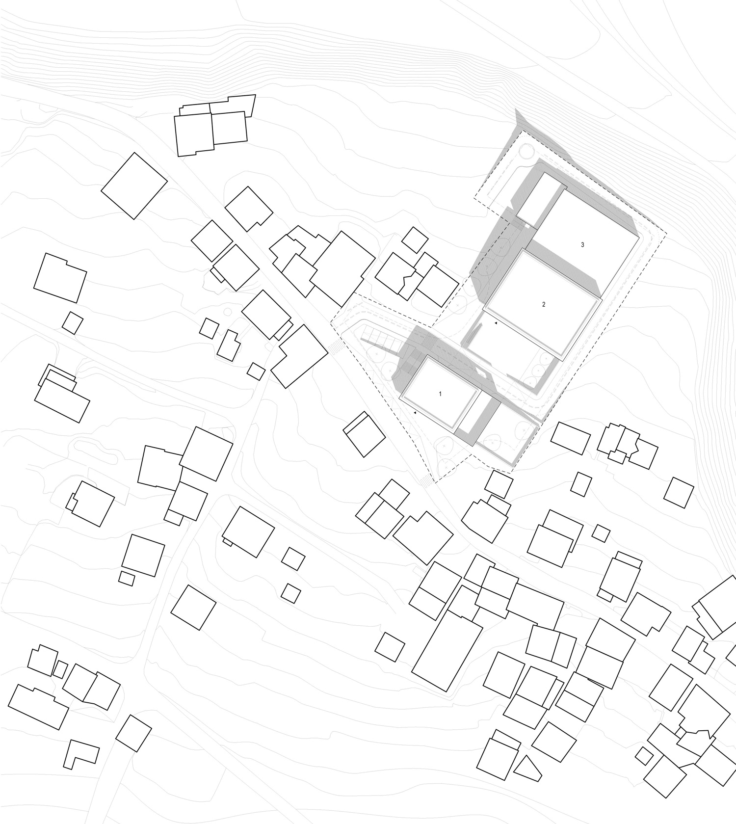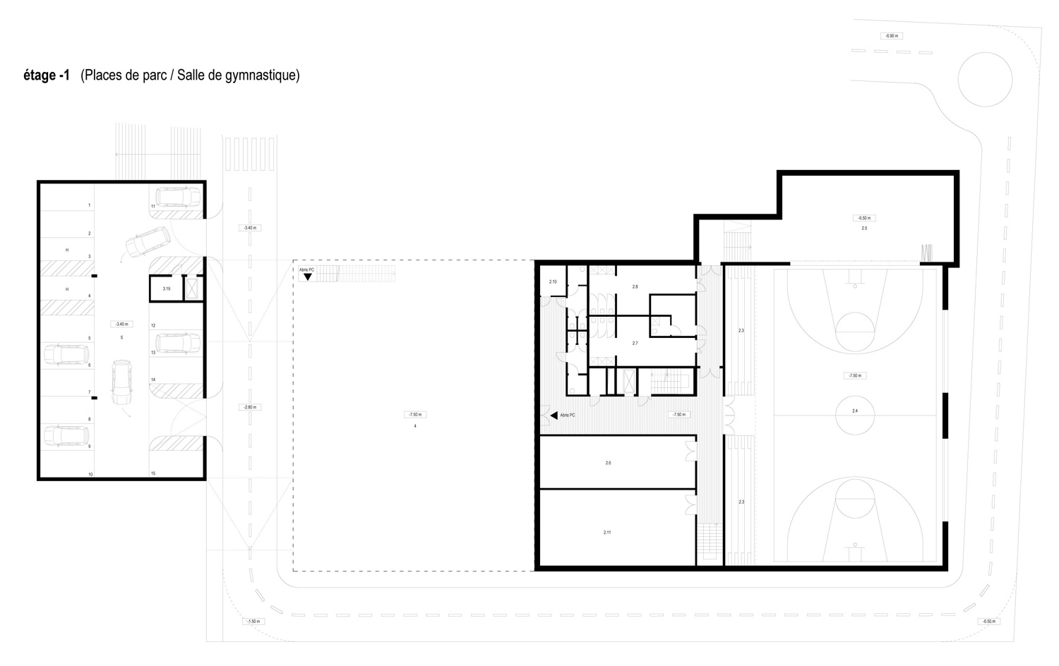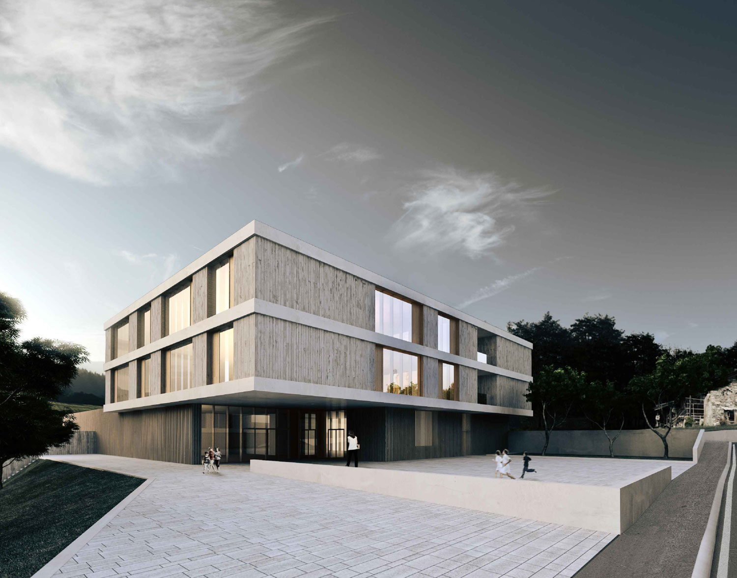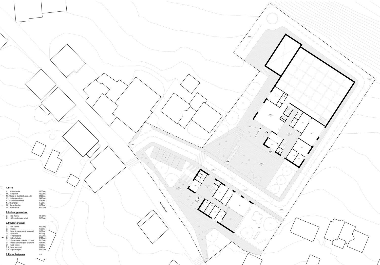Le plan de masse est clair et bien définit : la mise en place d’une voie de circulation à l’intérieur et à l’extérieur du site garantit l’accès à toutes les parcelles limitrophes; la création de deux arrêts de bus le long de la route de mauvoisin et de six places de stationnement temporaire. D’un point de vue morphologique, le projet cherche à s’insérer dans le paysage existant en s’adaptant à les aux caractéristiques du terrain pour en diminuer l’impact visuel au sein du village. La cours de récréation (400 m²), peut être utilisée comme un lieu de stationnement pour les activités extra-scolaires. Depuis une entrée couverte par un grand haut-vent on accède aux salles et aux différentes fonctions de l’école; pendant les heures d’activités extra-scolaires, on peut également accéder à la salle de sport et aux vestiaires situés au sous-sol. Les différentes fonctions sont clairement définies et reconnaissables du point de vue de la répartition des volumes. Ainsi que par le choix des matériaux utilisés: