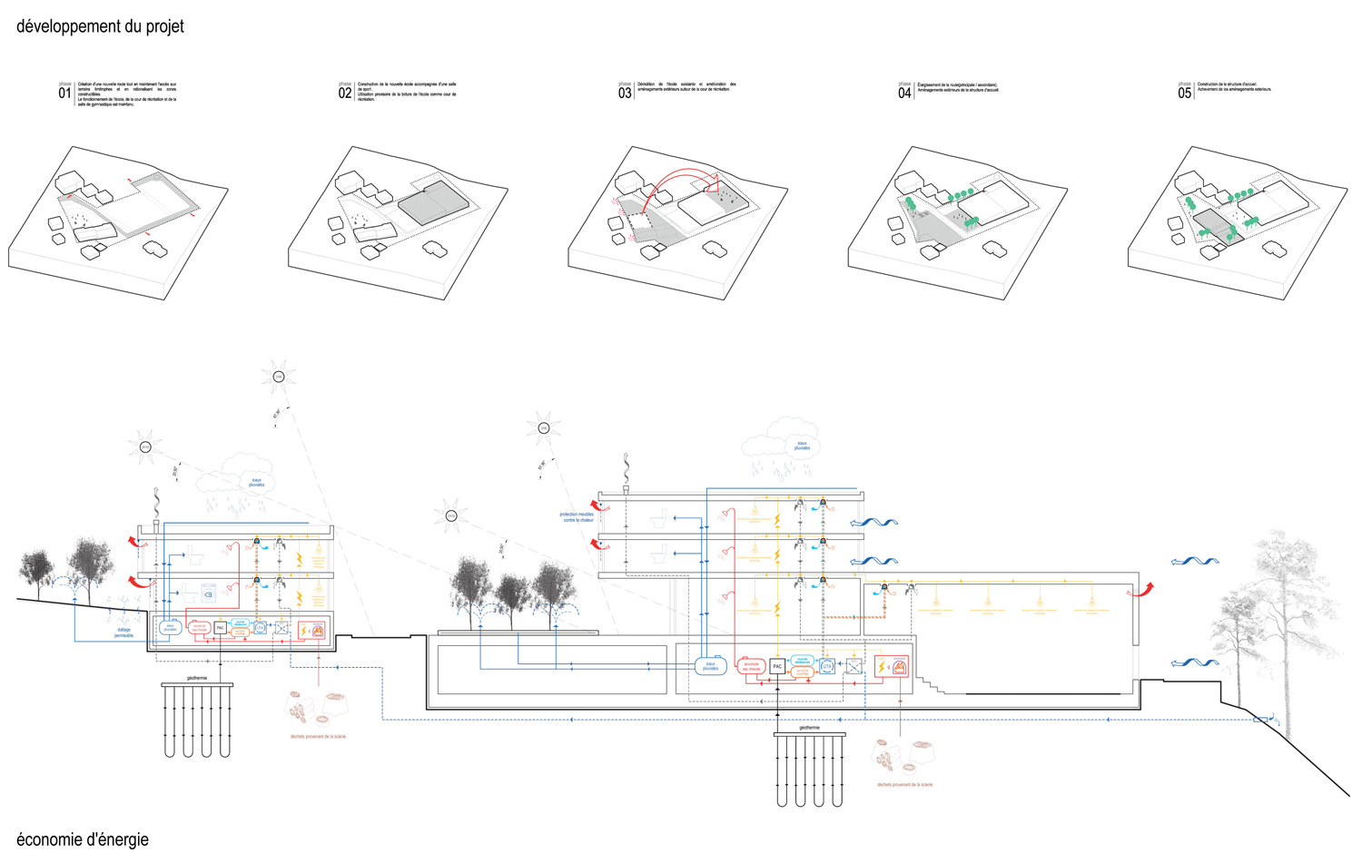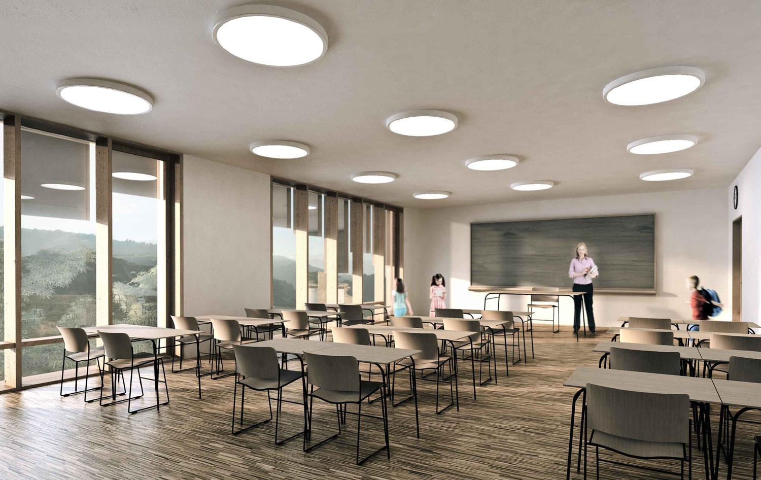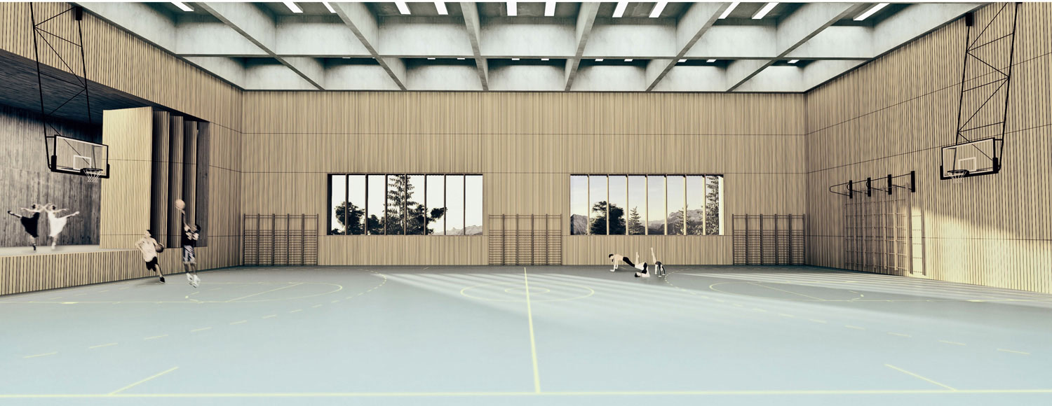 La distribution de ces étages a été pensée pour éliminer de les longs couloirs, tout en privilégiant l’interaction entre l’intérieur et l’extérieur du bâtiment par de grandes baies vitrées. La salle de sport est éclairée par de grandes ouvertures orientées au nord de façon à garantir une lumière constante mais non directe. Pour la structure en couverture un caisson en béton avait été envisagé pour anticiper un futur agrandissement de l’école. dans l’édifice destiné à la structure d’accueil : le rez-de-chaussée regroupe le réfectoire et des salles d’activités reliés à un jardin couvert ; au premier étage, une grande terrasse protégée de la route et dédiée aux jeux, s’ouvre sur la montagne. Du point de vue énergétique, les bâtiments utilisent différentes technologies exigées par le label minergie: le système de chauffage réutilise et brûle le bois provenant des menuiseries alentours. Un système de sondes géothermiques puise son énergie et sa chaleur en profondeur pour tempérer les espaces internes. L’eau de pluie est récupérée et stockée pour être utiliser par le système d’irrigation et des eaux usées. Un système d’aération doté d’un procédé de récupération de la chaleur permettant de satisfaire les exigences relatives à l’aération contrôlée.