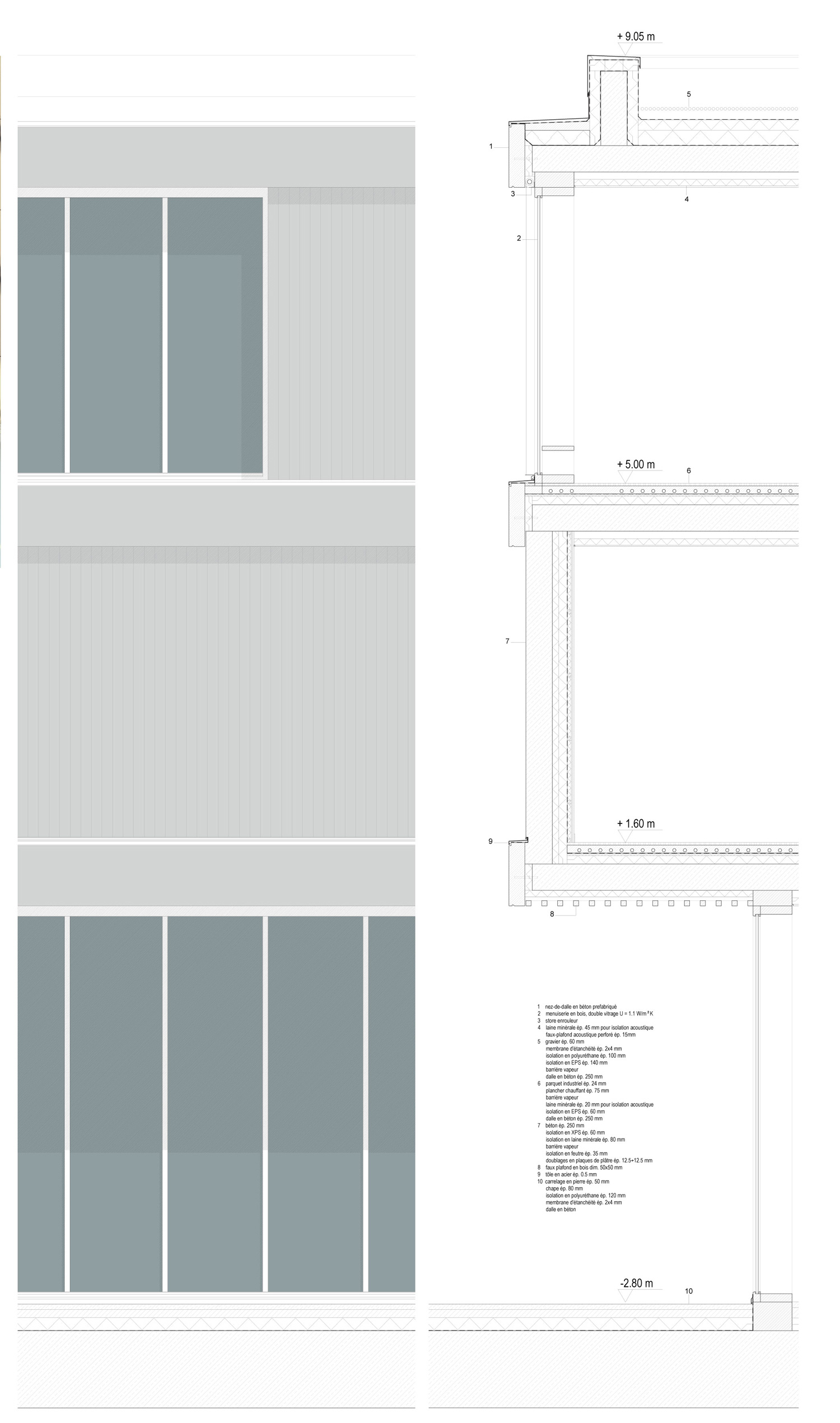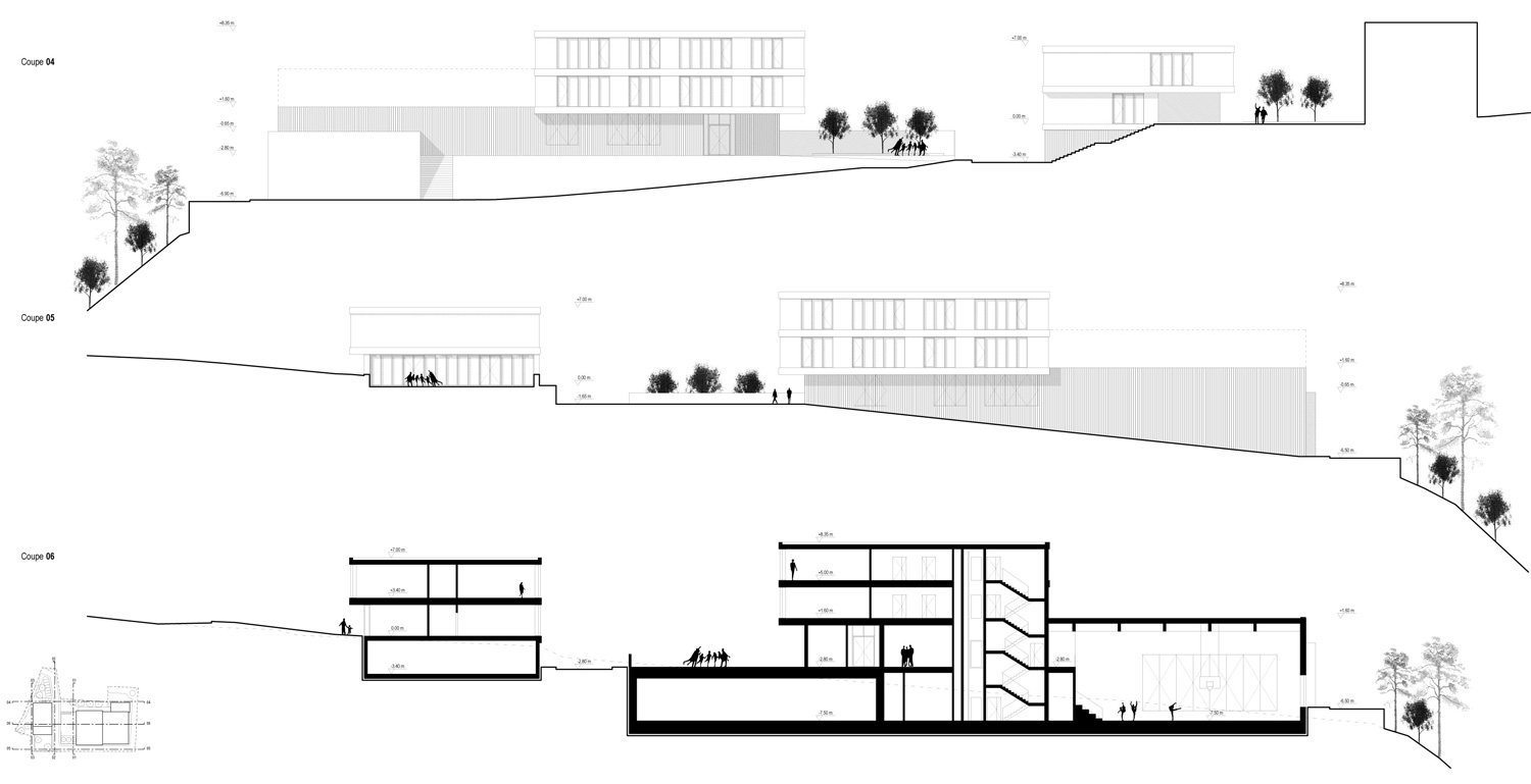 – Au rez-de-chaussée, on trouve toutes les lieux communs (salle de sport, vestiaires, scène du théâtre, hall) où l’utilisation du bois a été privilégiée;