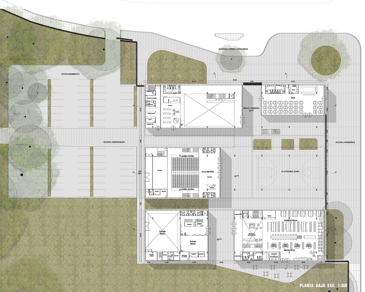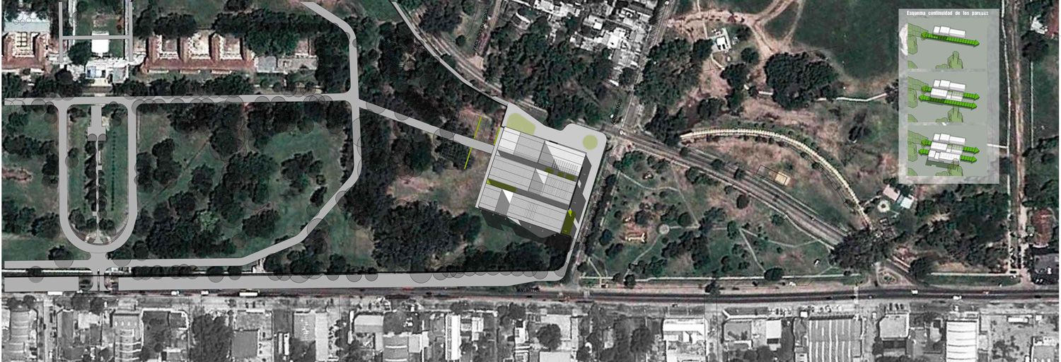 El crecimiento se desarrollará en tres grandes naves de 18m x 66m. Emplazadas de manera paralela a la calle Justo Daract. Los volúmenes se irán completando hacia la Av. Mitre. Esta secuencia de obra, el aire entre volúmenes y una baja ocupación en el cero del edificio garantiza que el total del proyecto no obstruya la continuidad del verde en relación a los parques de la universidad y las plazas Bujan y de las Familias. El proyecto propone un sistema de vinculaciones múltiples que combinaba los grandes paquetes programáticos propuestos de diversas maneras.