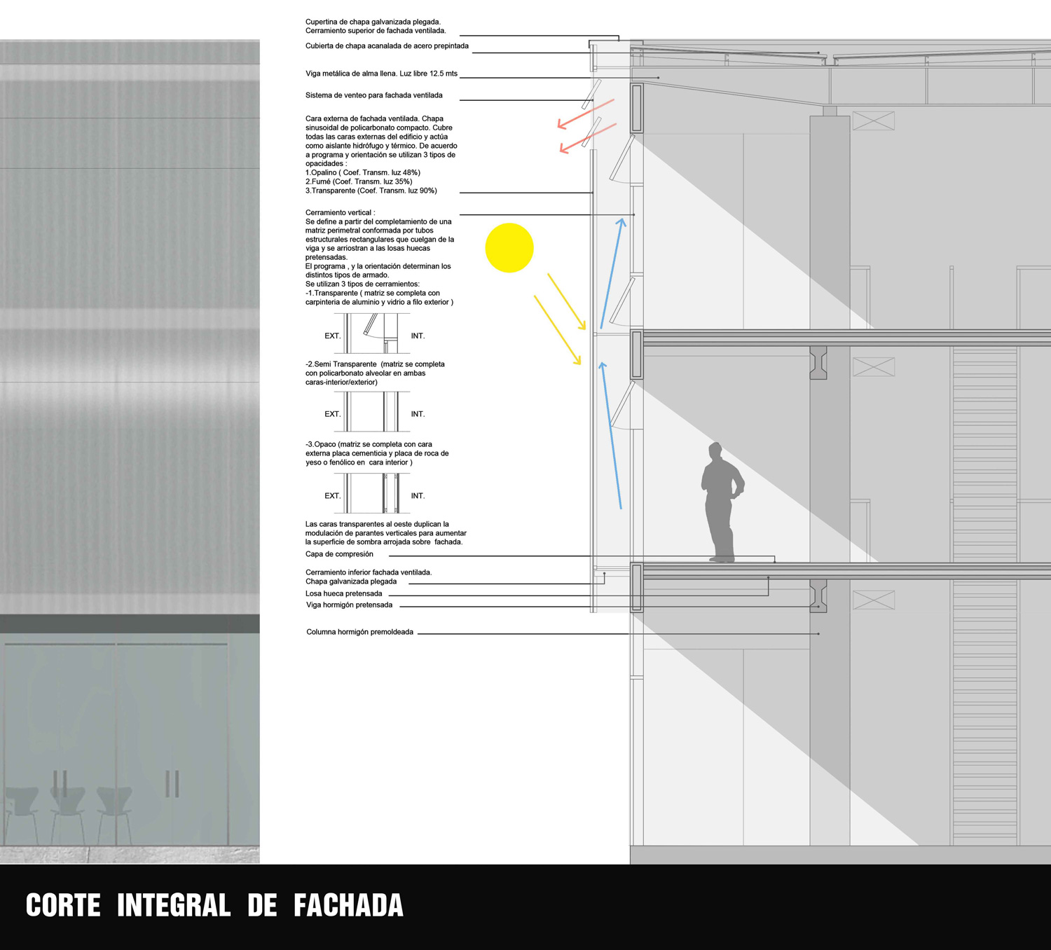 La viga de la techumbre será metálica de alma llena. De la misma cuelgan tensadas las distintas capas del cerramiento vertical. Estos fueron materializados con estructuras metálicas y sistemas de paneles modulares. Cuentan con distintas capas, que atienden distintas solicitaciones climáticas. Respondiendo diferenciadamente a las orientaciones solares, situaciones de promiscuidad, seguridad, visuales etcs. El cerramiento vertical se define a partir del completamiento de una matriz perimetral conformada por tubos estructurales rectangulares que cuelgan de la viga y se arriostran a las losas huecas pretensadas. El programa, y la orientación determinan los distintos tipos de armado. Se utilizan 3 tipos de cerramientos: