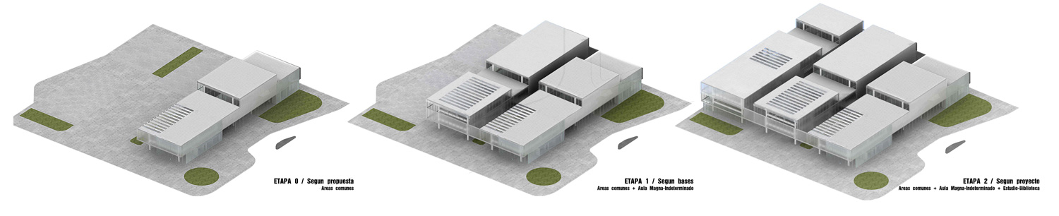 El problema de la forma previa como condicionante primigenia al proyecto y a la arquitectura no existe, porque todo es pura resultante. En este caso del programa, sus articulaciones varias, las condiciones sociales, ambientales, económicas y constructivas de la obra, la versatilidad y la apropiación de los espacios, son las variables que priman. A cada programa dado existe una respuesta específica, que se despliega dentro de un sistema constructivo genérico y estandarizado que facilita la etapabilidad de la obra. Los programas propuestos por las bases del concurso, ocupan la matriz espacial prevista. Pudiendo vincularse entre sí, en una amplia gama de posibilidades diferentes según los requerimientos del comitente en el tiempo.