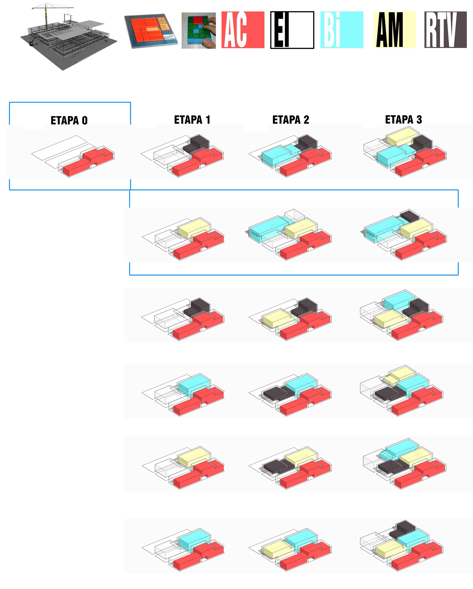– Etapa 0 : La primer nave construida permitente realizar una etapa previa a la primera planteada por bases. La misma agrupa a los usos generales y puede funcionar como un centro cultural en sí mismo.