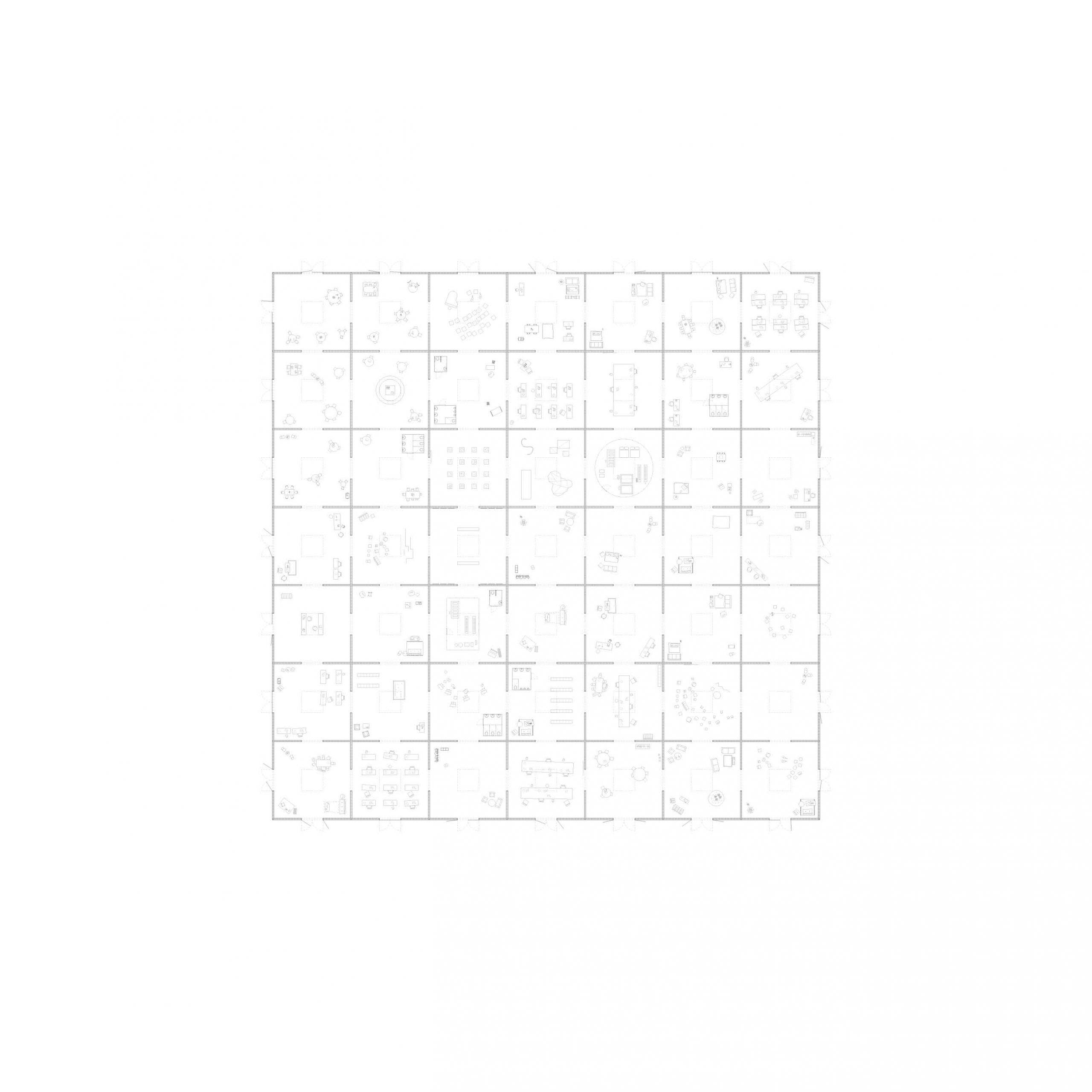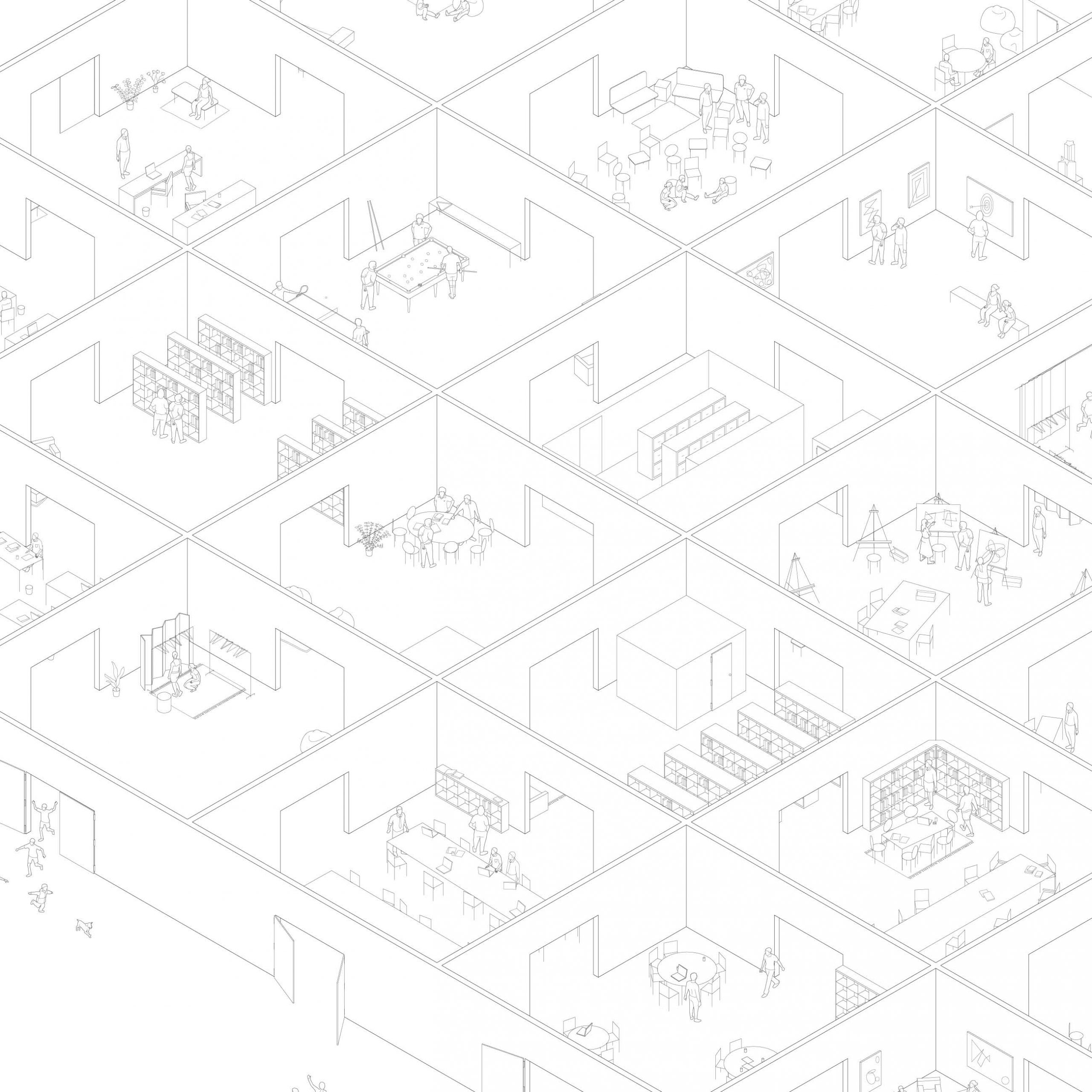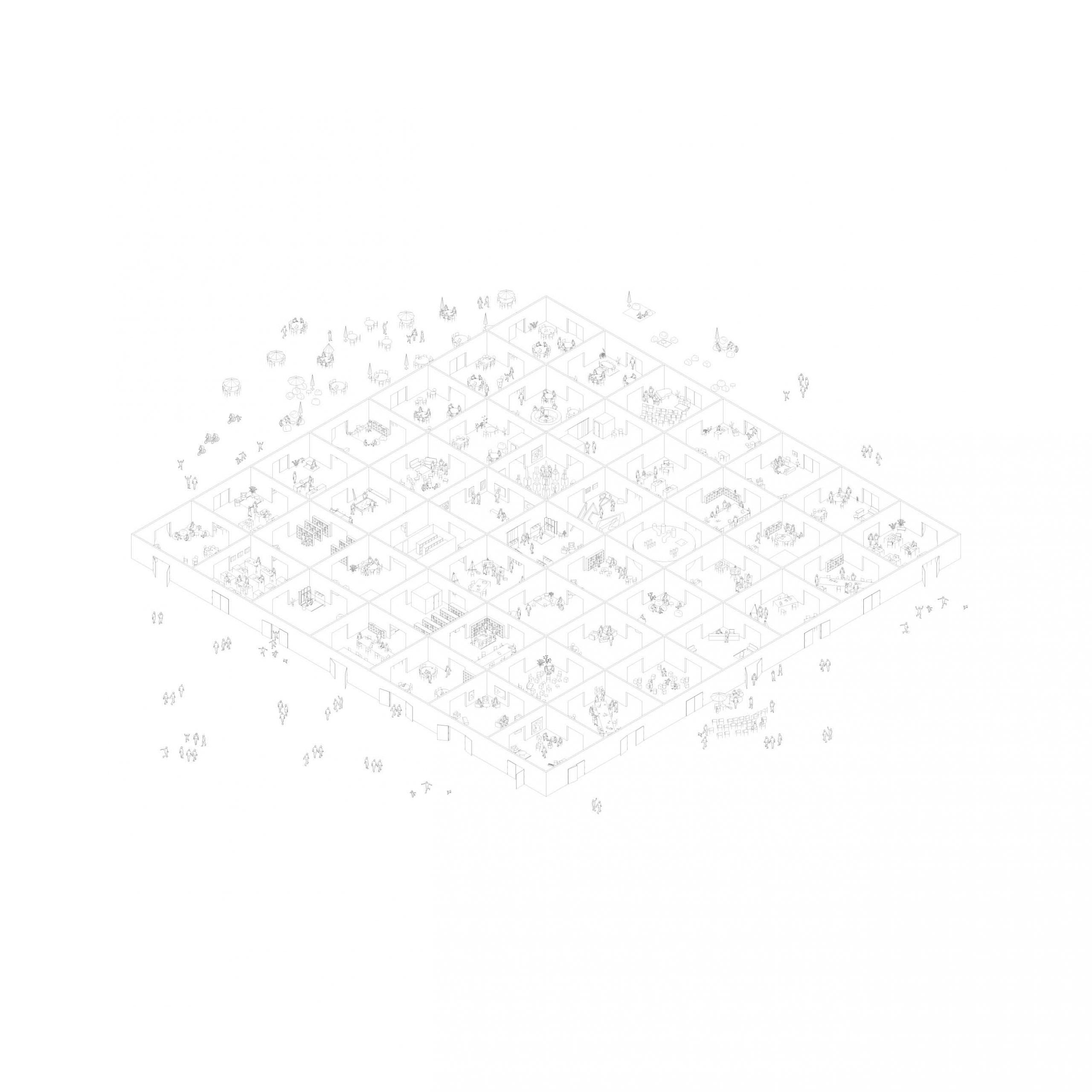 Proposing a neutral white volume for the reinosa cultural centre in spain, ‘lorem ipsum’ is a sequence of blank canvases. The square platform seeks to detach itself from the city’s past, redefining the surrounding square and opening its edges on all sides to establish a sense of flow through to the interior. The building itself contains 49 equal-sized rooms with various activities juxtaposed next to one another. The spaces within the uniform structure are identical and with no fixed limits – side by side one may find; exhibition areas, a nursery, a co-working zone or painting classes. The life of the building is a mirror of the city it inhabits, it is activated by the people, hoping to fulfill their many and different needs.