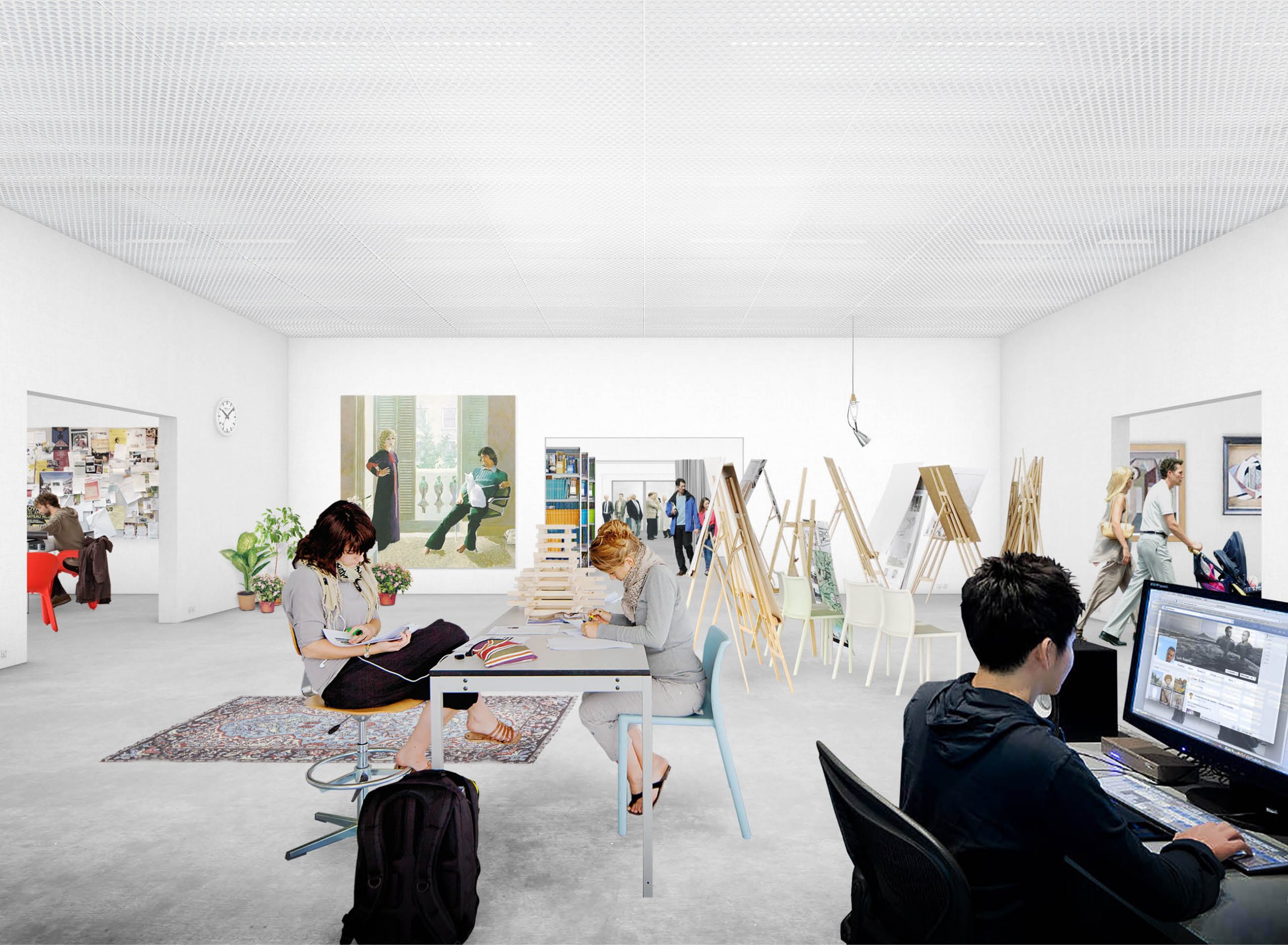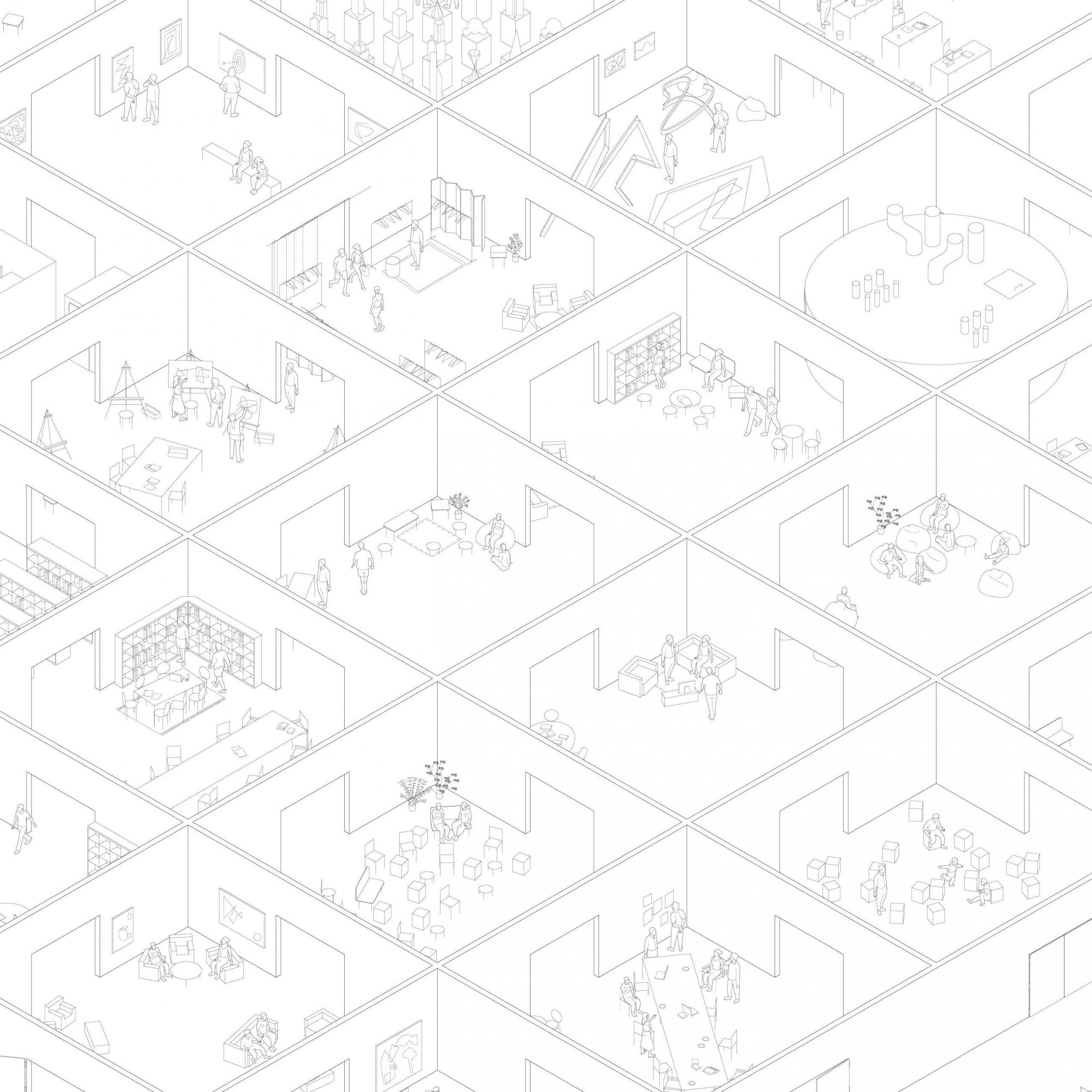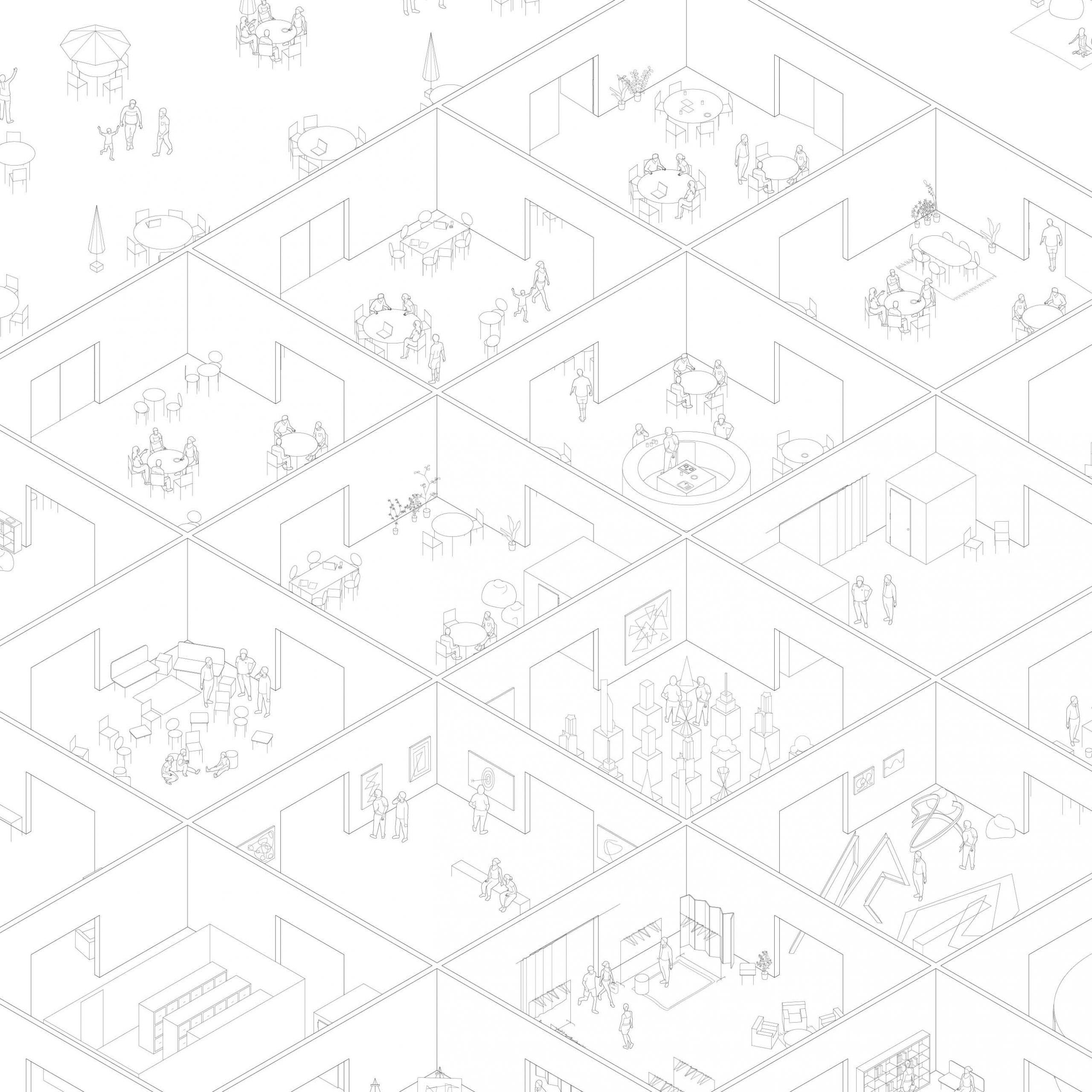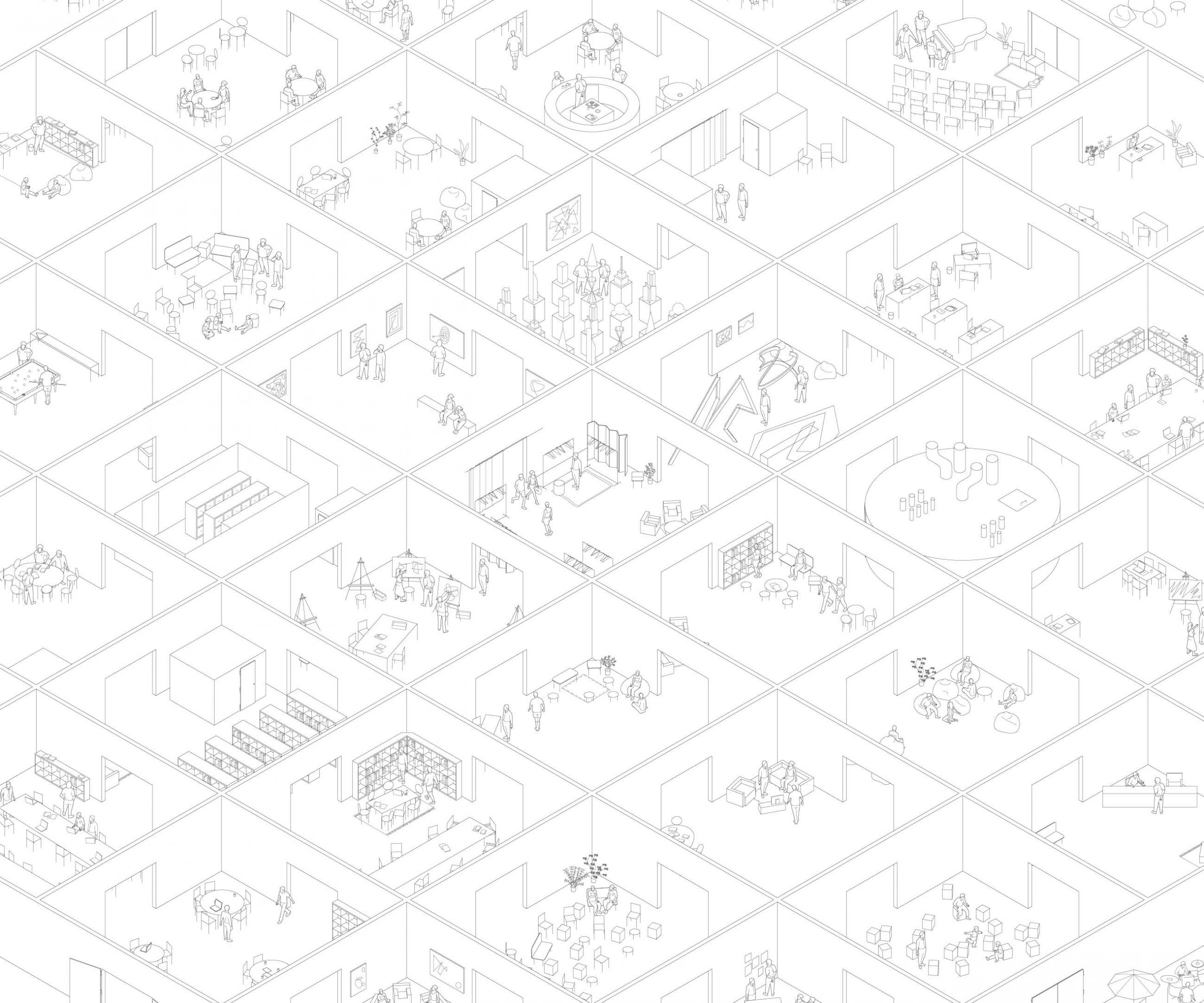 Proposing a neutral white volume for the reinosa cultural centre in spain, ‘lorem ipsum’ is a sequence of blank canvases. The square platform seeks to detach itself from the city’s past, redefining the surrounding square and opening its edges on all sides to establish a sense of flow through to the interior. The building itself contains 49 equal-sized rooms with various activities juxtaposed next to one another. The spaces within the uniform structure are identical and with no fixed limits – side by side one may find; exhibition areas, a nursery, a co-working zone or painting classes. The life of the building is a mirror of the city it inhabits, it is activated by the people, hoping to fulfill their many and different needs.