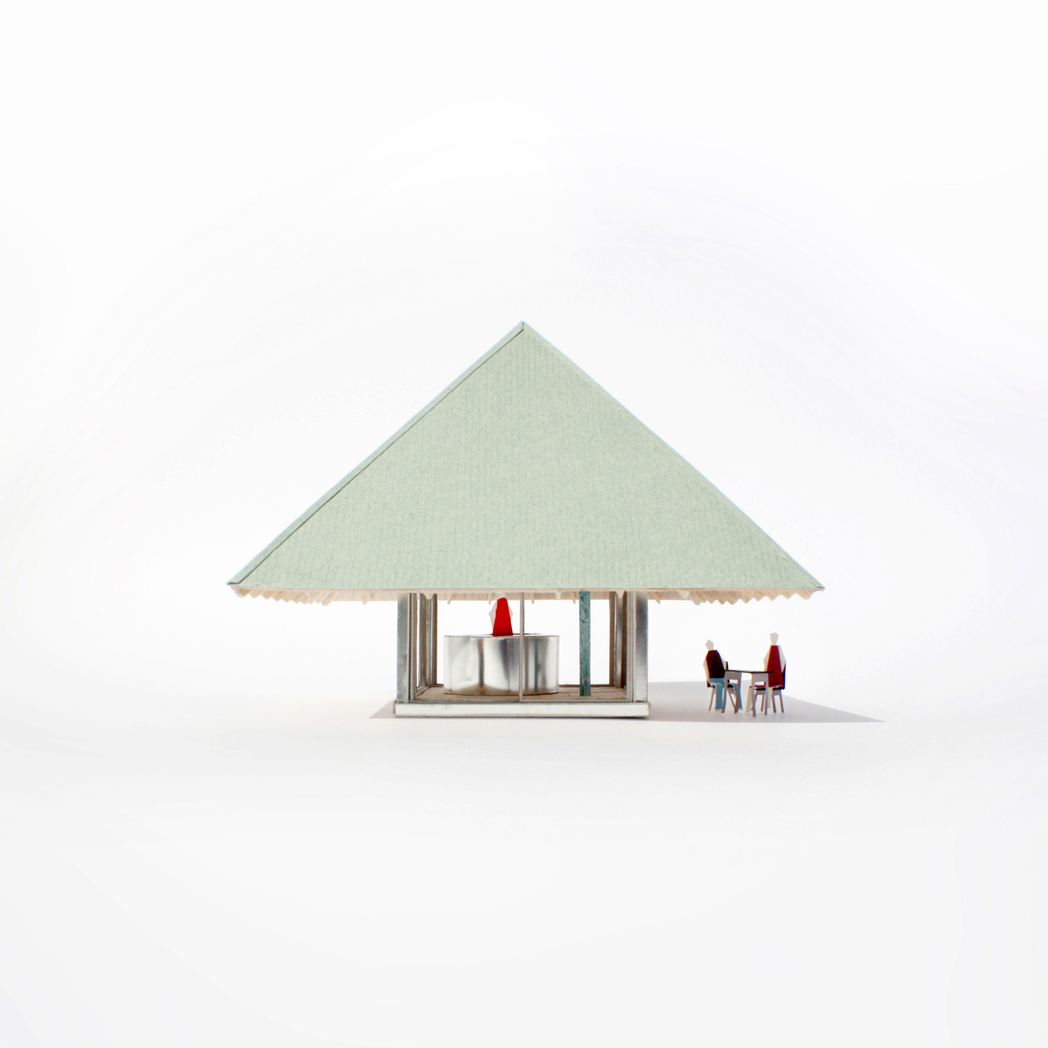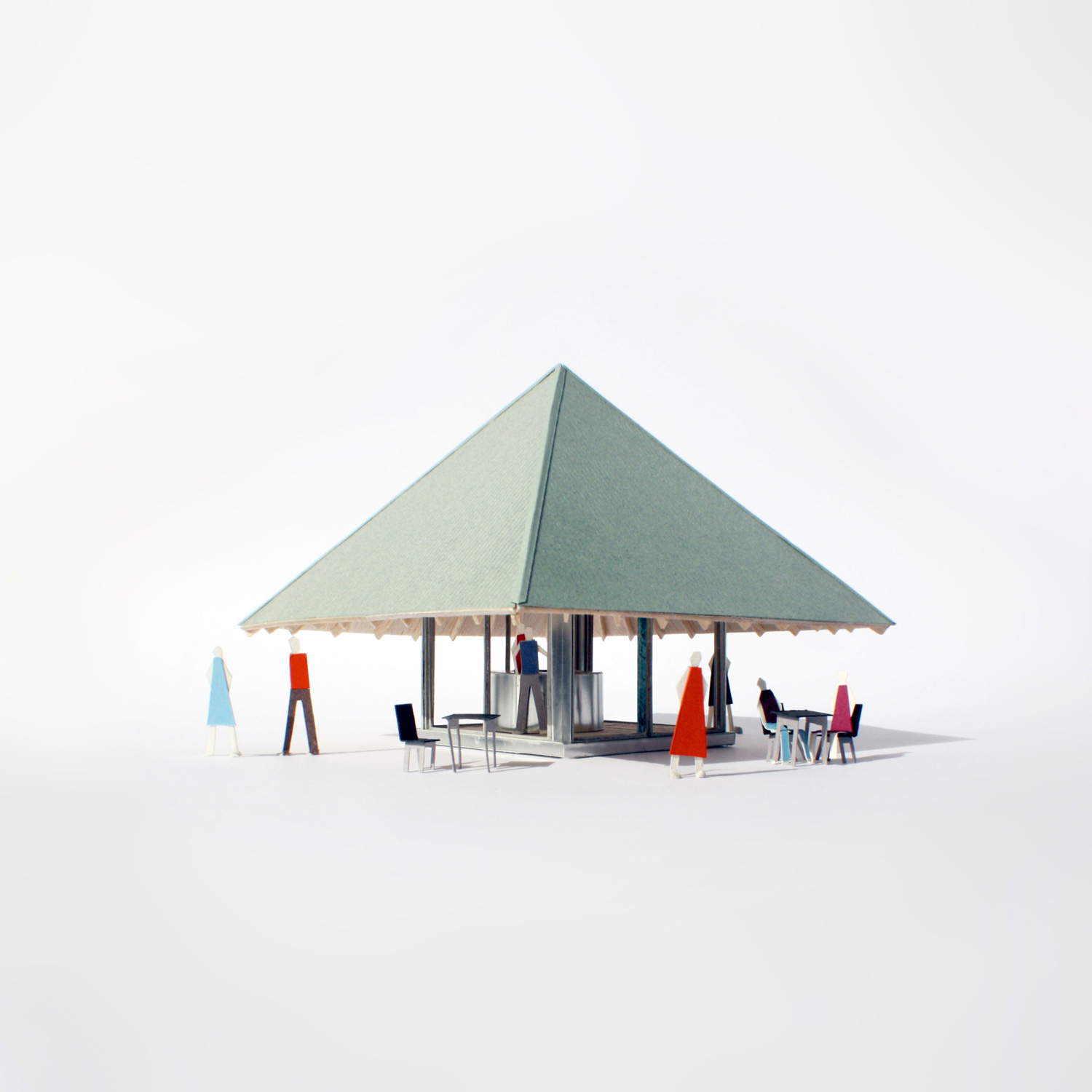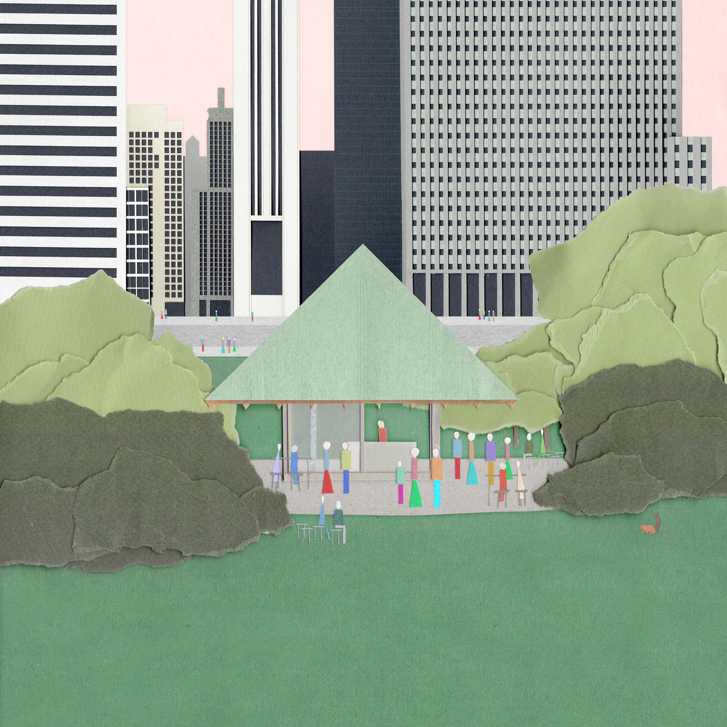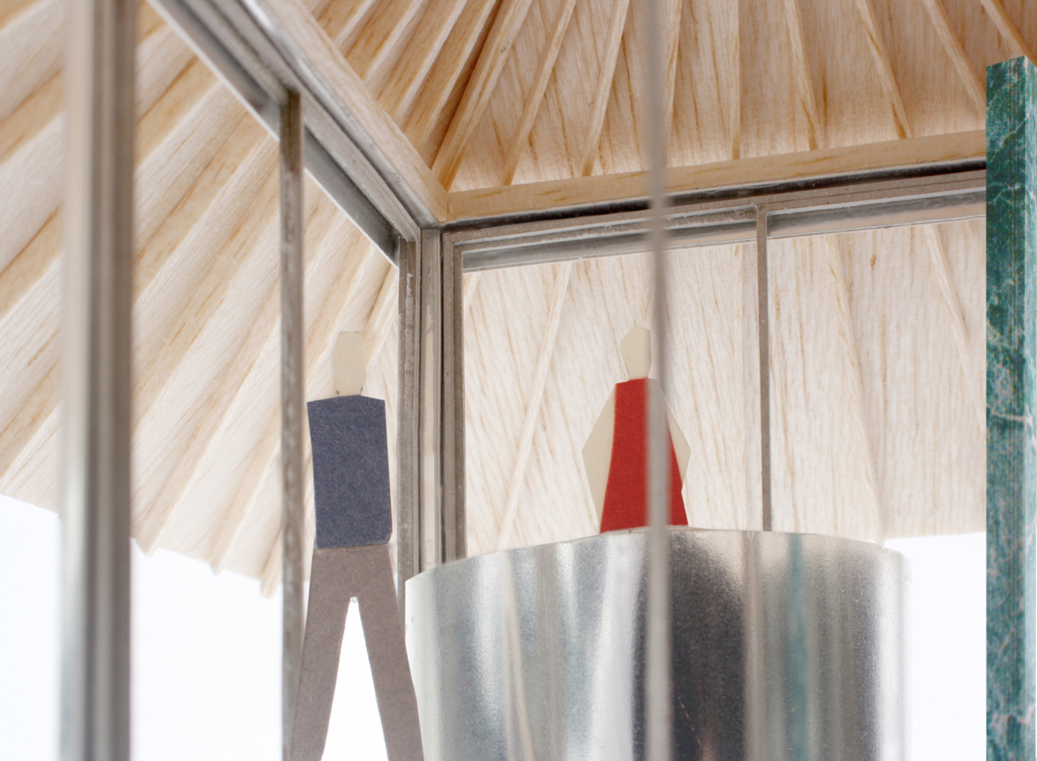 The ‘little kiosk artistically considered’ lives in limbo: it is an irrelevant monument. It is as much a kiosk as it is a proud piece of architecture. The ‘kiosk’ has a grand timber roof which recalls the sharp lines of Prairie architecture and underlines the vistas to the park and Lake Michigan. Under the roof, a glass box surprises with its verticality. It hosts all kinds of cultural and commercial programs, as well as a marble column. The ‘kiosk’ is made of familiar elements assembled in an unorthodox manner. It invites the visitor to reconsider its relationship to the city and to architecture as a necessarily referential discipline. Its architectural language is clear and honest: anyone can dismount and remount it, both literally and mentally, but its poetry lies in the fact that it never truly belongs. Like a child lost in a city of adults.
